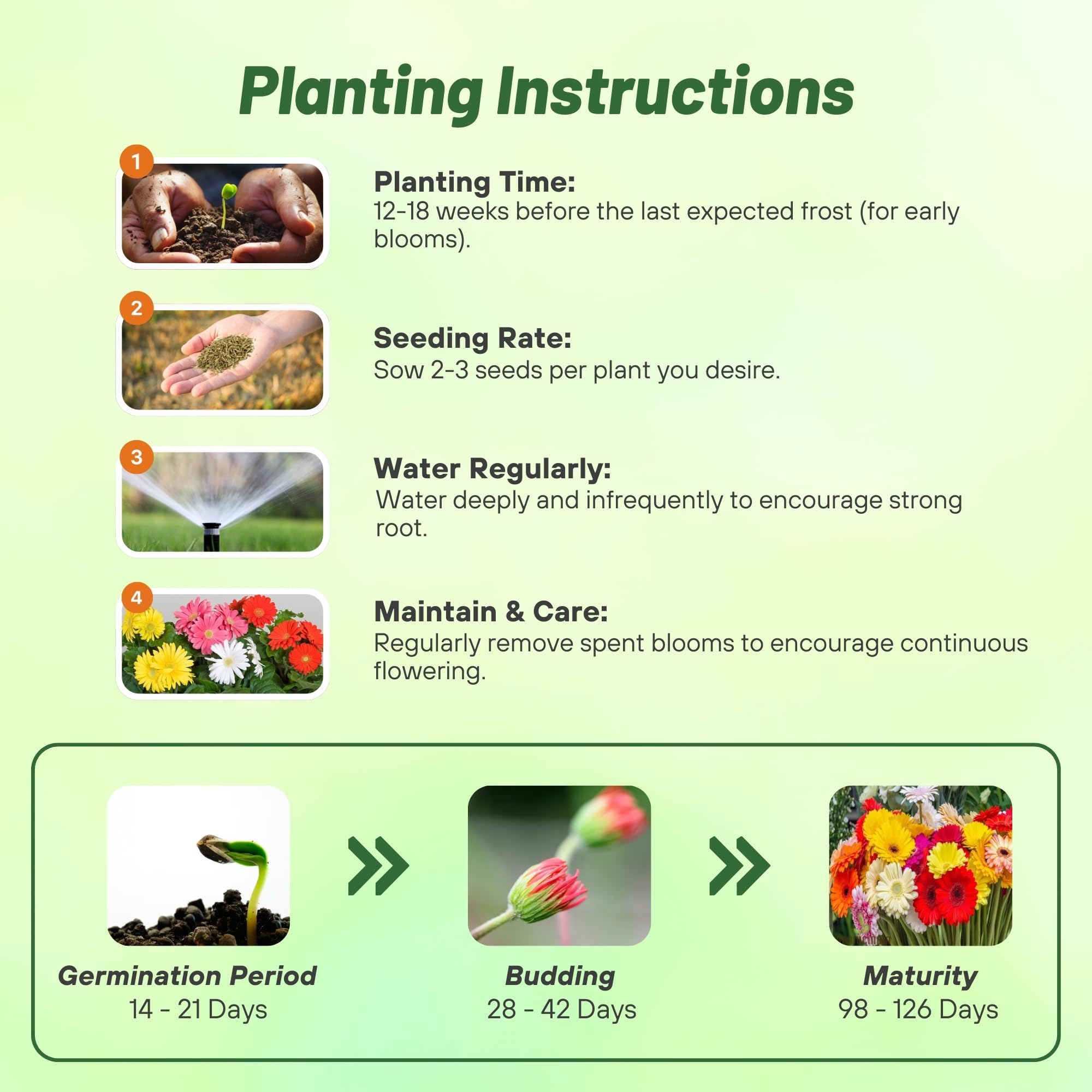 LOW-MAINTENANCE & VERSATILE: Thriving in full sun to partial shade, our hardy plants only require a sow rate of 2-3 seeds per plant in a well-drained soil (pH 6.1-7.5) with 12-16 inch spacing, then cover thinly under 70F degrees while allowing a germination time of 10-21 days for optimal results. Their versatility makes them ideal for landscaping, cutting gardens, pots, and indoor arrangements.
