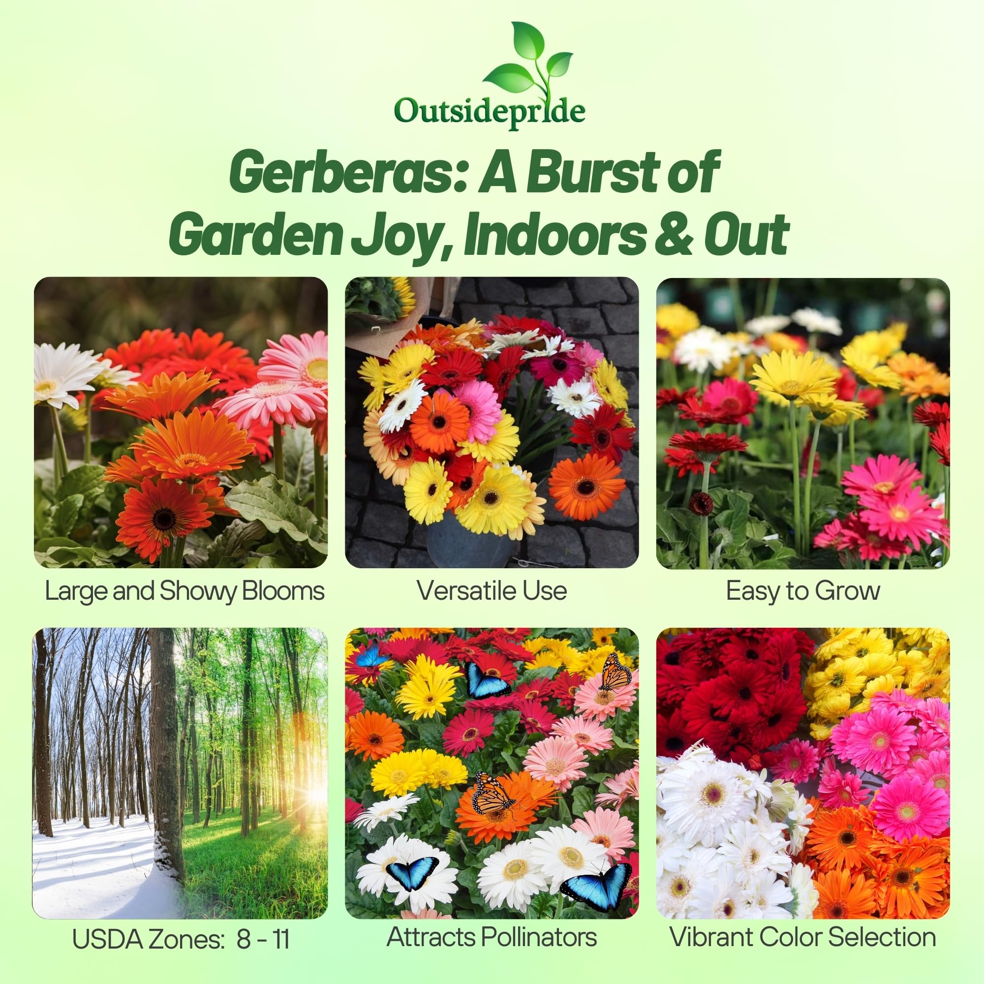 VIBRANT MIXED BLOOMS: Brighten your garden with the stunning colors of Hybrid Mix Gerbera Daisy Seeds in vibrant mixed shades. With deep green foliage, our large dazzling flowers add a pop of charm and elegance, transforming any indoor and outdoor space into a colorful oasis. Perfect for garden beds, pots, or as cut flowers, their bold, eye-catching appeal is sure to impress.