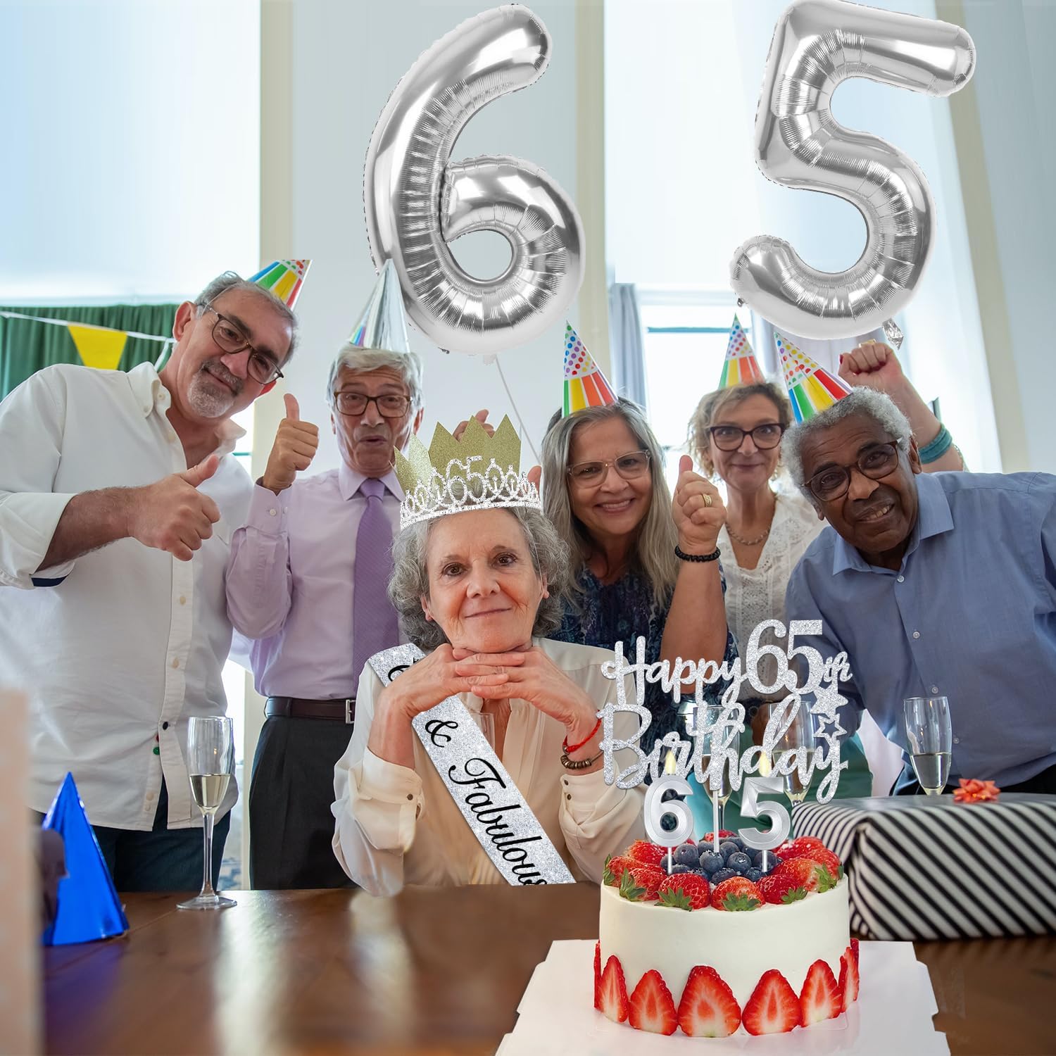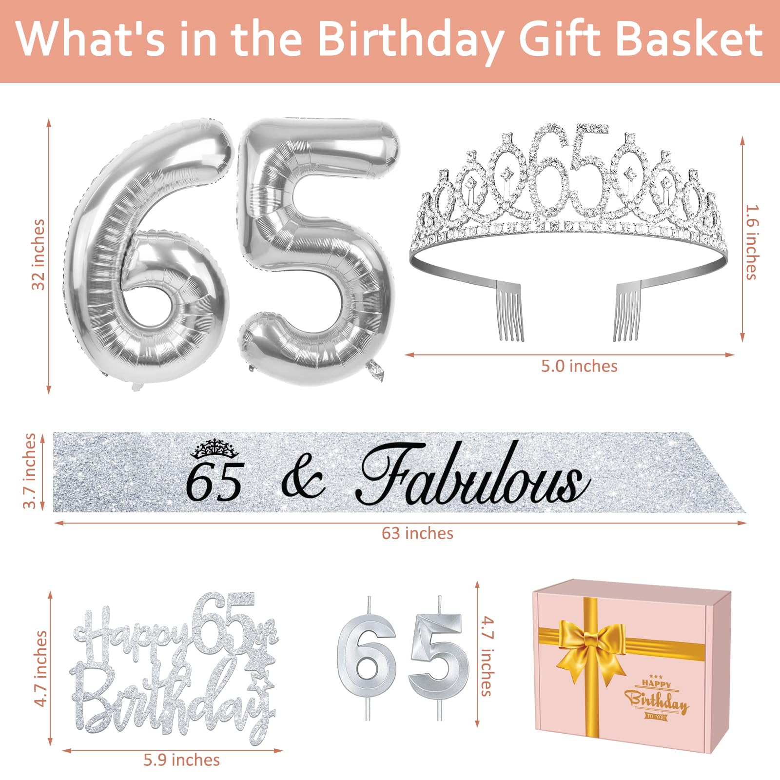 [65th Birthday Decorations Silver]: Coming with 65th Birthday Tiara Silver x 1pc, 65th Birthday Sash Silver x 1pc, Happy 65th Birthday Cake Topper Silver x 1pc, Number 65 Candles Silver x 1set, Numeral 65 Balloons Silver x 1 set, Classical Birthday Card x 1pc. This great valuable 65th Birthday Gifts for Women Silver has been packed in a beautiful gift box for thoughtful presentation. Don't forget to leave her a message! Select "THIS ORDER CONTAINS A GIFT" at checkout and add a personalized gift message with your name