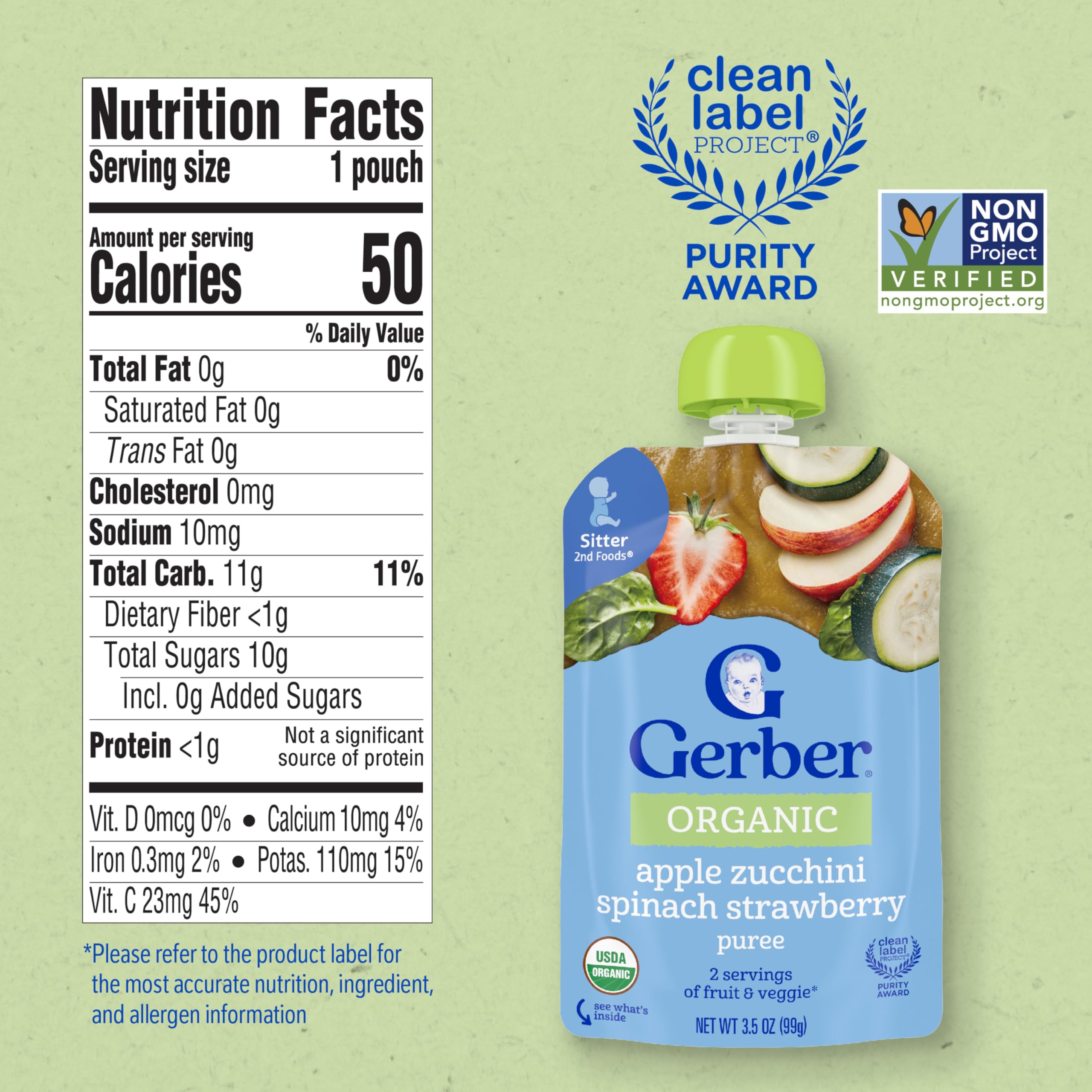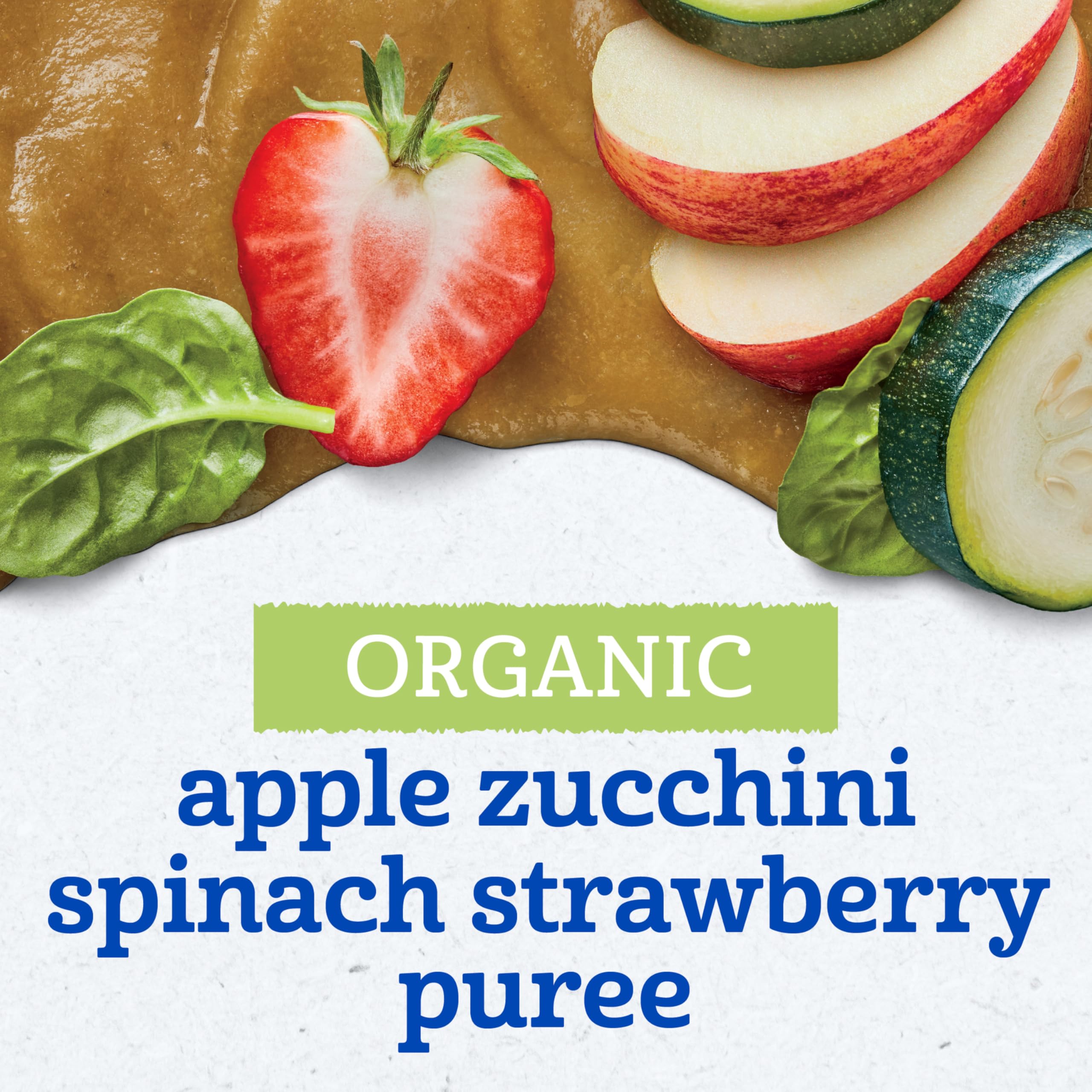 PUREED FRUIT: With your child in mind, our Gerber baby food offers a delightful organic blend of 2/5 apple, 1 tbsp zucchini, 1/2 spinach leaf, and 1/2 strawberry in each pouch