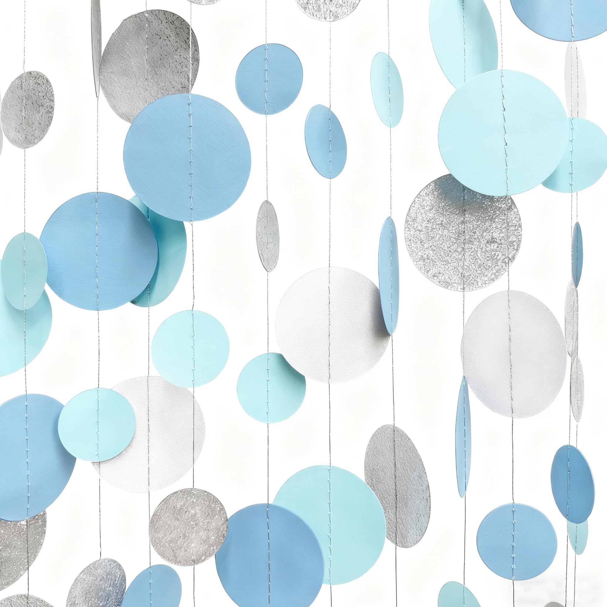Package Contains - 4 set of silver white dusty blue circle dot party garland banner, Each string is 11.5 feet/3.5 meters, Total is 14 meters/46 feet.