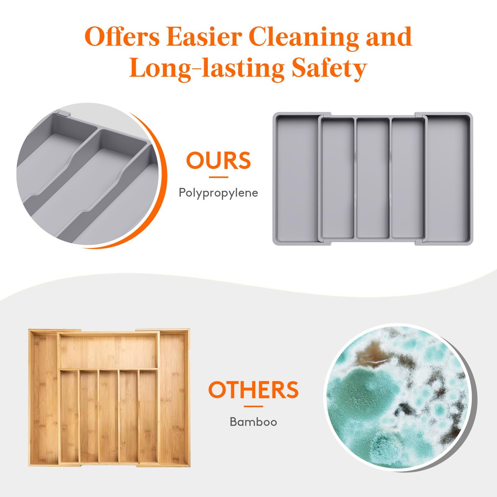 Safe to Use: Crafted from BPA-free PP material, this cutlery drawer organizer guarantees the safety of all your utensils, silverware, and flatware. Cleaning is a breeze as well - simply rinse with water to remove stains. Hand-wash only (dishwasher heat may warp the plastic).