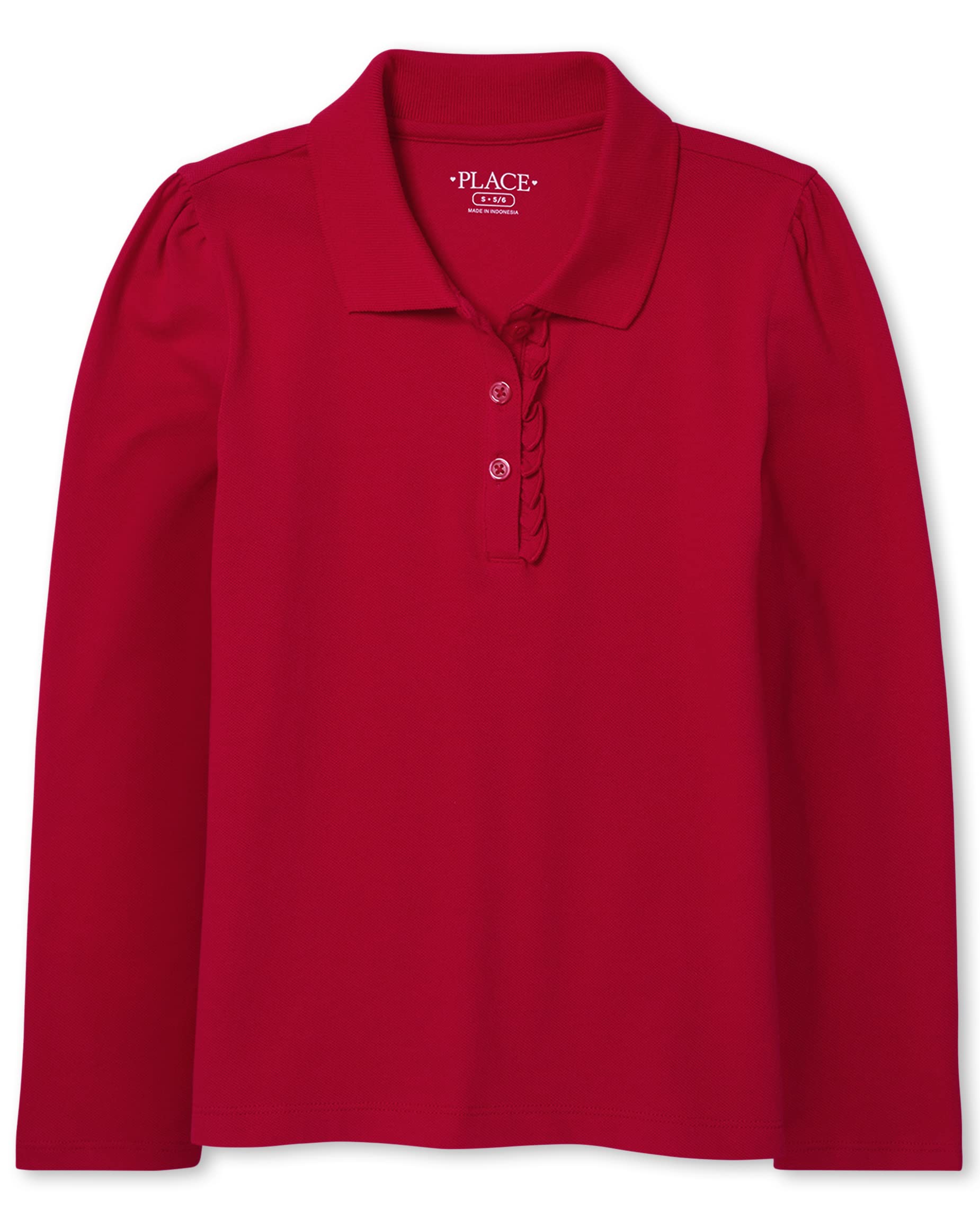 Styled with long sleeves, shirring at the shoulder, ruffle button placket and tagless label