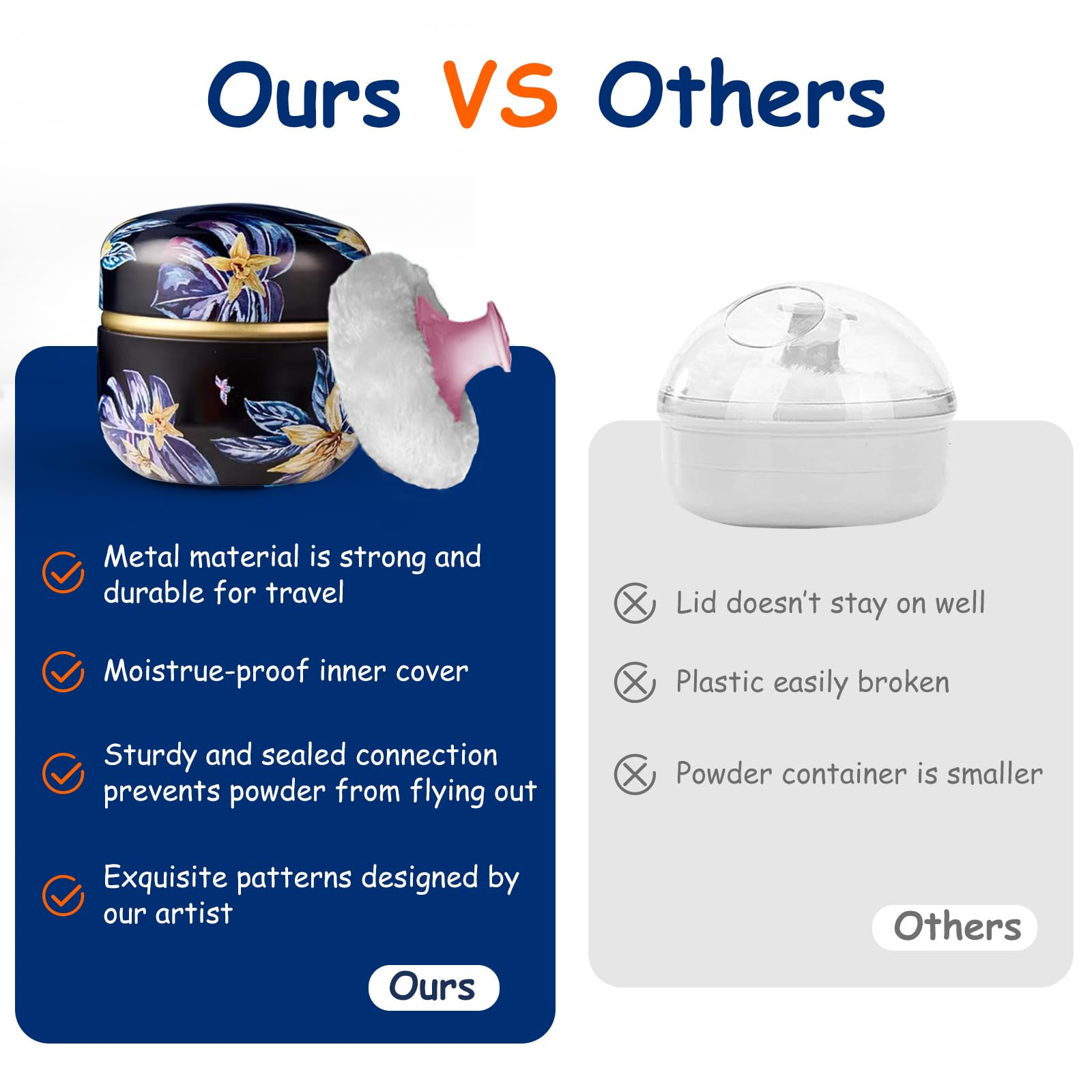 GORGEOUS POWDER BOX: our powder case is made of tinplate, not easy to break and fade after being dropped, also can be used for a long time. the surface of the powder container has exquisite patterns designed by our artist, bring visual enjoyment.