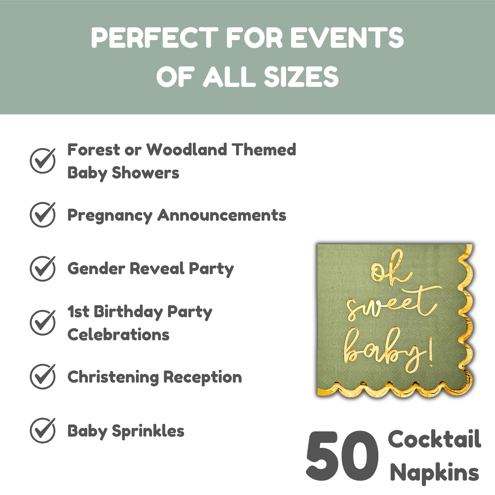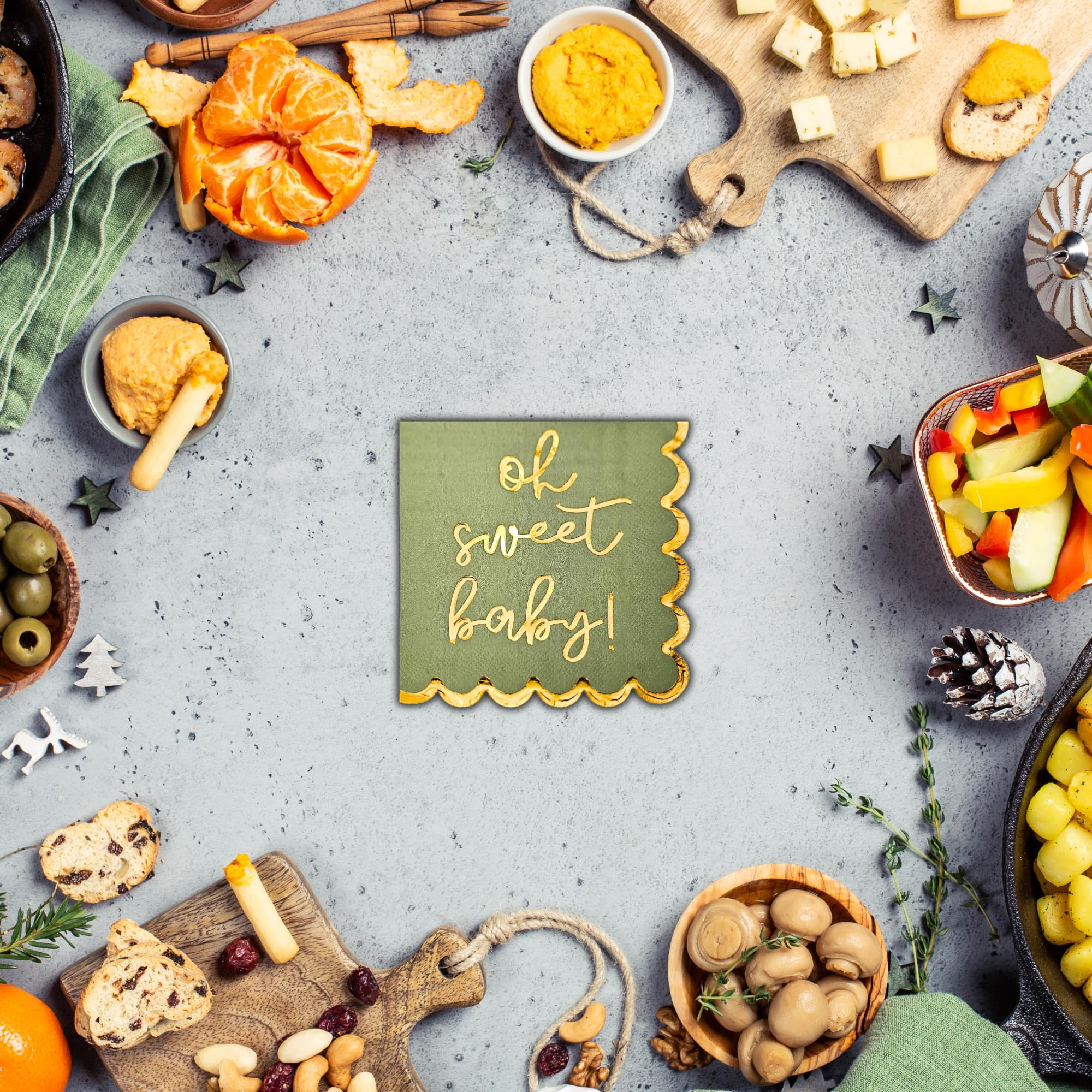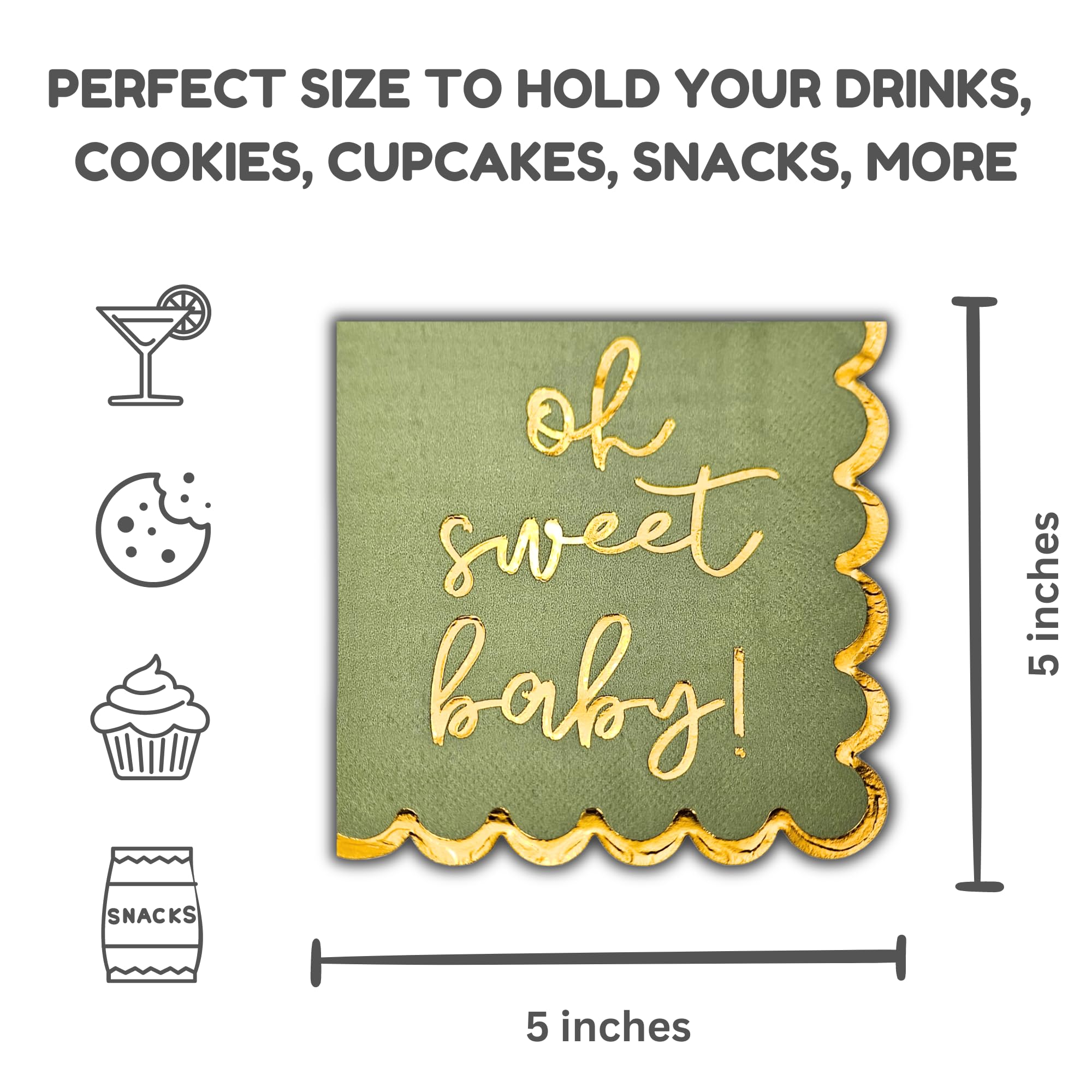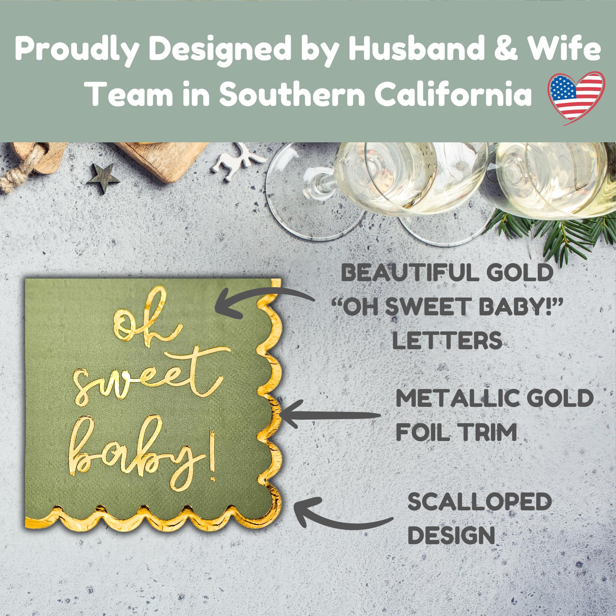 ELEGANT DESIGN: Proudly designed by husband-and-wife team based out of Southern California, these beautiful sage green napkins feature the phrase "Oh Sweet Baby!" in shimmering metallic gold foil. Scalloped edges with a matching gold trim add a touch of sophistication to any sage green and gold baby shower decorations.