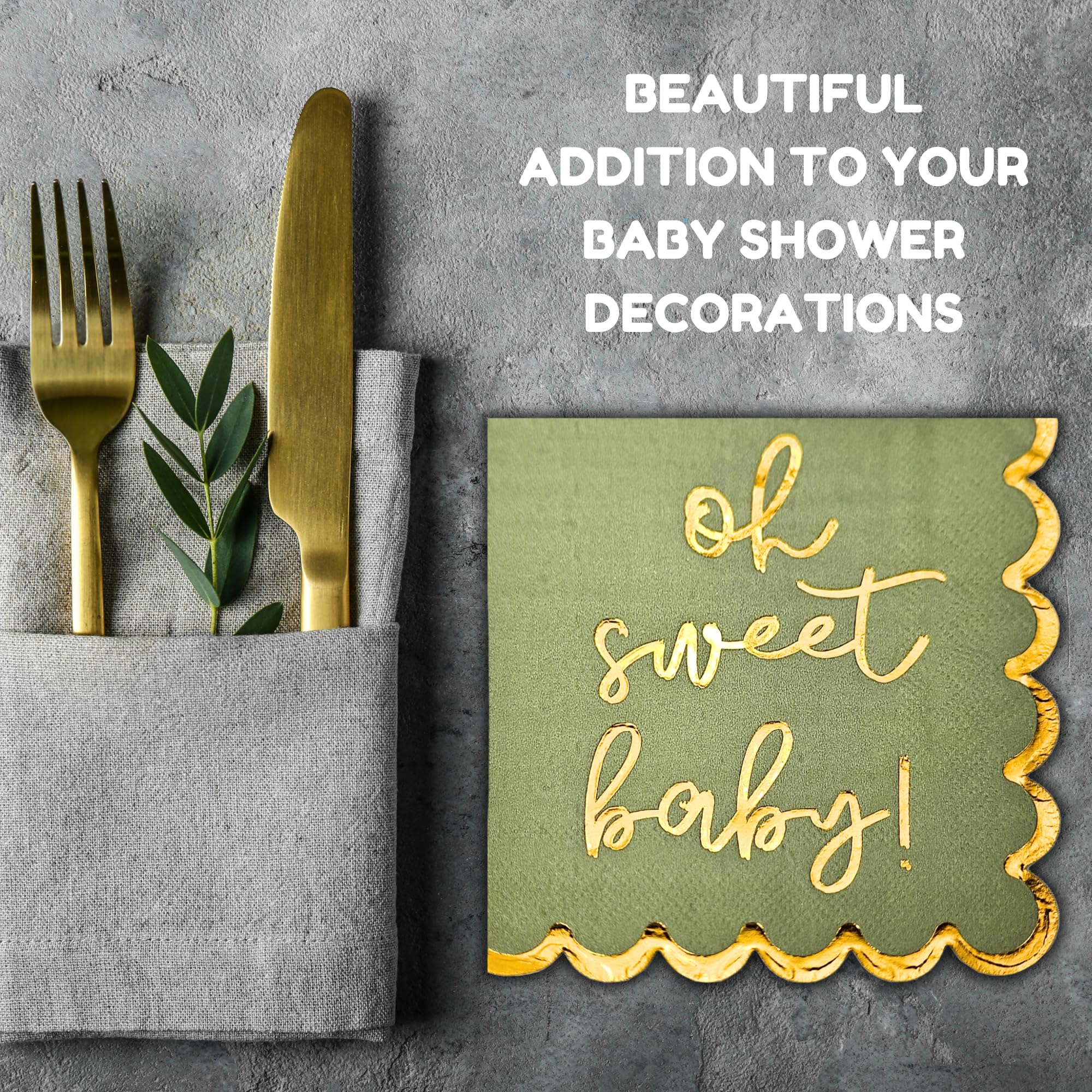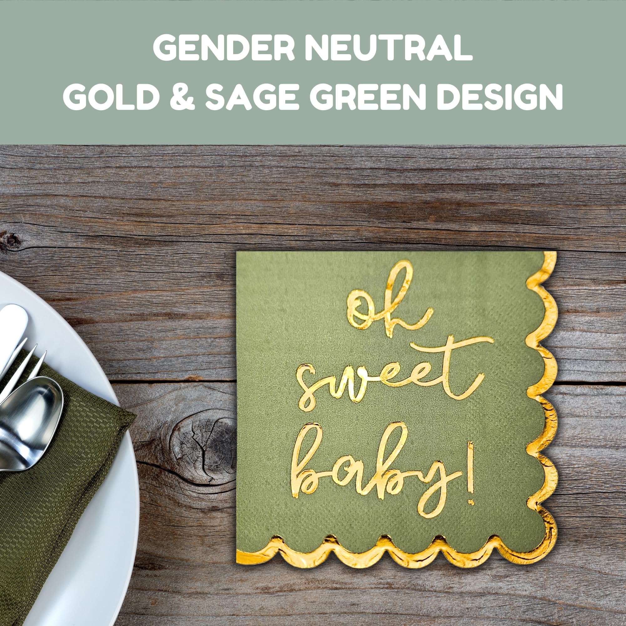 Sage Green Baby Shower Decorations, 50 Pack, Oh Sweet Baby Gold and Sage Green Scalloped Napkins, Gender Neutral Baby Shower Decorations for Girl or Boy, Gender Reveal Decor, Greenery