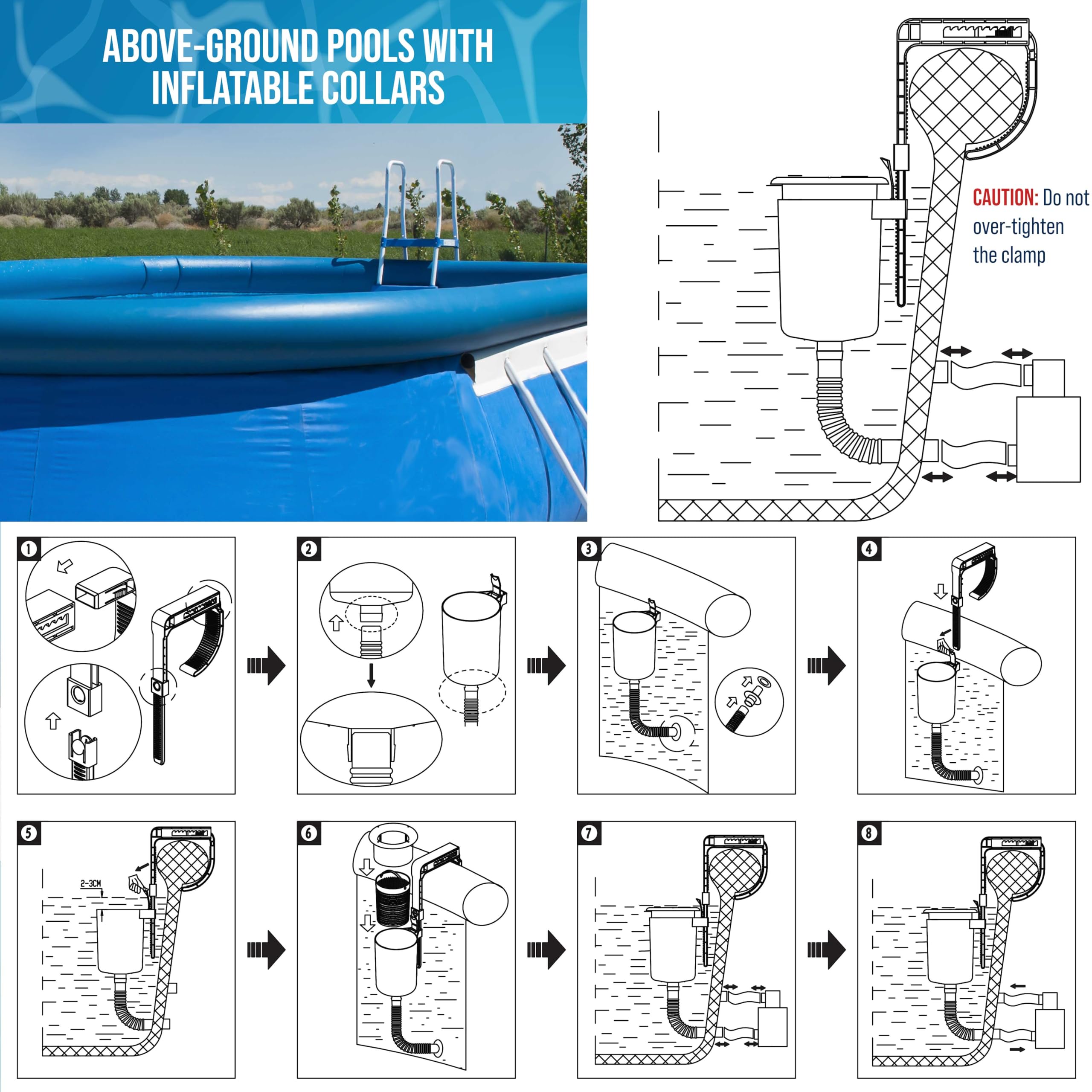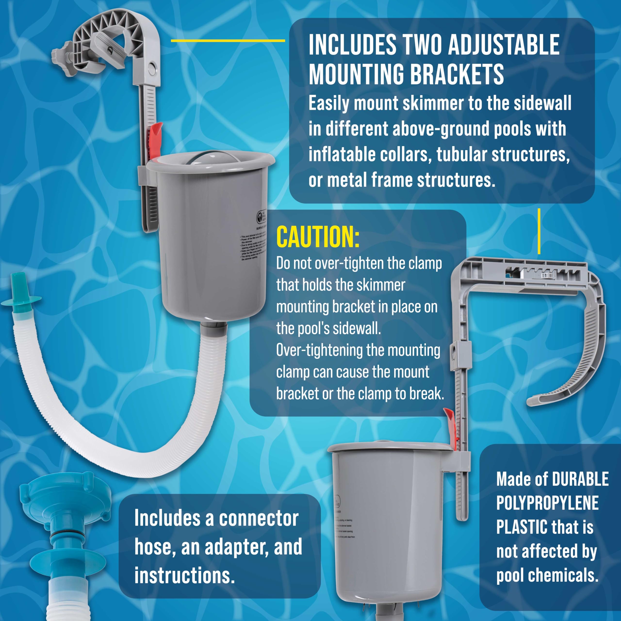 Easy to Install: The skimmer includes two adjustable height mounting brackets, allowing it to be easily and appropriately mounted to the sidewall in different above-ground pools with inflatable collars, tubular structures, and most metal frame structures. Caution: Do not over-tighten the clamp that holds the skimmer mounting bracket in place on the pool's sidewall. Over-tightening the mounting clamp can cause the mount bracket or the clamp to break.