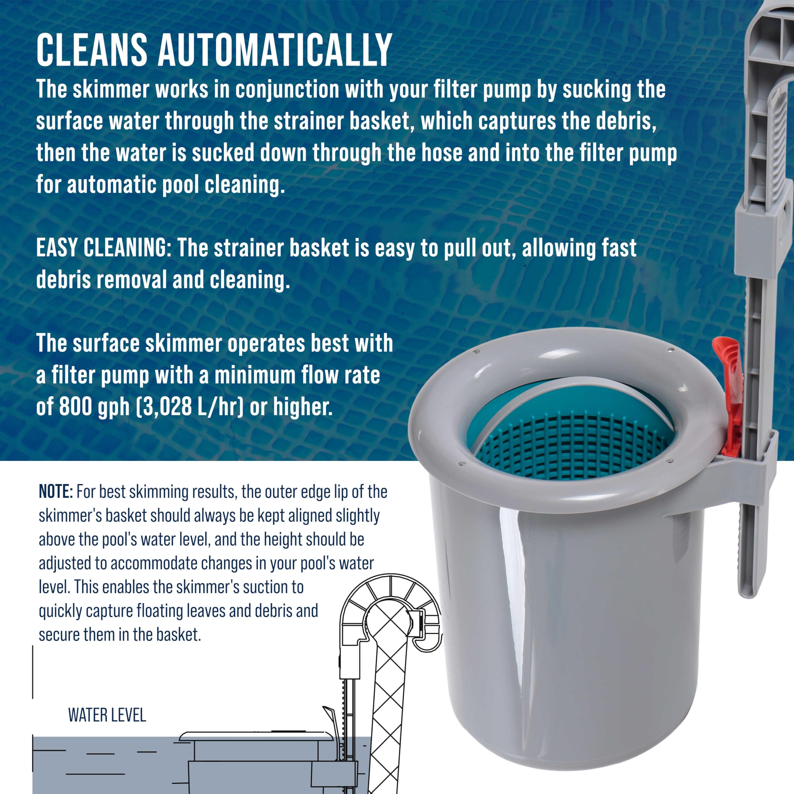 Cleans Automatically: The skimmer works in conjunction with your filter pump by sucking the surface water through the strainer basket, which captures the debris, then the water is sucked down through the hose and into the filter pump for automatic pool cleaning