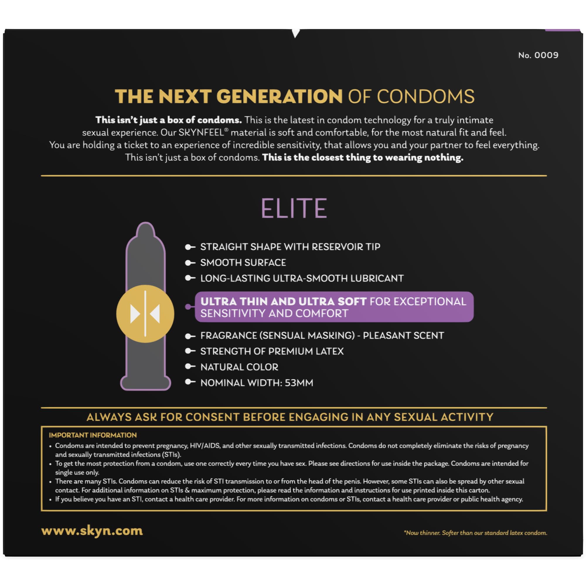Ultra-Thin: Designed for an exceptionally sensitive and sensual feeling, the SKYN Elite condom is 15% thinner than our standard non-latex condom