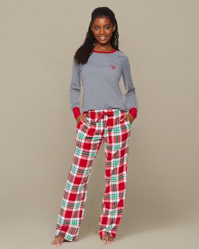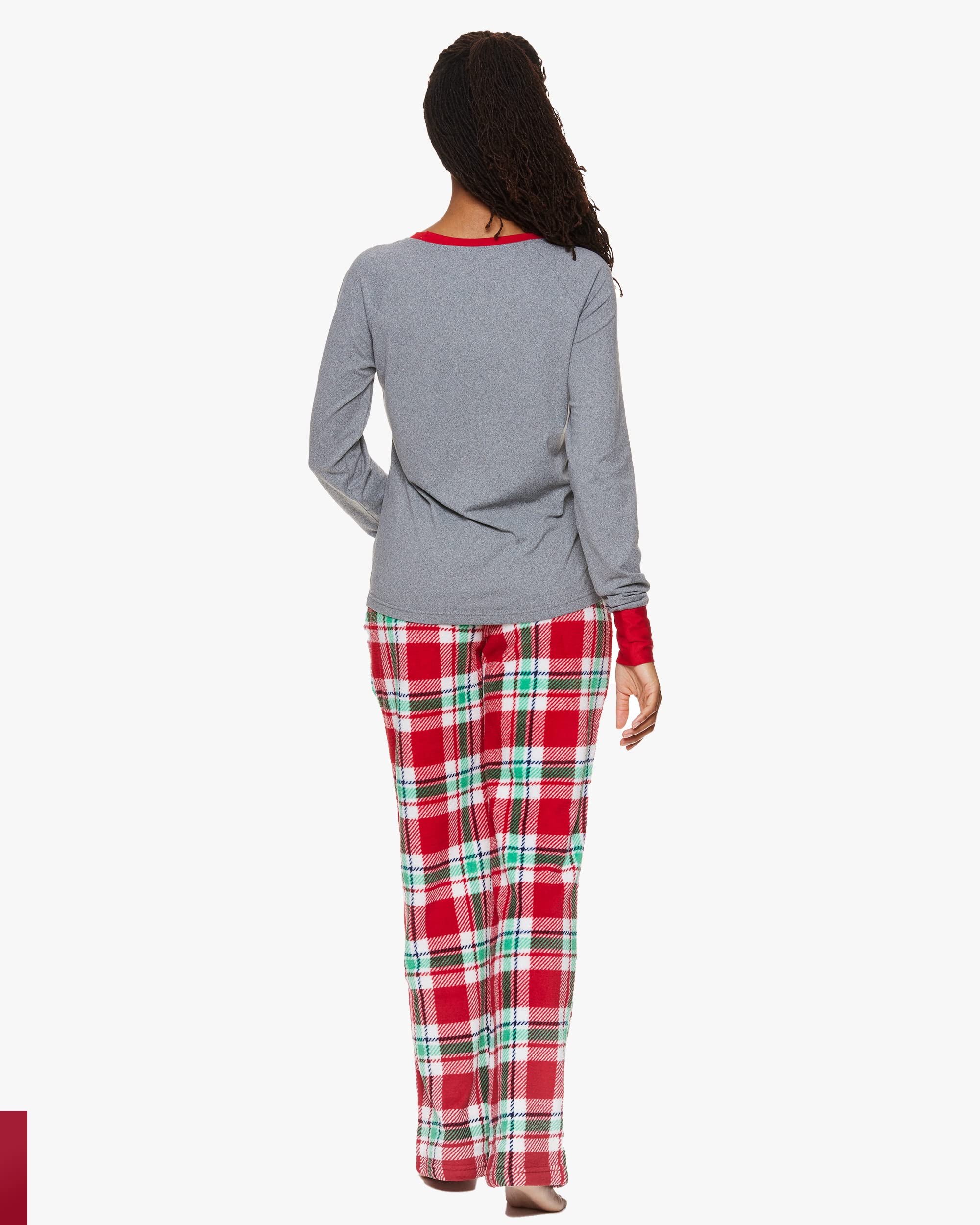 Women's pajama set includes a long-sleeve PJ top and plaid pajama pants with pockets