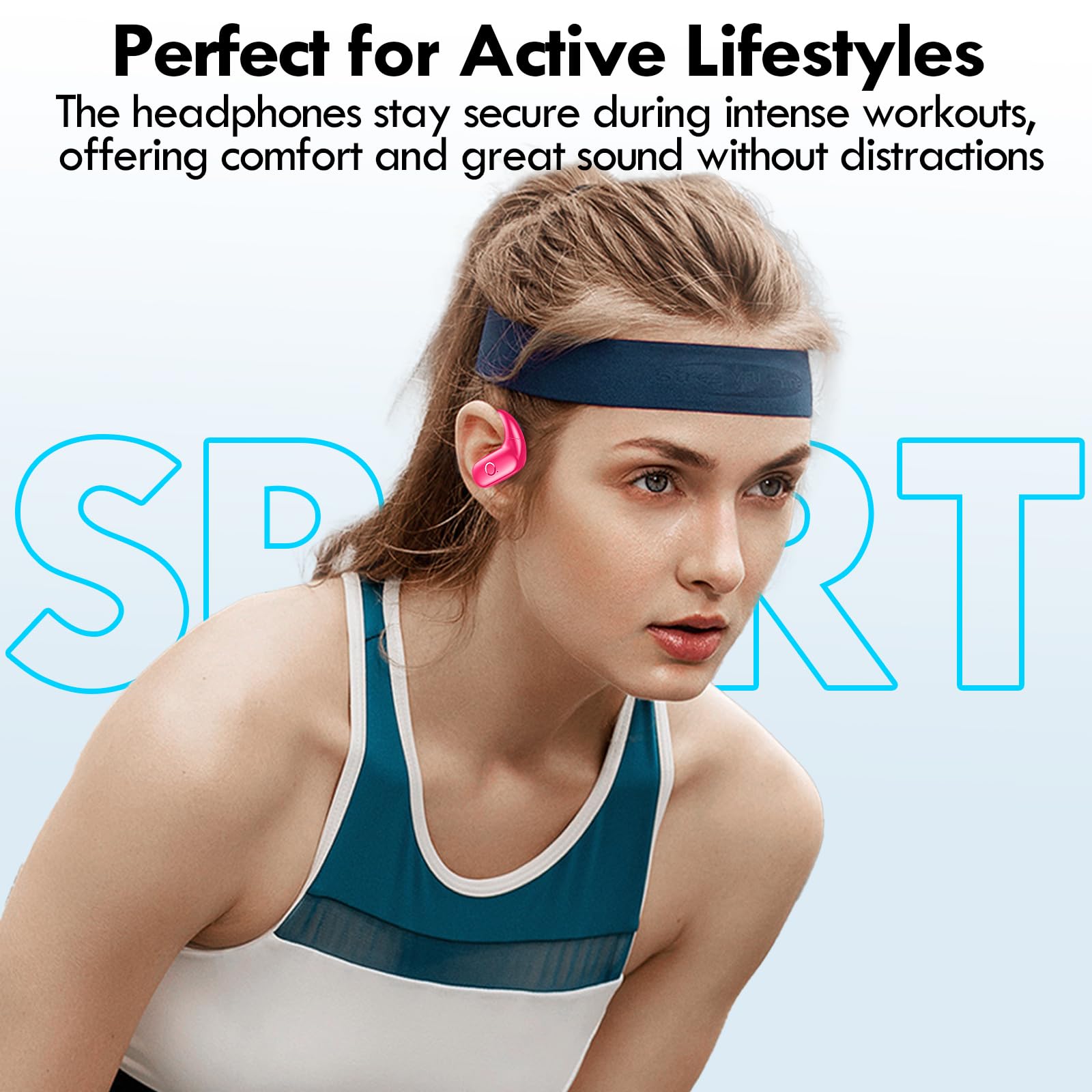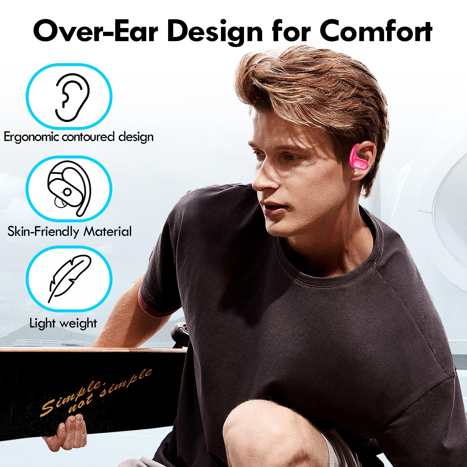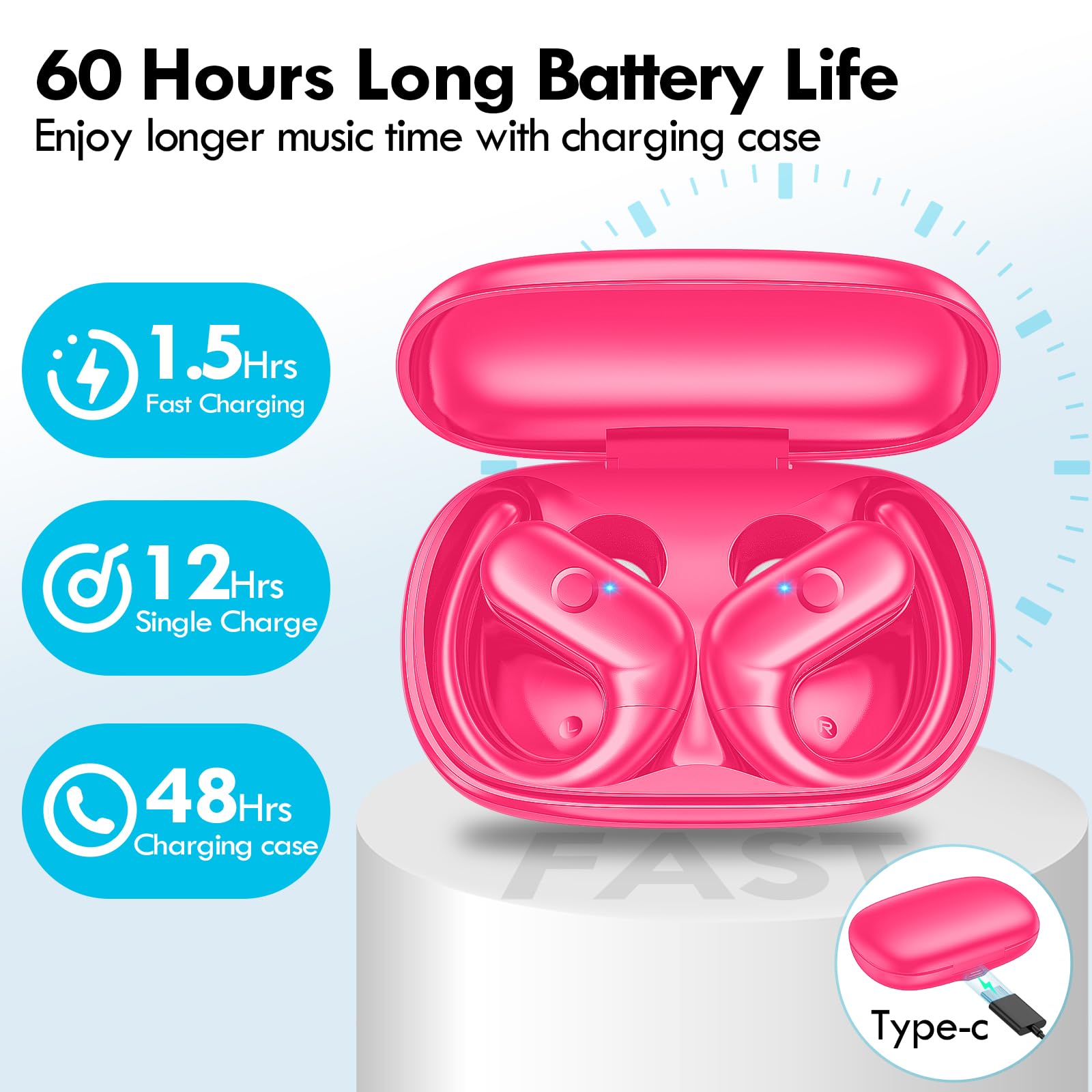 Wireless Earbuds Bluetooth Headphones Sport,Over Ear Buds with Deep Bass Sound,60Hrs Playtime Earphones Redesigned Comfort Fit with Earhooks for Running,Meeting,Workout-Hot Pink