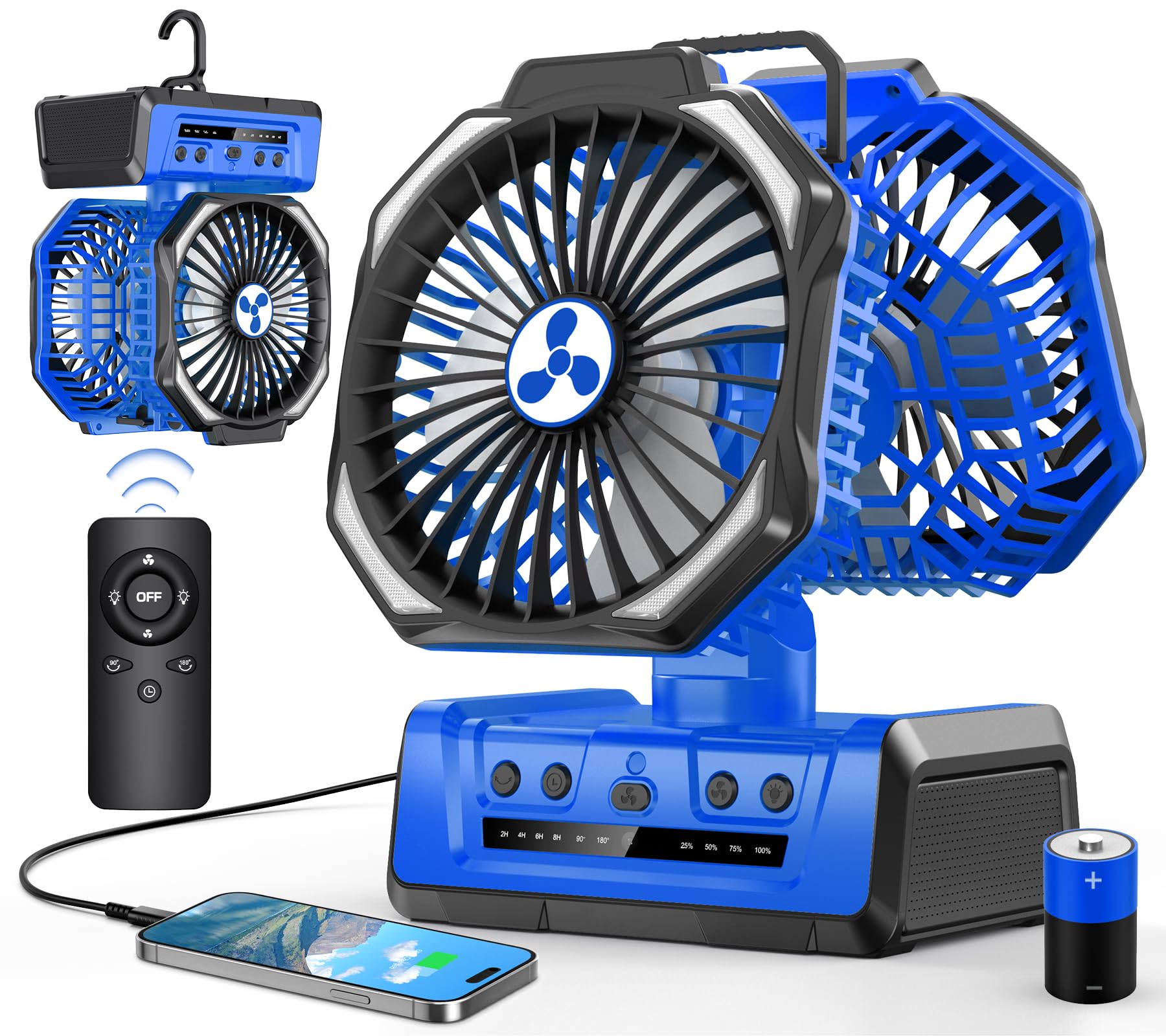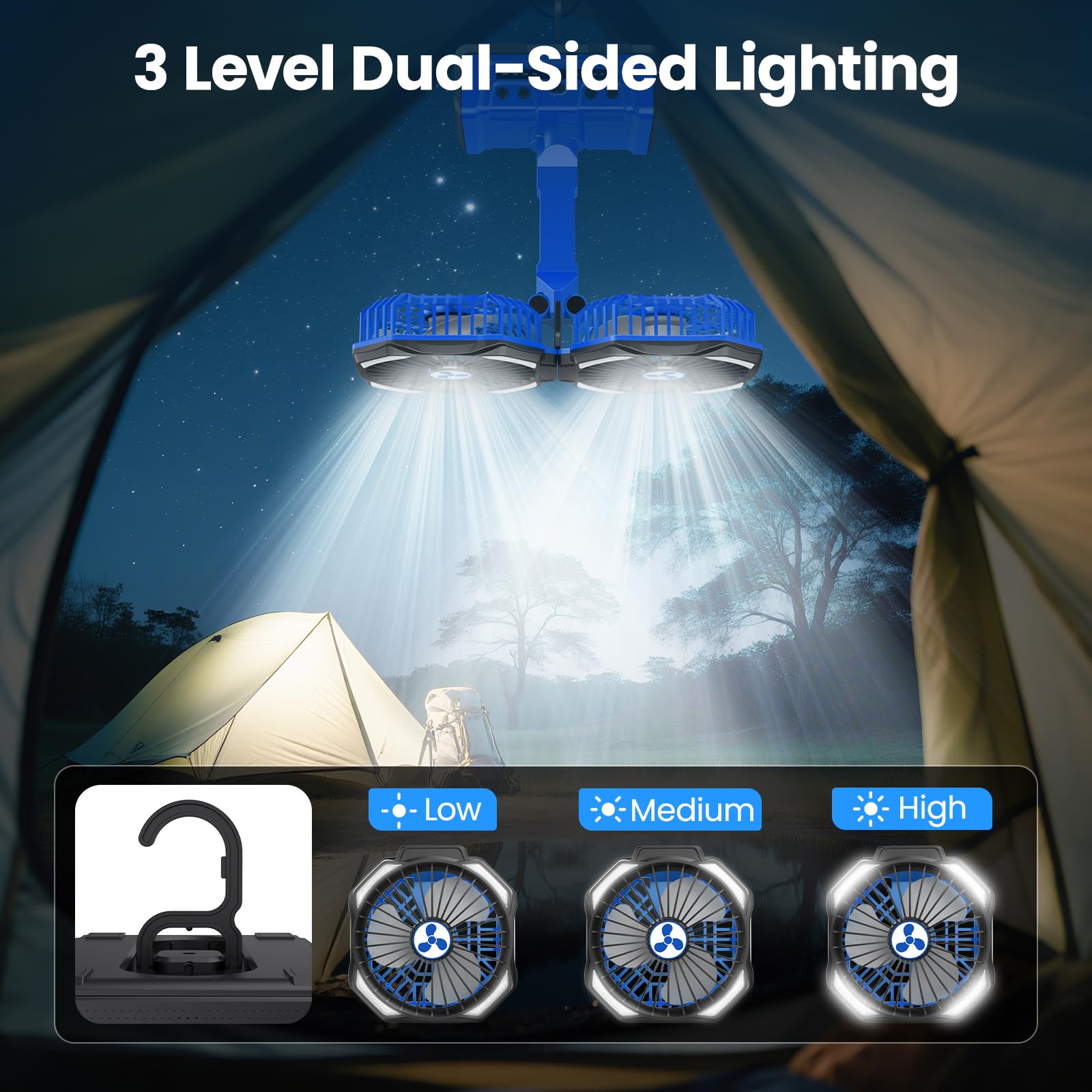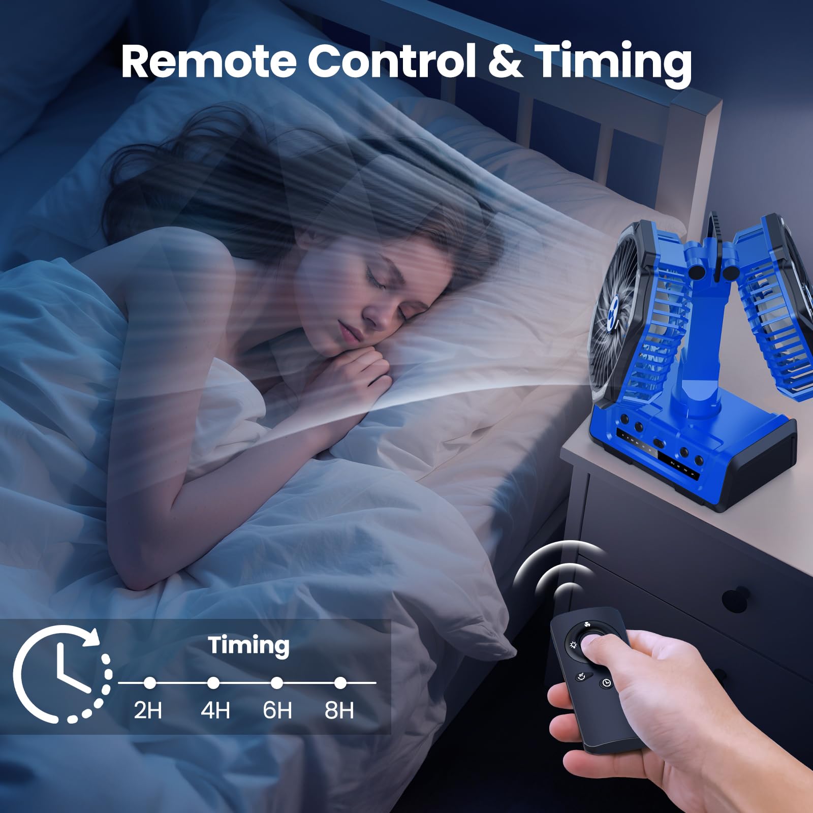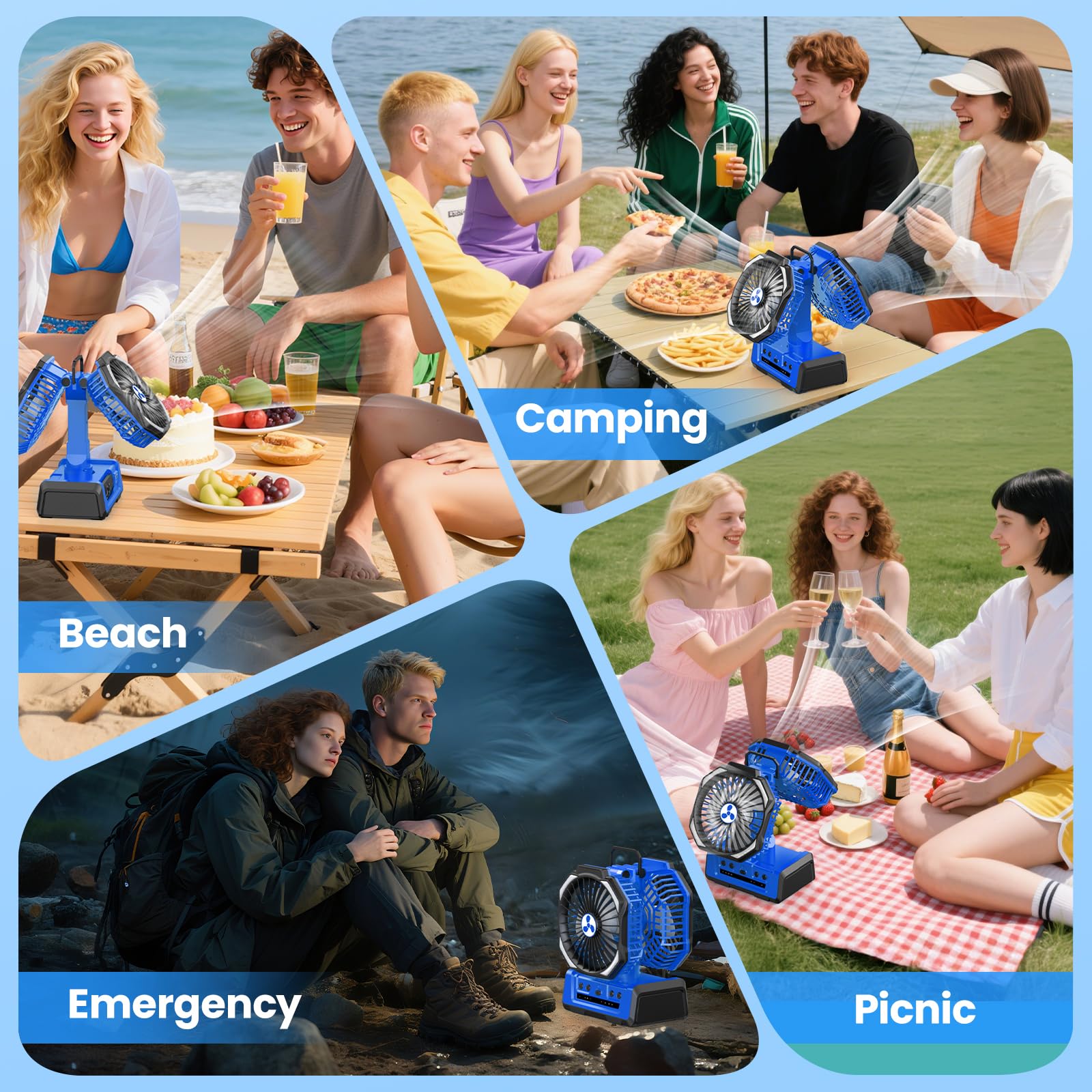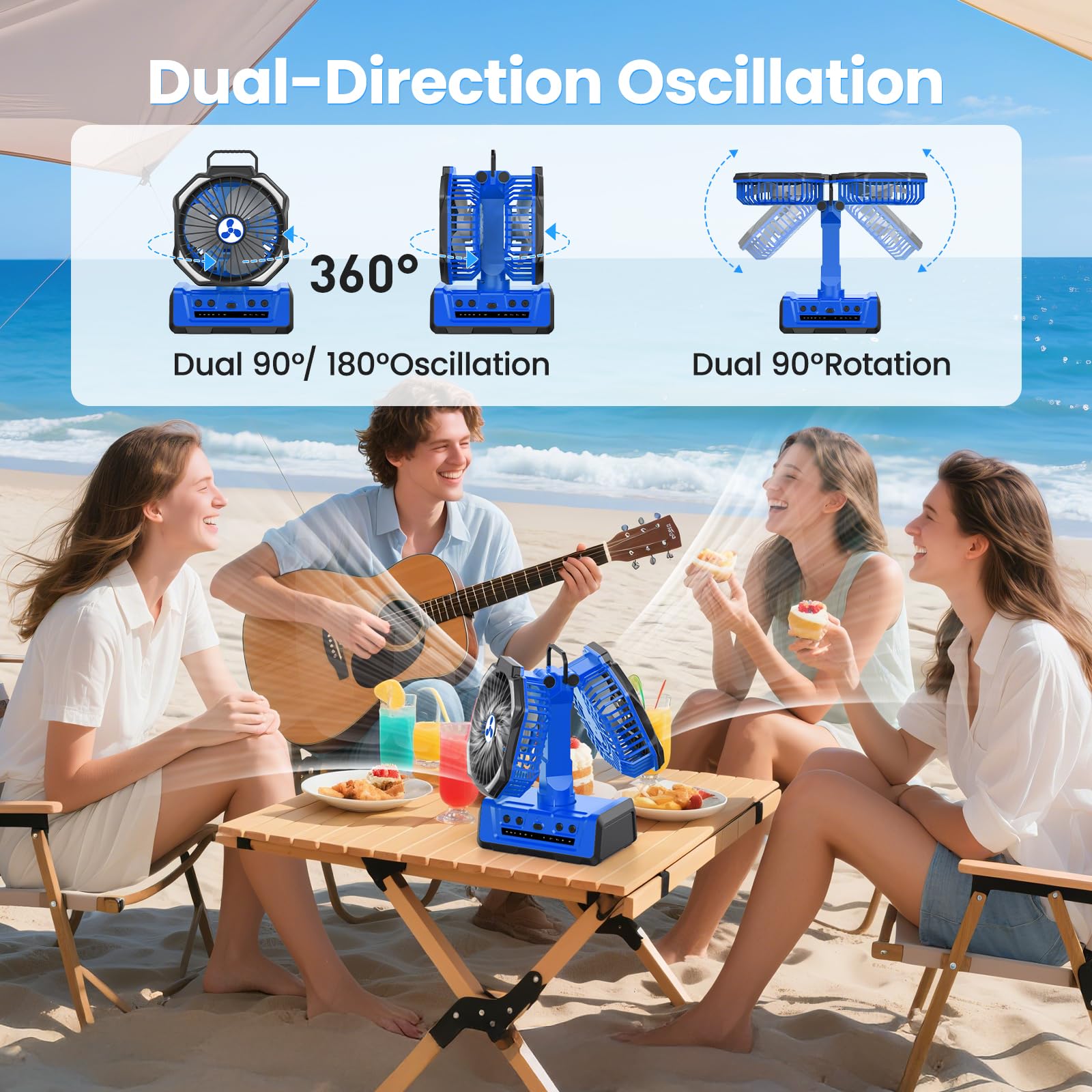 Innovative 360° Dual Head Portable Fan: dual head design camping fan delivers simultaneous front/rear airflow. With 4-speed settings, auto-oscillating 90°/180° rotation, and dual-sided max 90° tilt adjustment, this battery fan achieves 360° omni-directional cooling, creating comprehensive mobile cooling environment for picnics, campsites, fishing trips, and outdoor workspaces etc