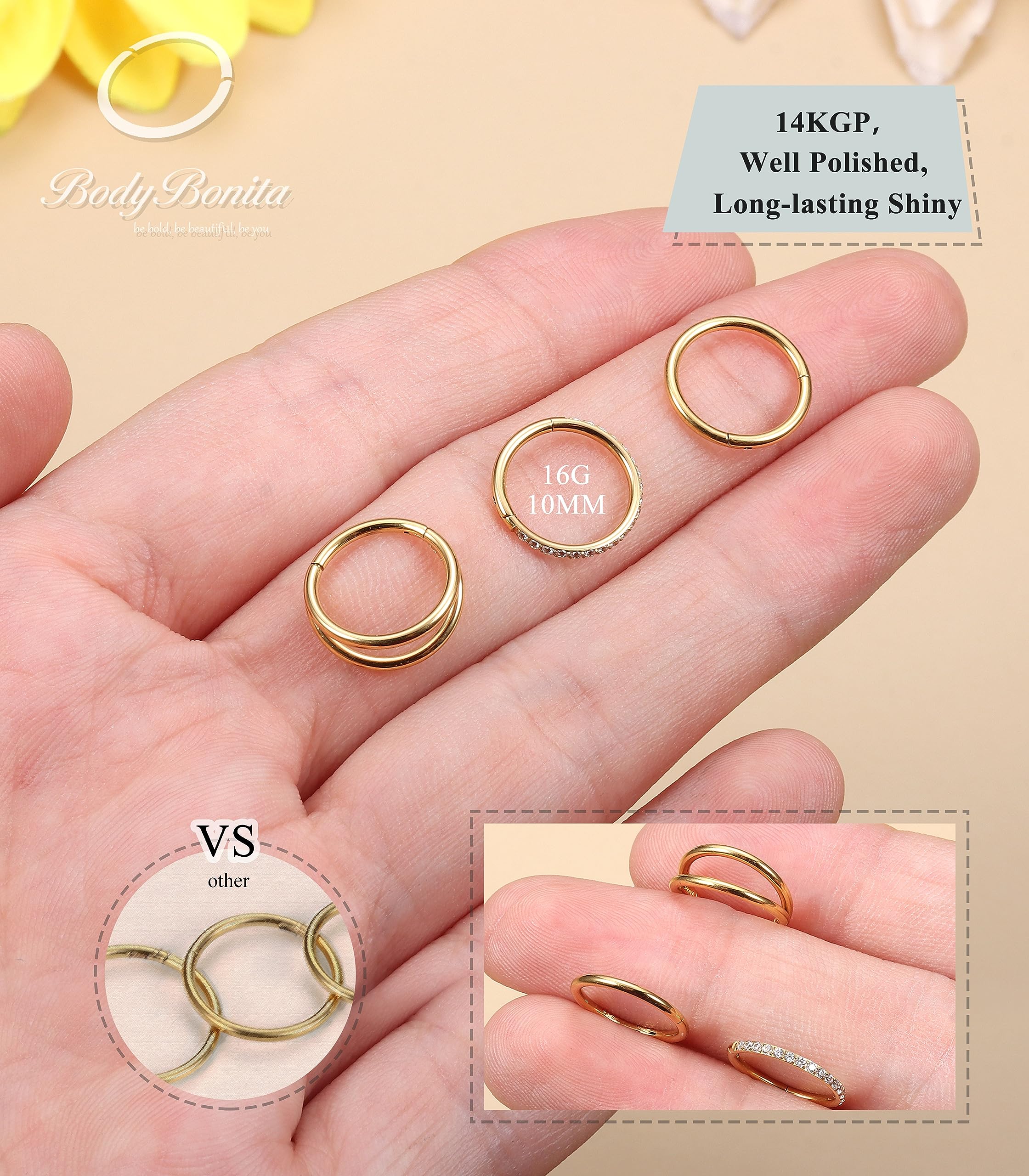 Description What you get: 3 pcs of BodyBonita seamless nose ring(14K gold plated/silver/black plated/rose gold plated ), crafted to be brilliantly shiny, hypoallergenic, and effortlessly easy to put in and take out. Materials: 316L stainless steel. Style in One Package: cubic zirconia nose hoop, double nose ring hoop, classic single nose rings hoop. Available Color: 14K gold plated/silver/black plated/rose gold plated. Avaliable Gauges Size: 14g, 16g, 18g, 20g. Avaliable Inner Diameter : 7mm, 8mm, 9mm, 10mm. Product Types: Lip piercing/aretes para labios, Septum ring, Hoop belly button rings, Cartilage earring, Daith piercing jewelry, Conch hoop earring, Helix earring, Tragus earring, Rook earrings, Acero inocidable dorado arete percing, Nipple rings.