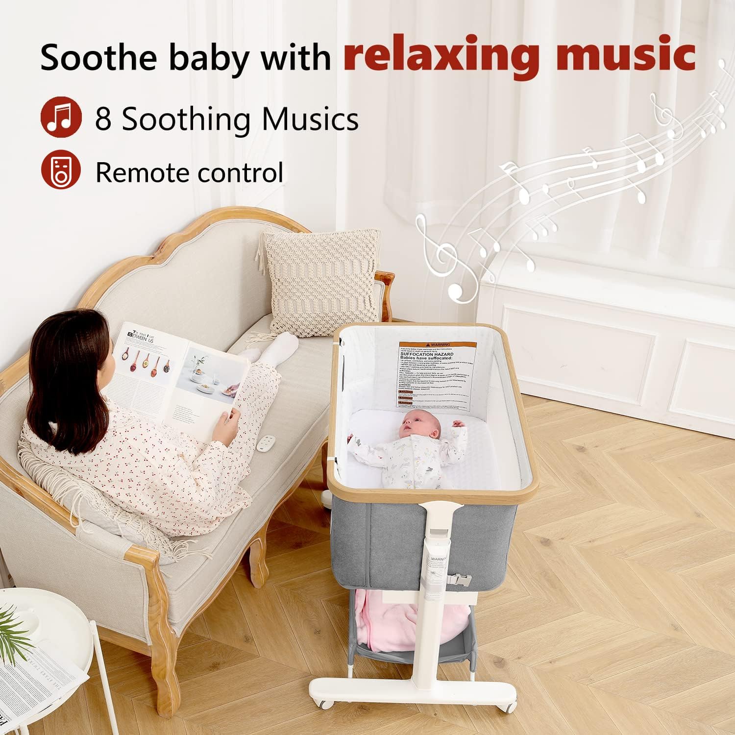 Bedside Sleeper - Baby bassinet; baby cradle; bedside sleeper 3 in 1, allows moms to easily feed or comfort the baby. Simply lower the bassinet wall for quick access. 5 music and 3 white noise options help soothe the baby