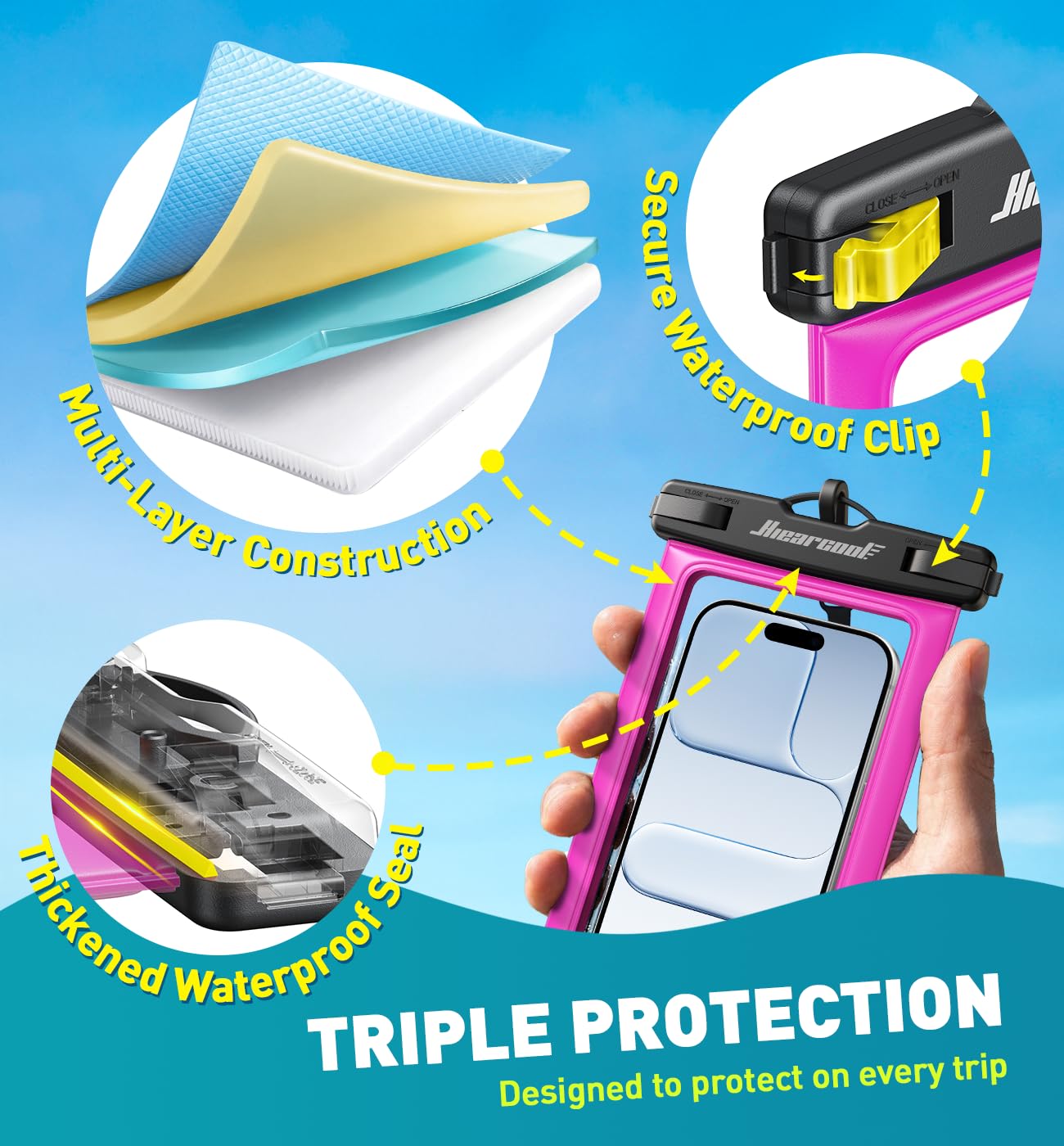 BEACH ESSENTIALS-SUPERIOR WATERPROOF PROTECTION: Certified IPX8 waterproof with Hiearcool's triple layer lock-down technology provides complete protection against water, snow, dust, and sand. Ensure your cell phone stays dry