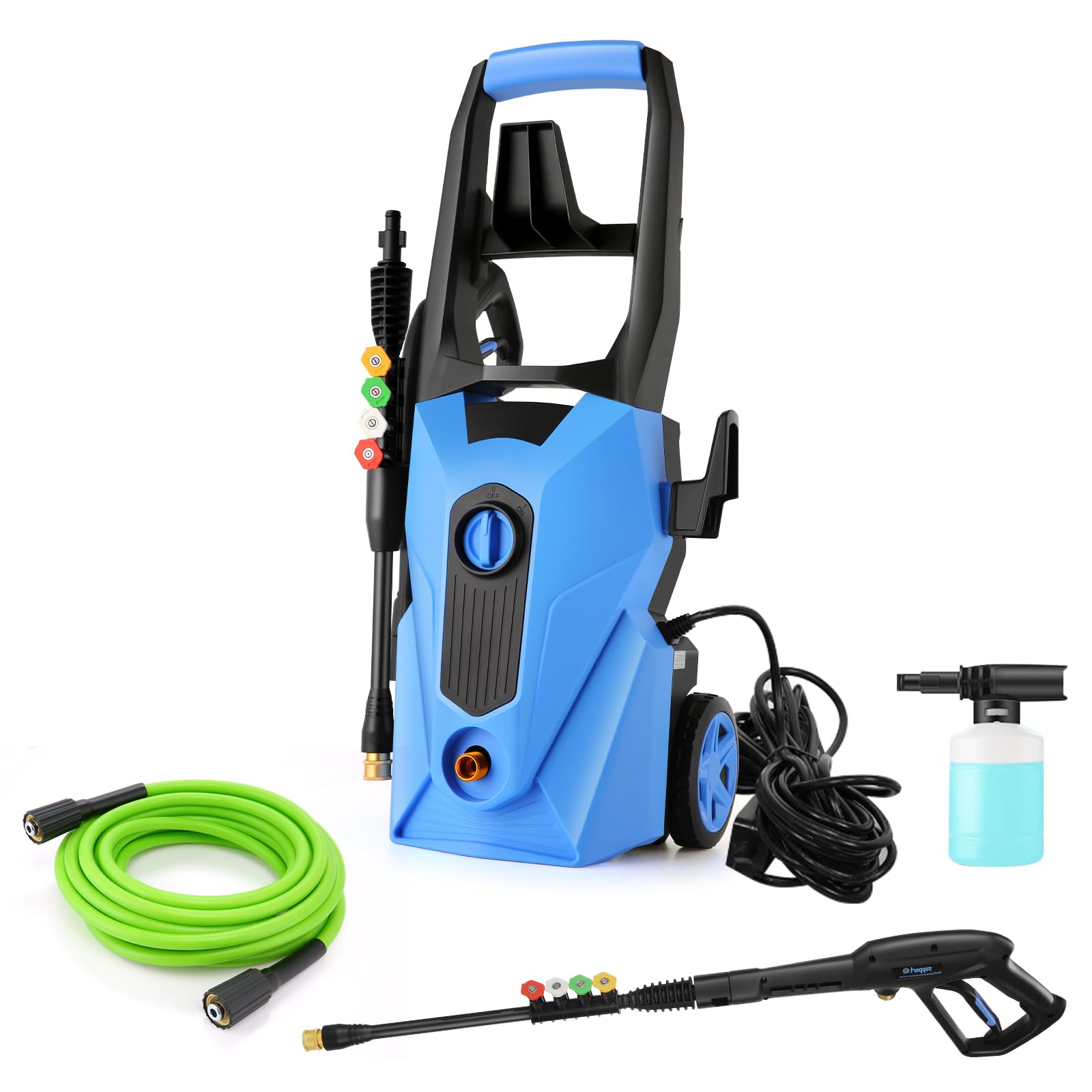 This washing machine is equipped with 5 quick-connect nozzles (0°, 15°, 25°, 40°and soap) and soap bottle, which can cope with different levels of cleaning tasks. Different angles have different cleaning power. You can choose the right nozzle replacement for your cleaning needs.