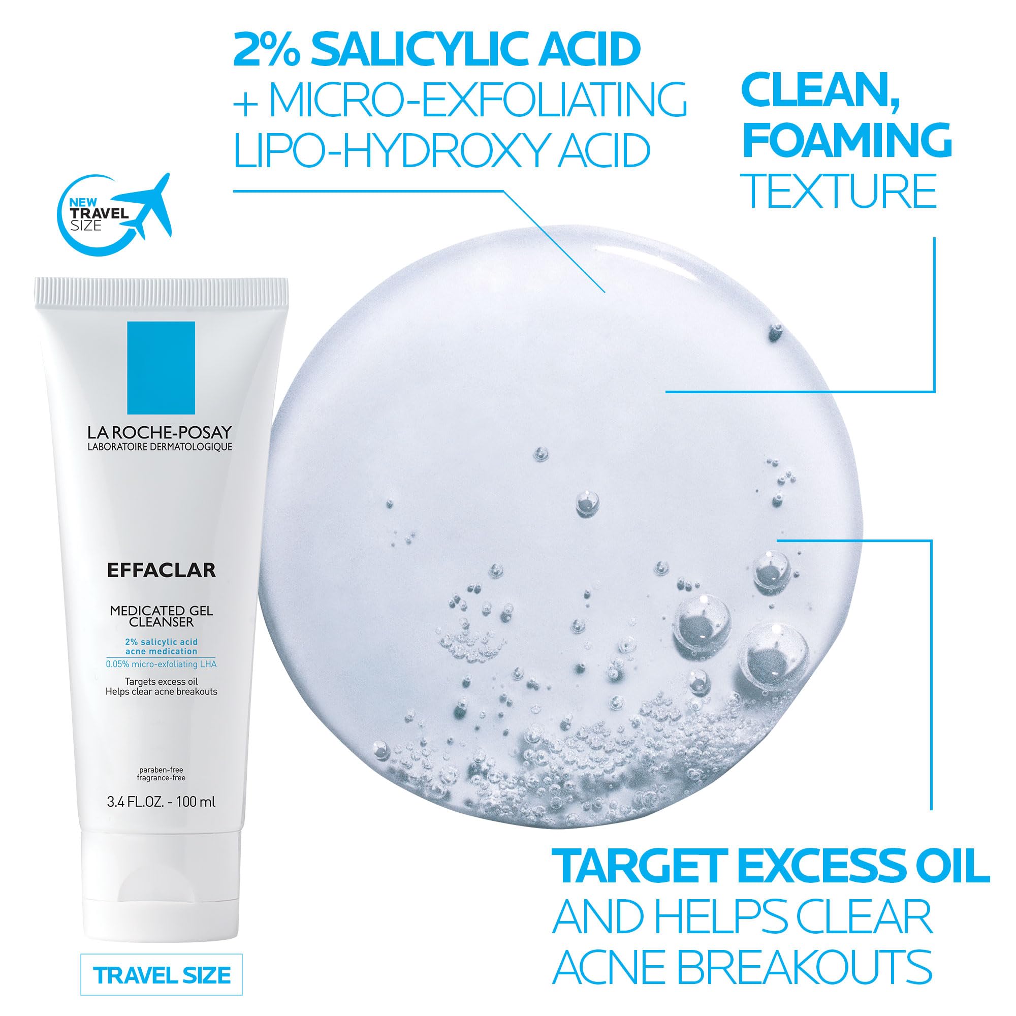 Travel size Effaclar Medicated Cleanser is a salicylic acid face wash is formulated with 2% salicylic acid and lipo-hydroxy acid to remove impurities without harsh scrub particles that may irritate skin.