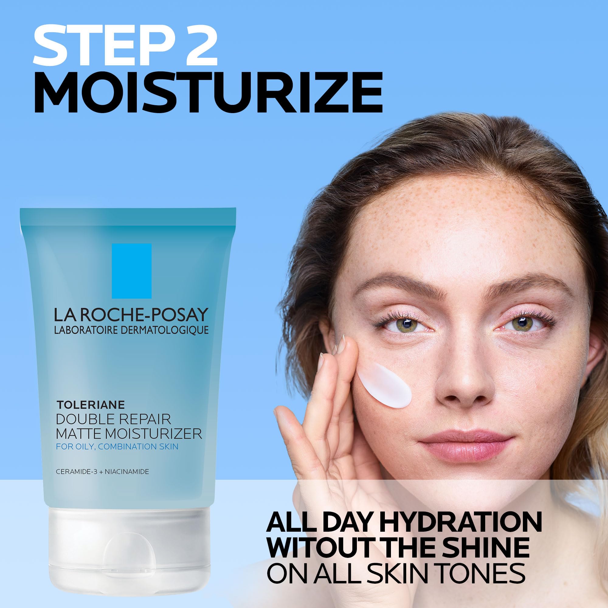 Toleriane Double Repair Matte Face Moisturizer for oily skin is formulated with a high concentration of La Roche-Posay prebiotic thermal water, ceramide-3, niacinamide, and glycerin to help restore healthy-looking skin