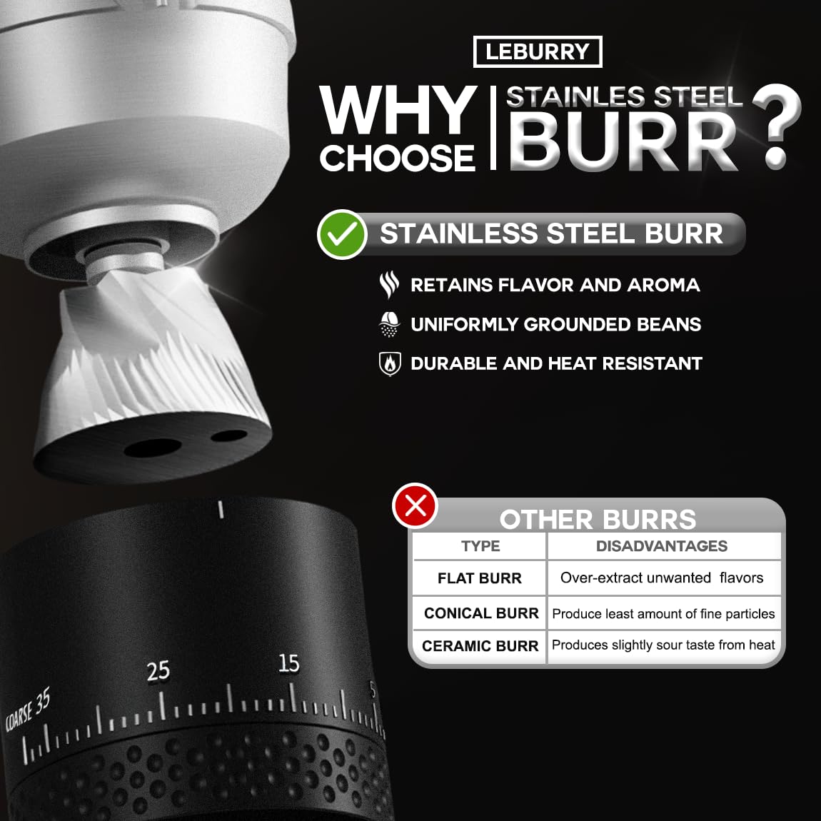 Cordless/Rechargeable Coffee Grinder: Crafted from premium stainless steel, this high quality burr coffee grinder handles the toughest coffee beans with ease. Its precision-engineered burrs ensure a consistent grind, enhancing the extraction of essential oils and flavors. With a 110 ml/3.8 oz capacity, this grinder provides the versatility and precision you need for an exceptional coffee experience every time.