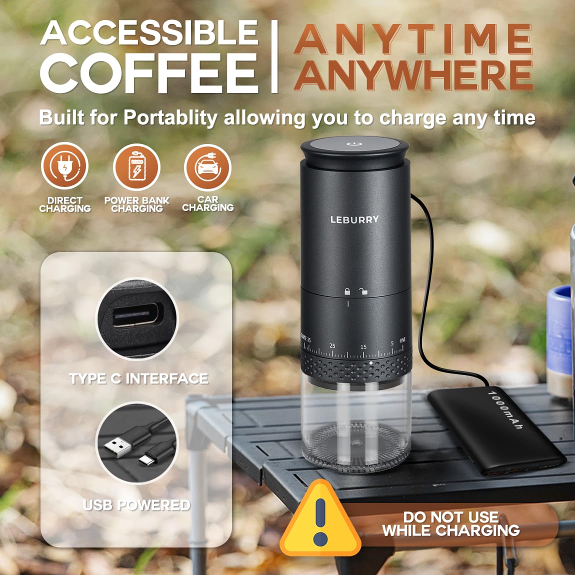 Burr Coffee Grinder :This portable burr coffee grinder allows you to grind coffee beans wherever you are, making it perfect for those who enjoy freshly ground coffee on the go. Its intuitive design ensures easy use, so you can achieve a consistent, perfect grind with minimal effort. The grinder's compact and lightweight build means it won't take up much space, fitting easily into your bag. Whether at home, in the office, hiking, or traveling.