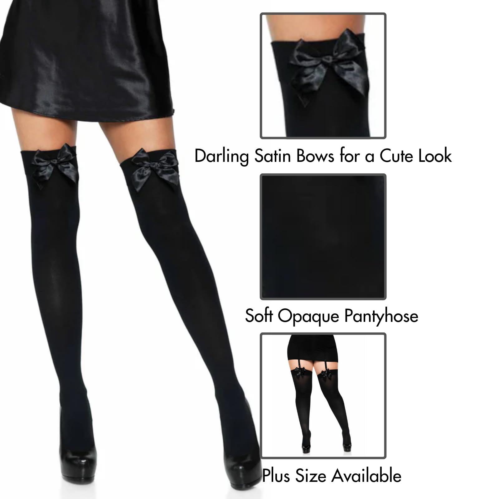 Take basic stockings and add a flirty touch; These opaque plus size thigh highs with satin bow are next level gorgeous.