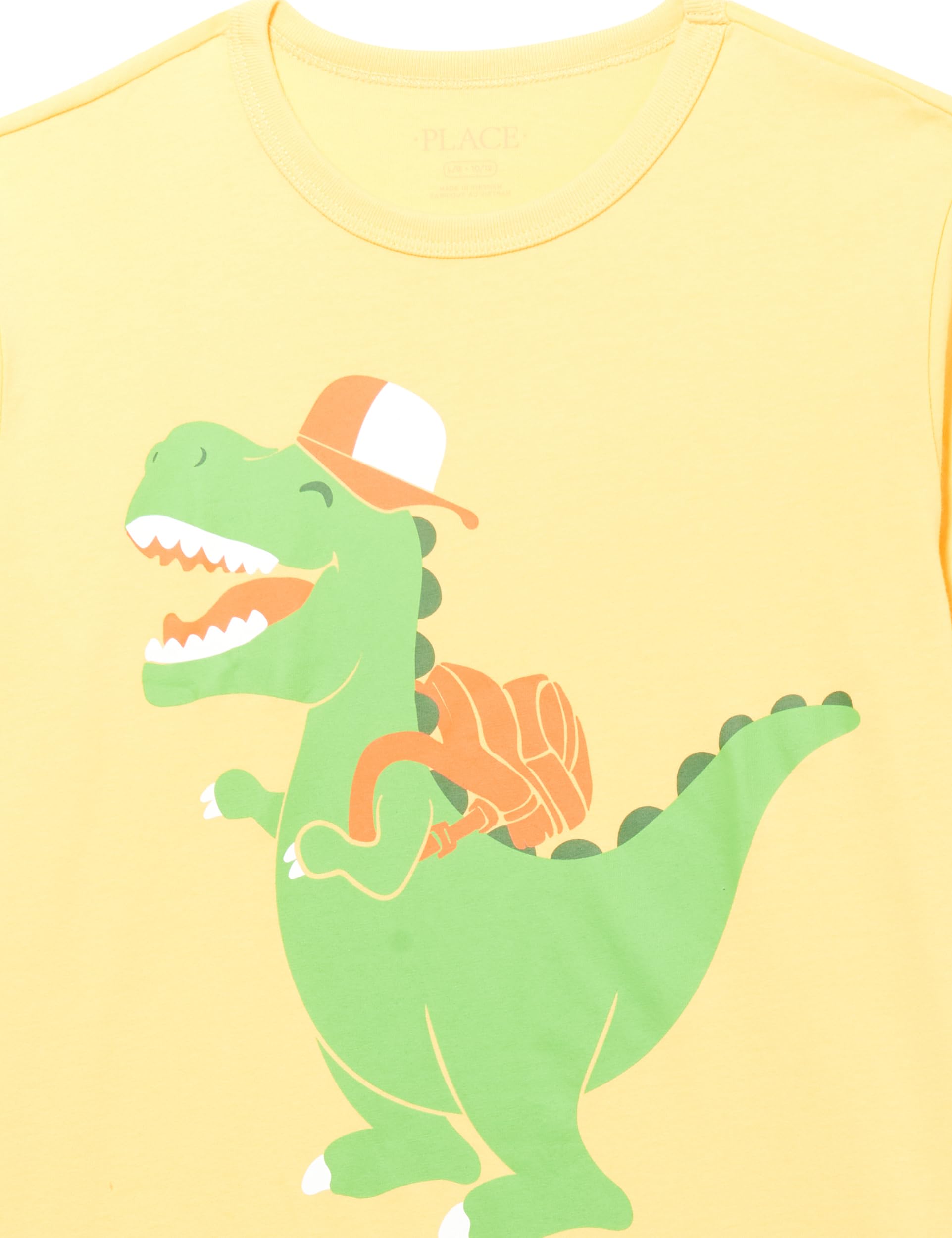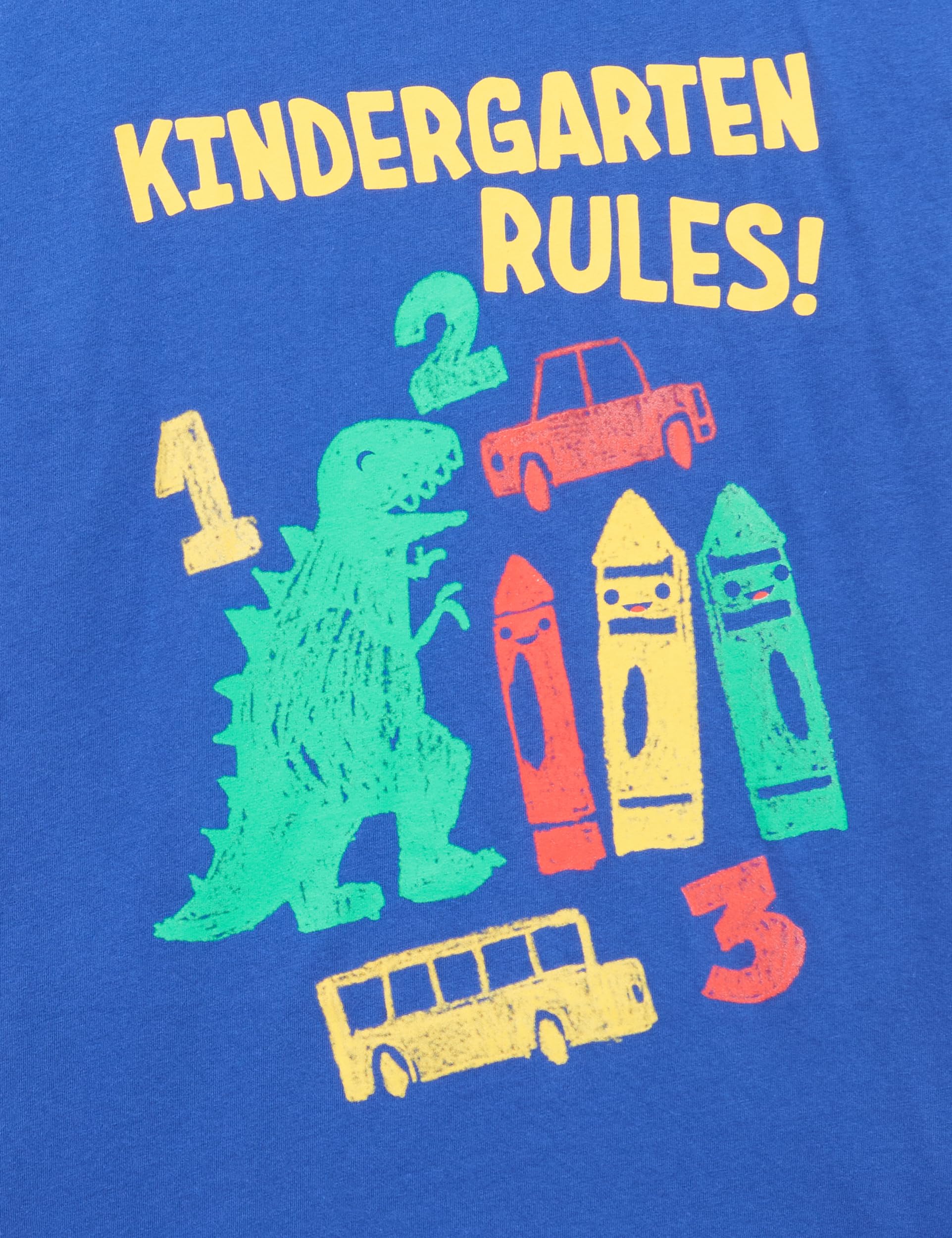 MULTIPACK — 2-pack of graphic t-shirts: 1 style with 'Kindergarten Rules!' with dino, school bus and crayons graphic design at front; 1 style with dino and backpack graphic design at front