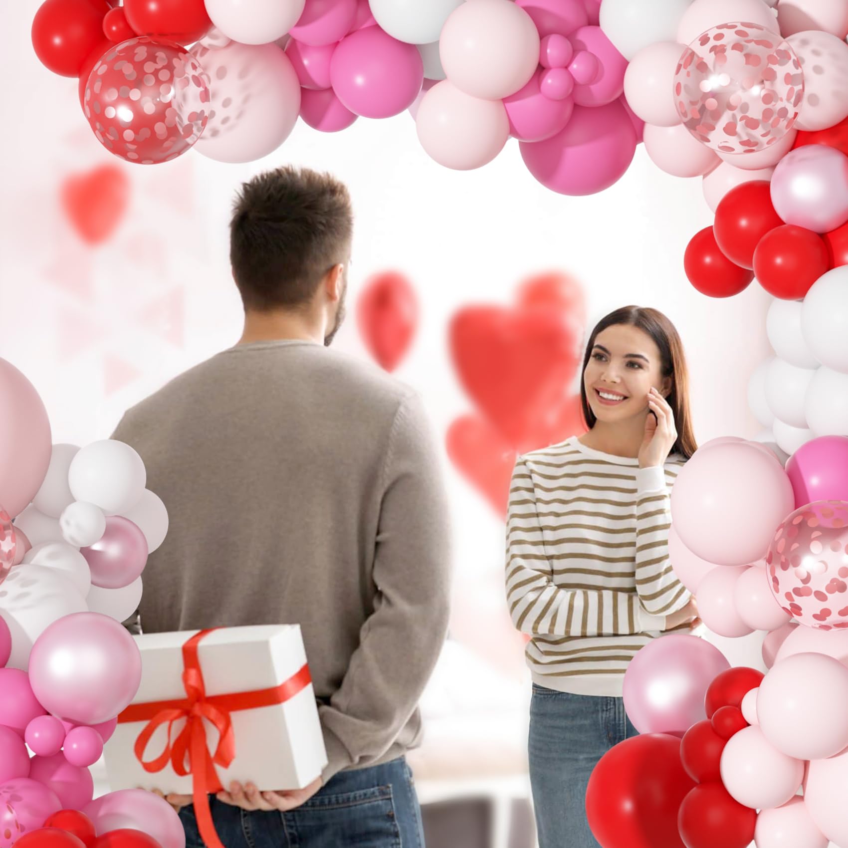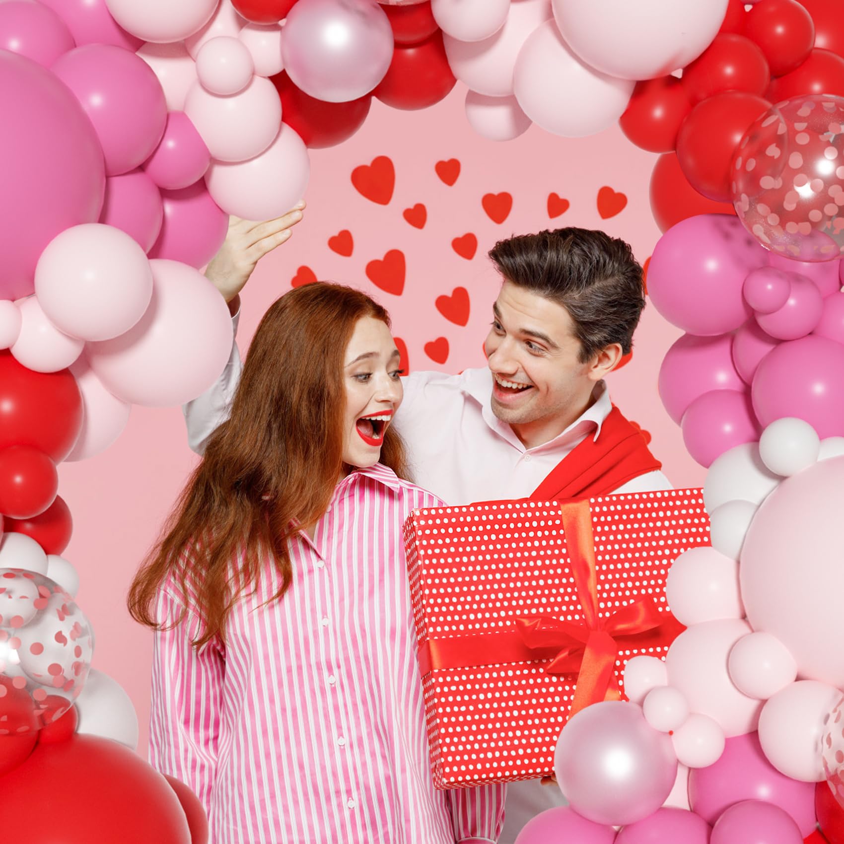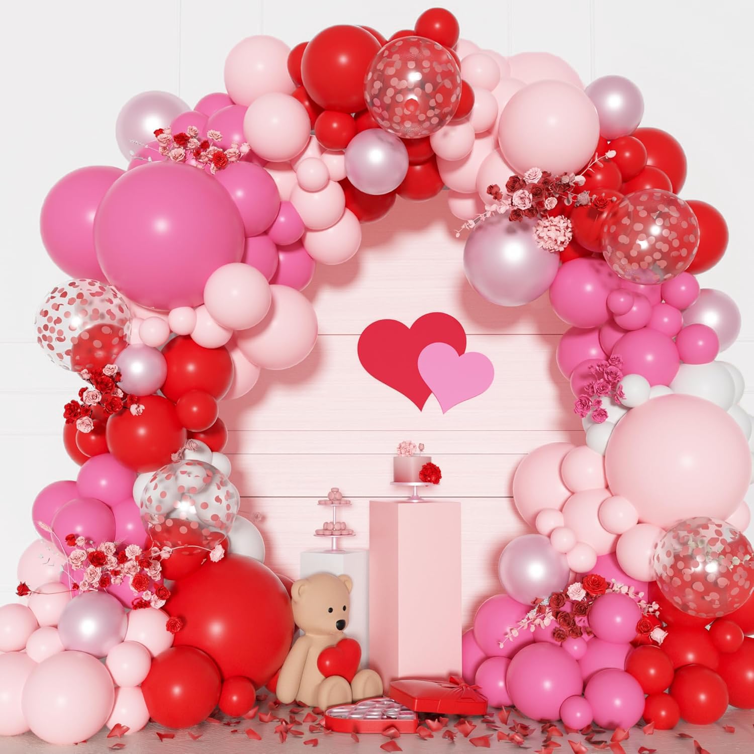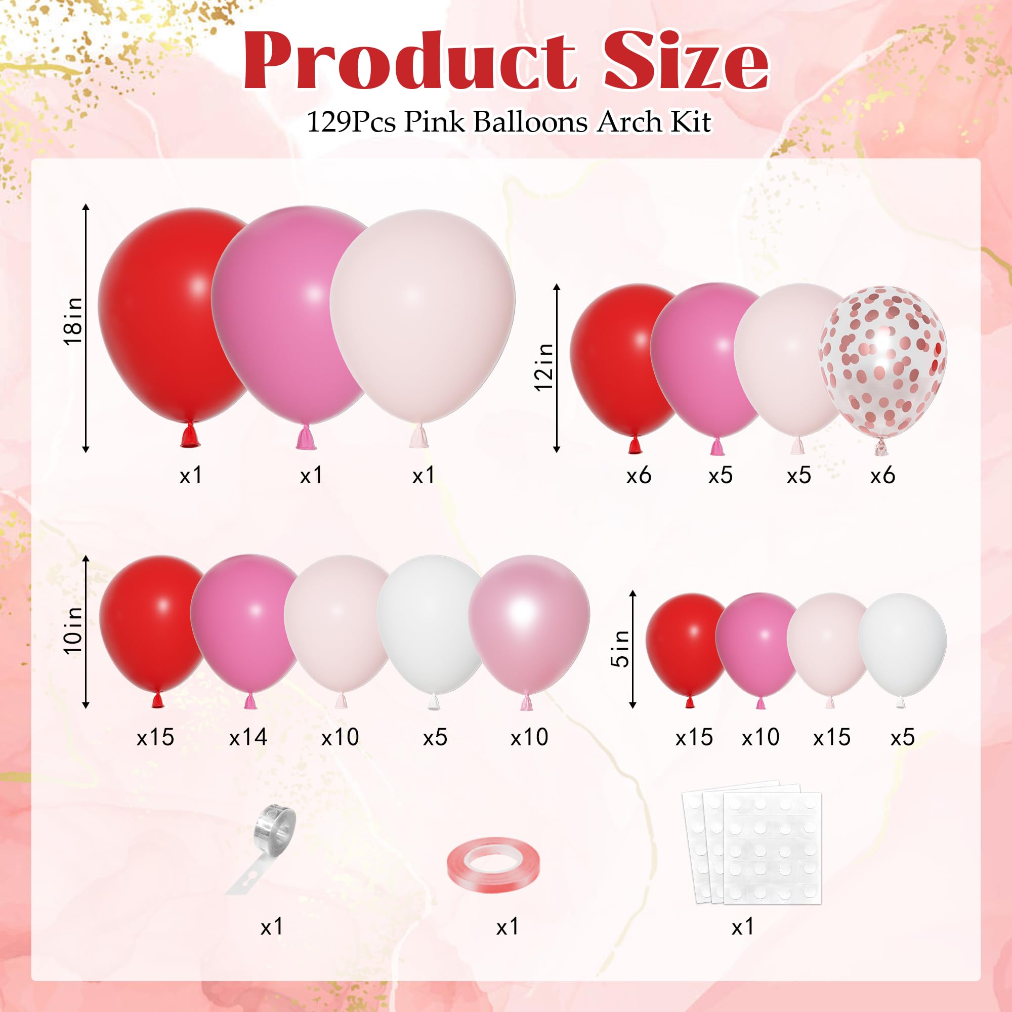 Valentines Day Balloons: Includes 3pcs 18in balloons(red/ rose red/ pastel pink), 23pcs 12in latex/confetti balloons(red/ rose red/ pastel pink), 100pcs 10/5in valentine balloons(red/ rose red/ pastel pink/ white/ pearl pink), 3pc balloon tools