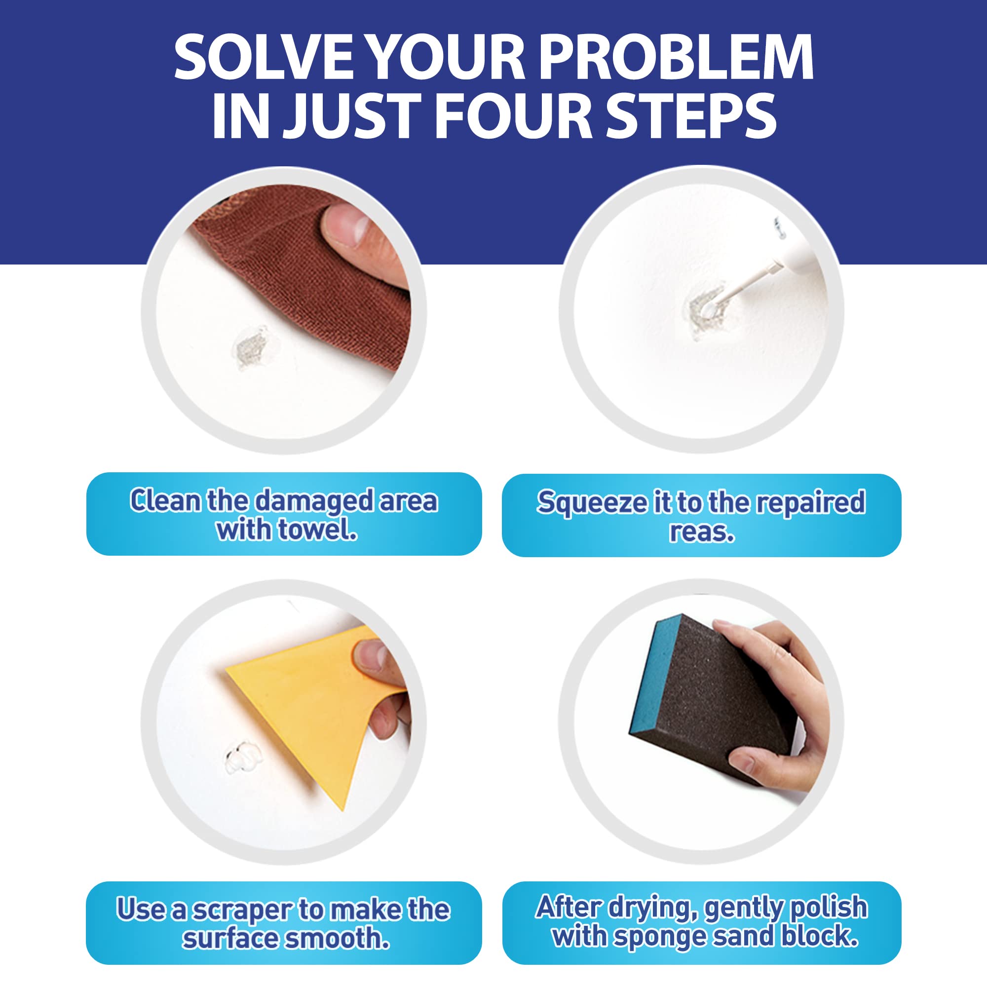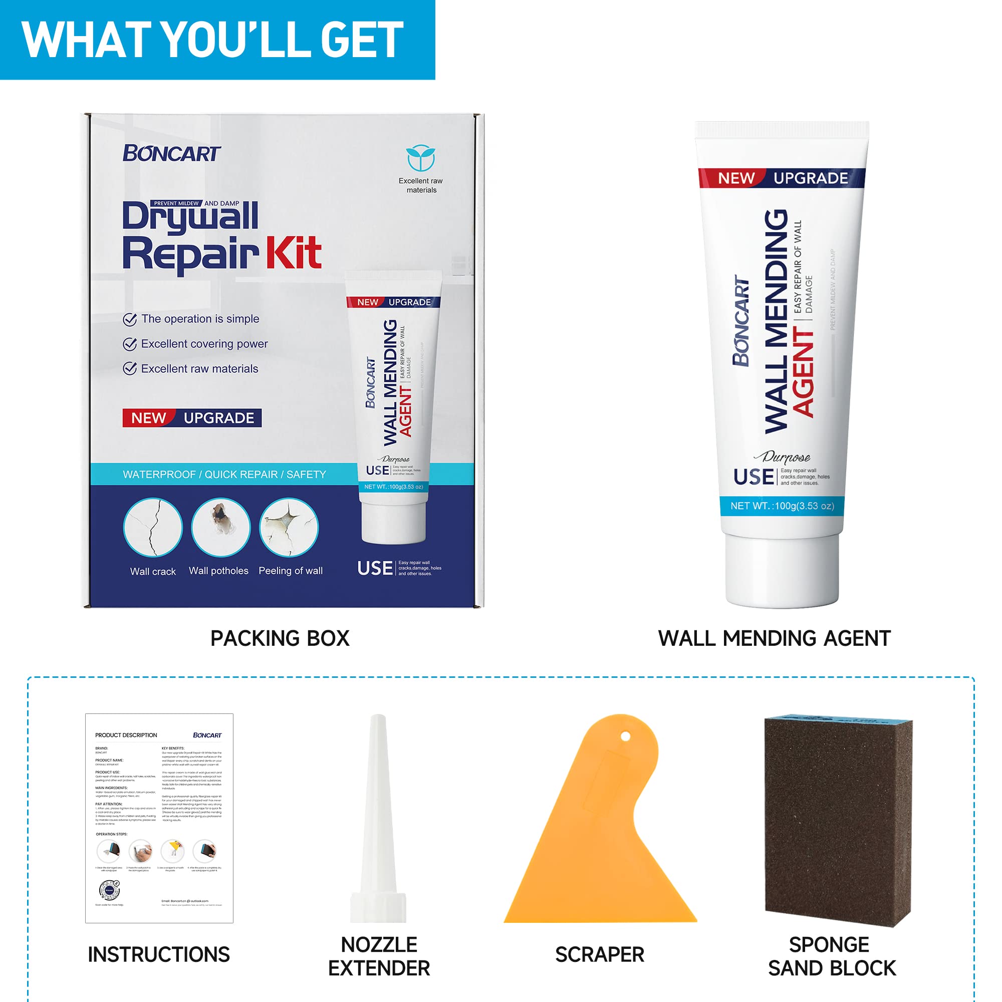 Drywall Repair Kit:The drywall repair kit includes 1x Wall mending agent (100g), 1x Nozzle Extender, 1x Scrapers, and 1x Sanding Sponge.