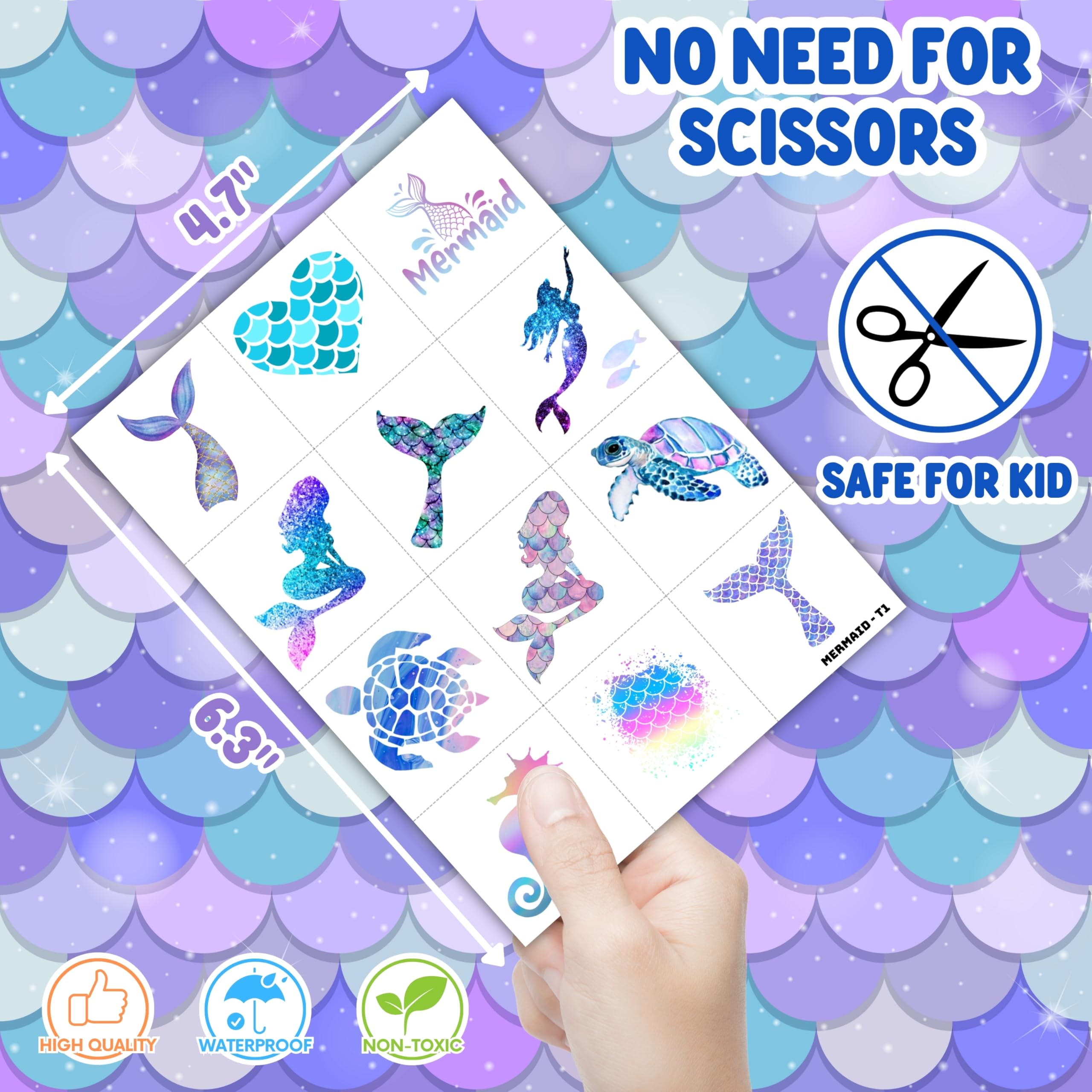 🎉【PERFECT PRE-CUT TATTOOS FOR THEMED MERMAID DECORATIONS】: Mermaid pre-cut temporary tattoo stickers include 8 sheets, featuring 96 adorable and unique designs. These tattoos are perfect for party favors, holiday-themed small gifts, and fun surprises. Each sheet measures 16 x 12 cm (6.3 x 4.7 inches)—a perfect size for kids! Thanks to the pre-cut perforated lines, you can easily tear them apart by hand—no scissors needed!