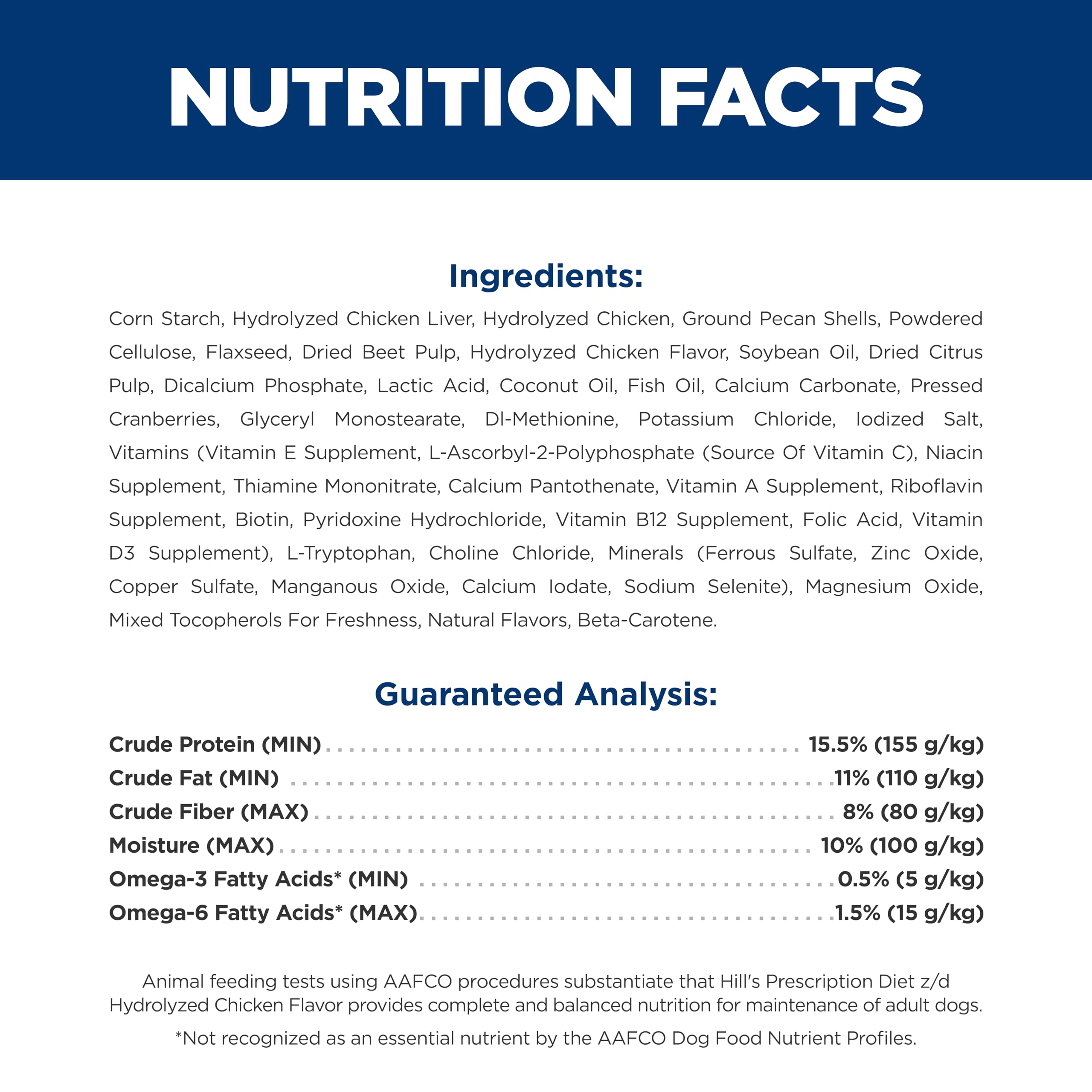 Hill’s Prescription Diet z/d Hydrolyzed Dry Dog Food is a highly digestible, great-tasting clinical nutrition formulated to help avoid skin and digestive signs of adverse food reactions in dogs. Made without additives known to cause food allergies. Its high digestibility supports easy nutrient absorption and meets the nutritional needs of adult dogs. Formulated with Hill’s breakthrough ActivBiome+ Digestion a proprietary blend of prebiotic fibers, which is clinically shown to rapidly activate the gut microbiome to support digestive health and overall well-being. This nutrition is clinically shown to firm loose stool in 3 days. It contains omega-3 and -6 fatty acids. Additionally, it includes clinically proven antioxidants to help support a healthy immune system. Formulated to promote a urinary environment that reduces the risk of developing struvite and calcium oxalate crystals. Made in the USA with global ingredients you can trust. Developed by Hill’s nutritionists and veterinarians. Veterinarians can provide additional guidance on how Hill’s Prescription Diet products can be fed long-term to help support overall well-being.