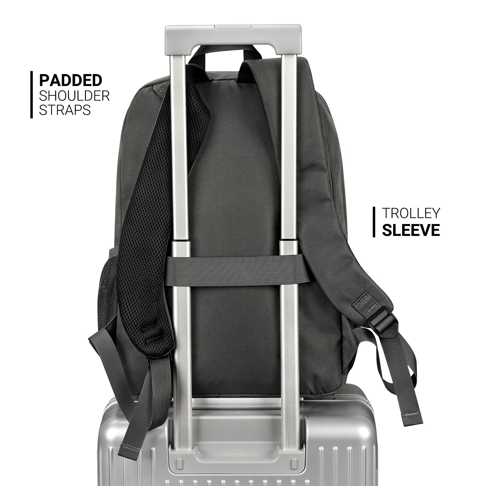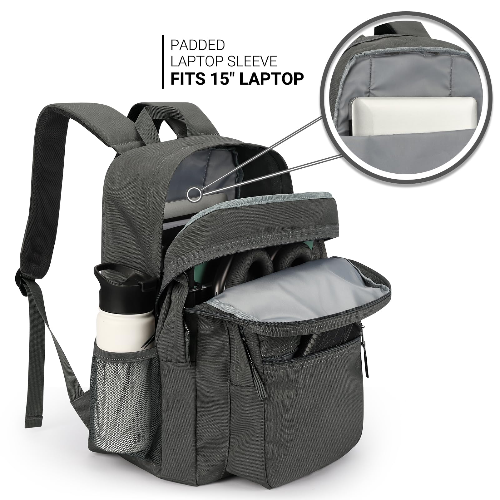 Convenient Storage Backpack: Our unisex laptop backpack features two main compartments, including a dedicated laptop sleeve for up to 15.6" devices. It also boasts a discrete front stash pocket, a utility pocket with an integrated organizer, and an additional external zippered pouch for quick access. Plus, two side pockets accommodate various water bottle sizes.