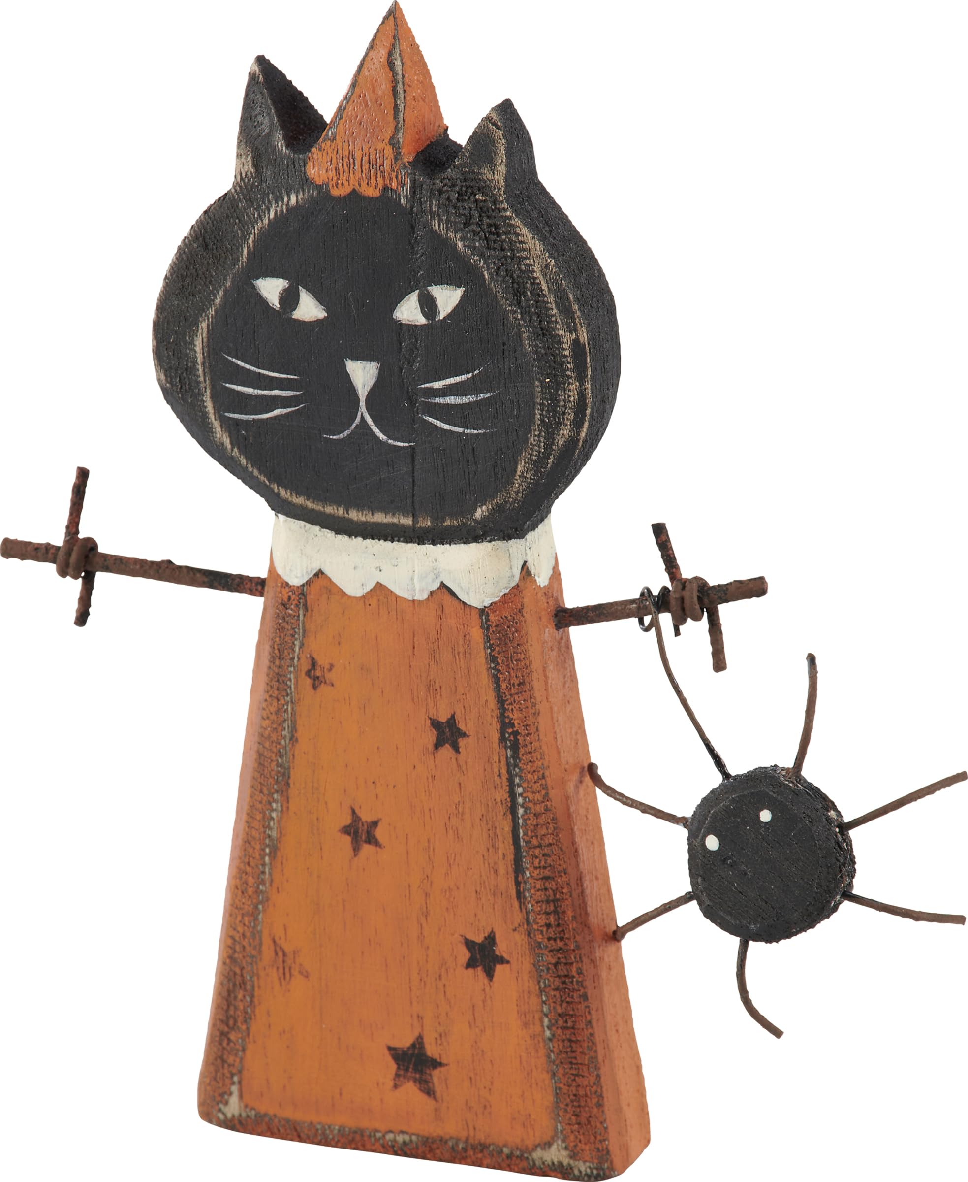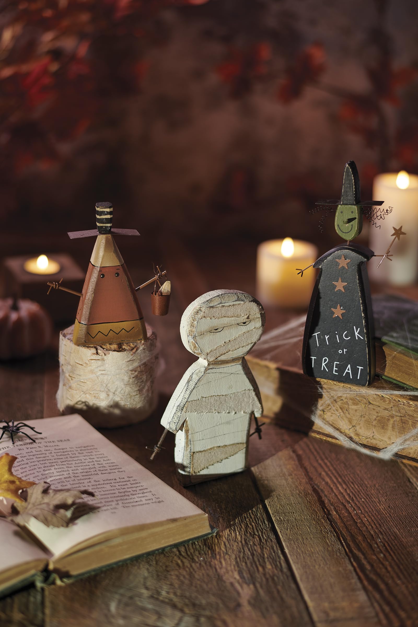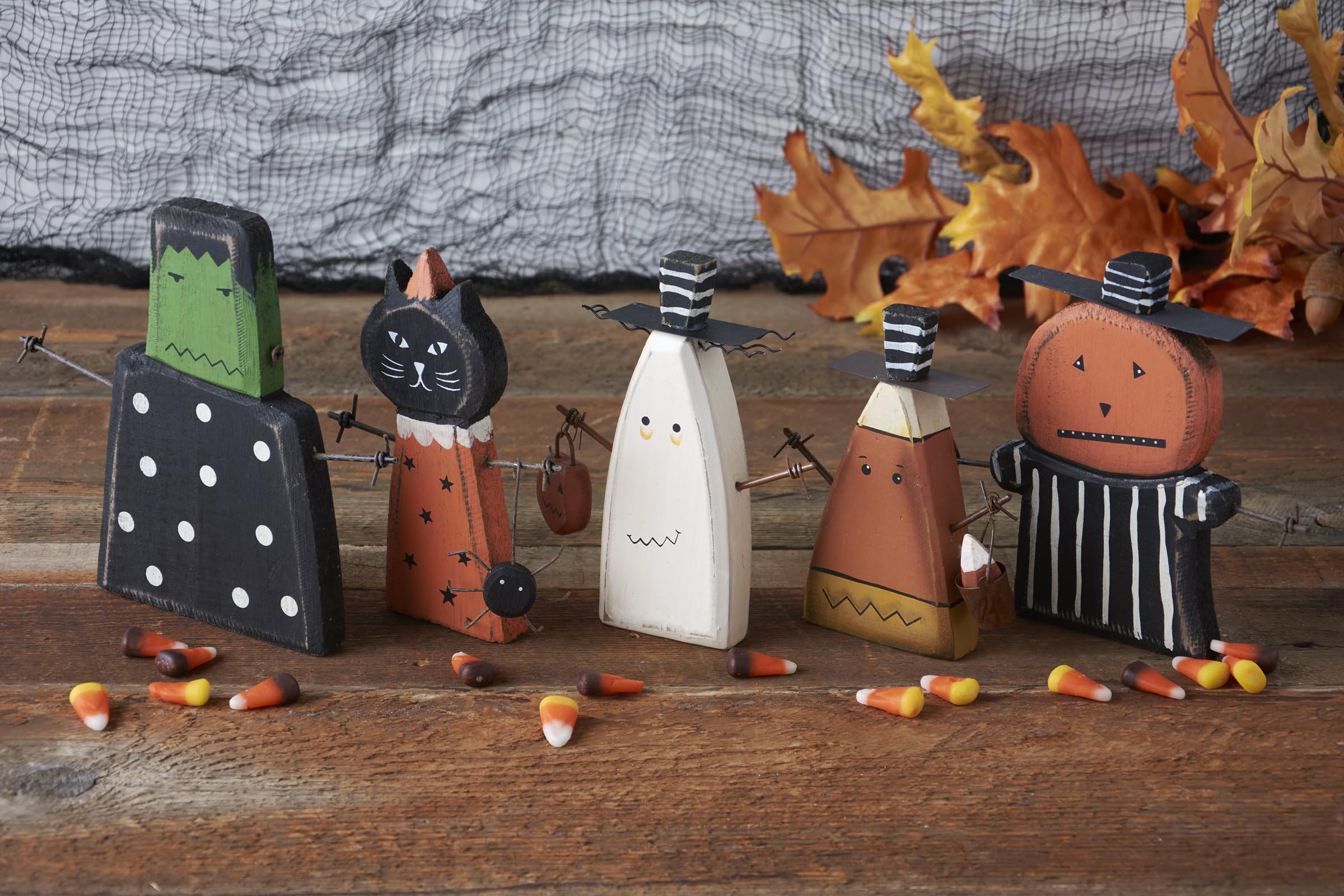 A wooden sitter from our Halloween Collection displaying a charming candy corn character dressed for trick or treating that is recreated from an original hand carved and painted piece. Halloween sitter features twisted wire and painted accents with distressed details to create a handmade feel. Candy corn man design also features a metal treat pail holding a wooden candy corn. Our Candy Corn Man sitter is designed to free-stand alone on flat surface for easy display. A rustic Halloween home accent that easily adds seasonal style to any home or work space.
