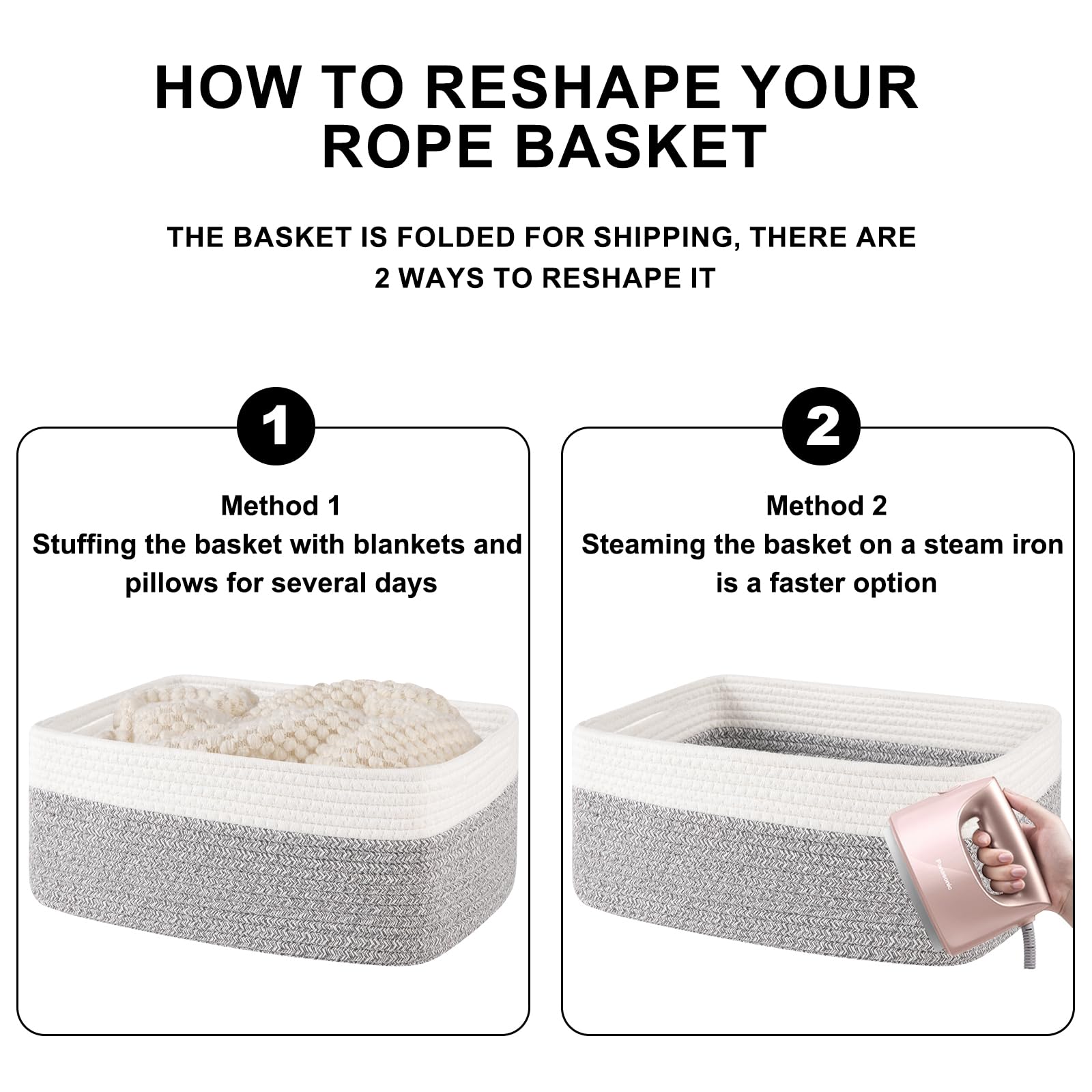 Note: OIASKET gift baskets arrive folded. Upon receiving the basket, we recommend you first stuff the basket with clothes or towels to regain its shape. for quicker shaping, conside using a steam iron. Washable:These organizer baskets can be washed by hand or machine with gentle detergent