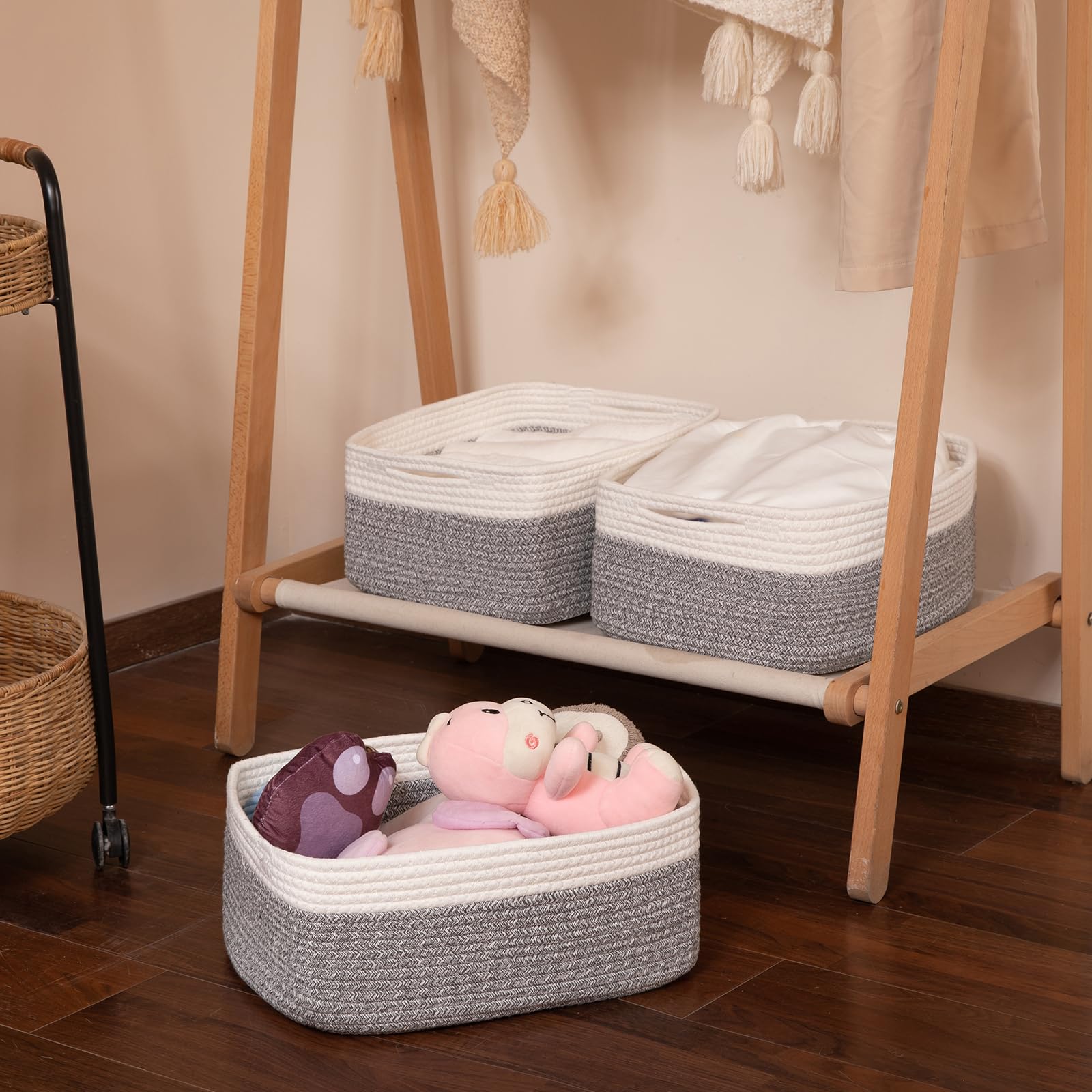 Soft and Durable: Our shelf basket is hand-stitched from high-quality natural cotton rope that's ultra soft, durable, and baby-friendly, with no odor or sharp edges. Great for nurseries and closet organization. Seamless design, not easy to tear