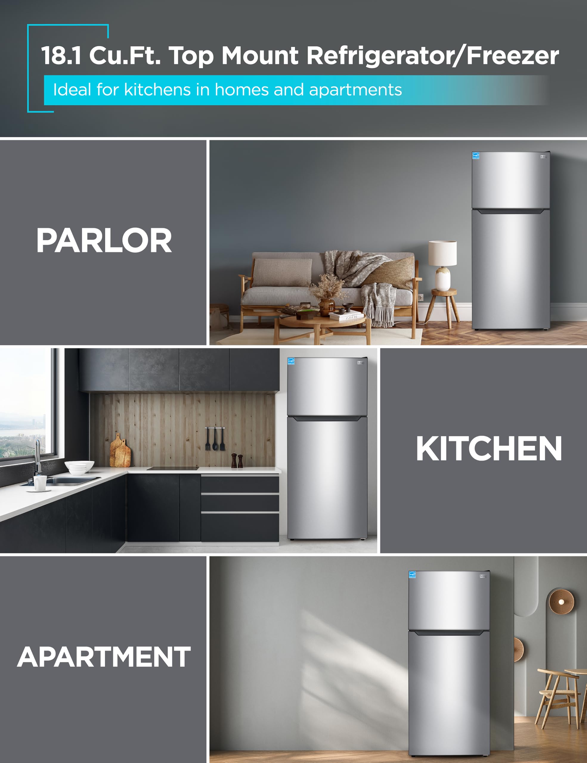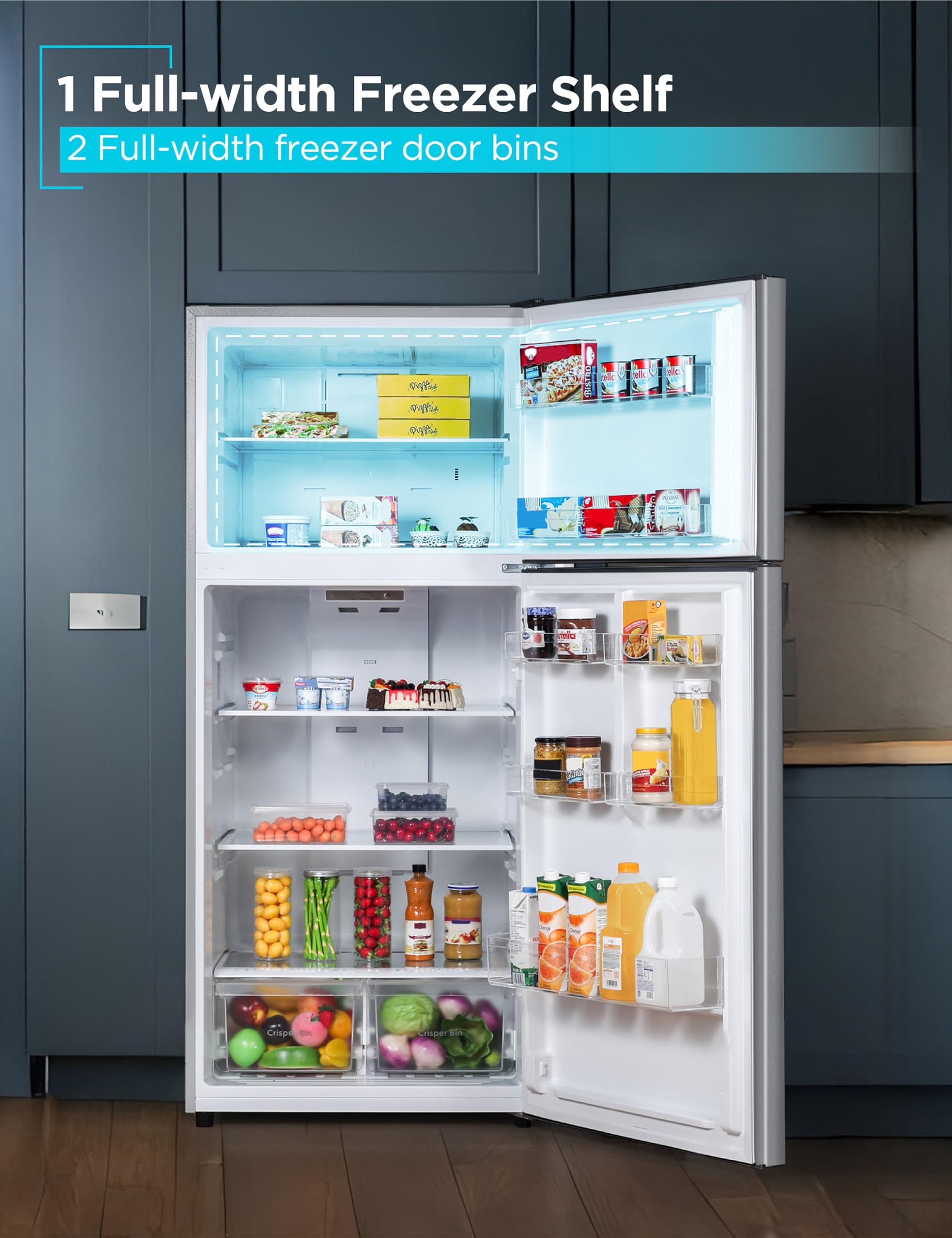 Spacious 18.1 Cu. Ft. Capacity: This full size refrigerator with freezer provides ample space for your fresh and frozen foods. Top freezer refrigerator is ideal for kitchens in homes and apartments