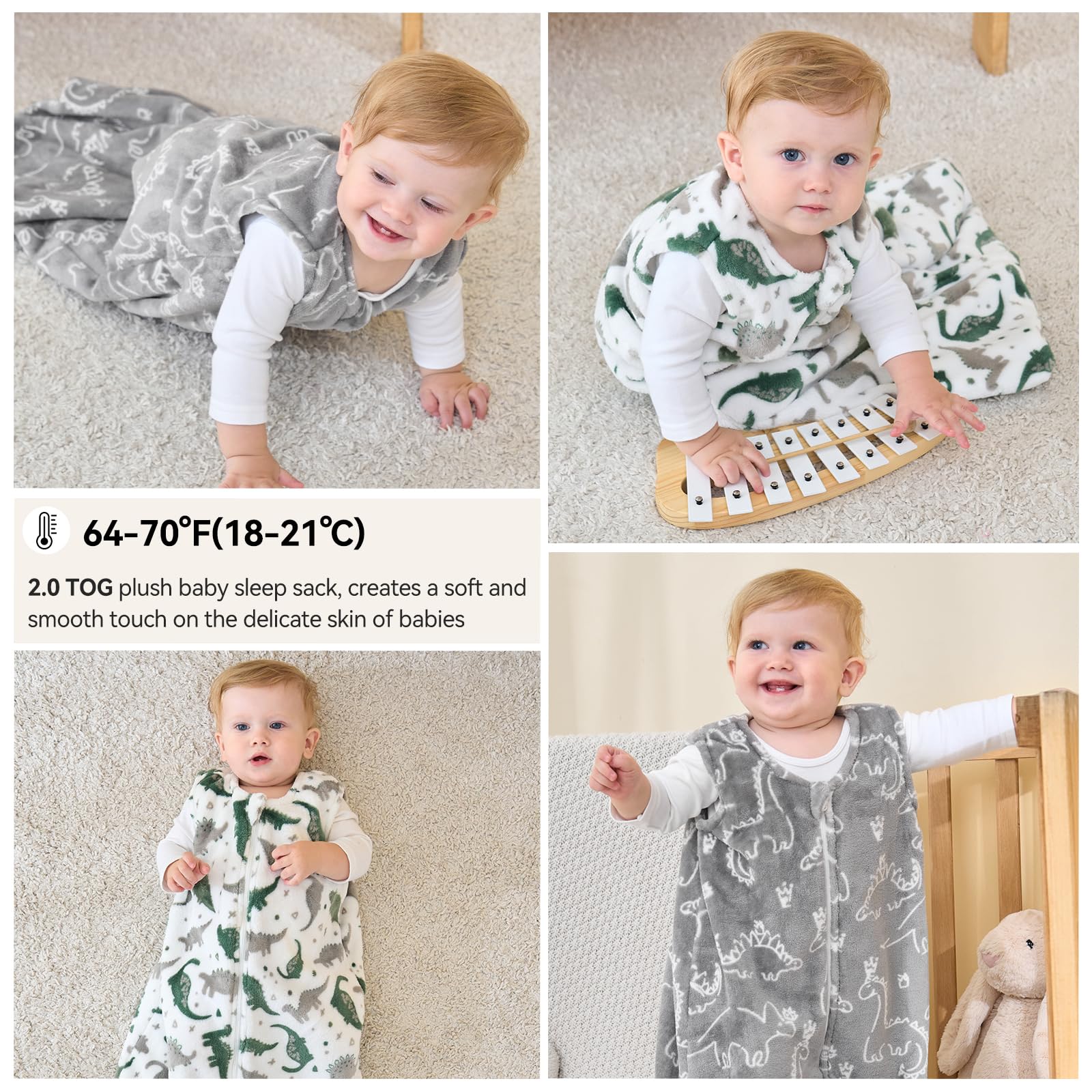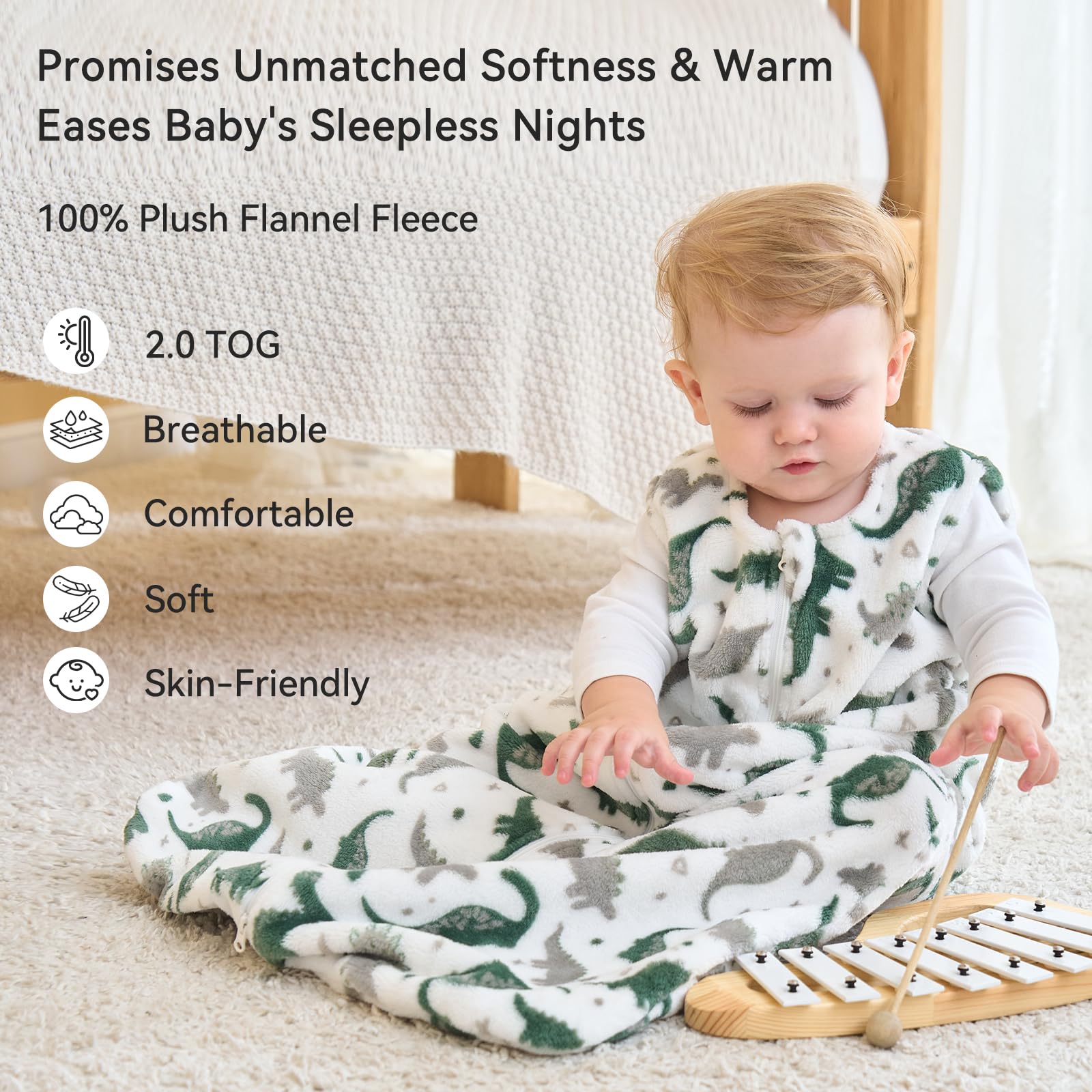 Softer & Warmer - Our 2.0 tog sleep sack is suitable for indoor temperatures of 64-70°F (18-21°C) during the fall and winter. This flannel sleep sack has a fine, soft surface fleece with a delicate, rich feel and a soft, while the interior fleece is soft and long, helping your baby lock in the warmth.