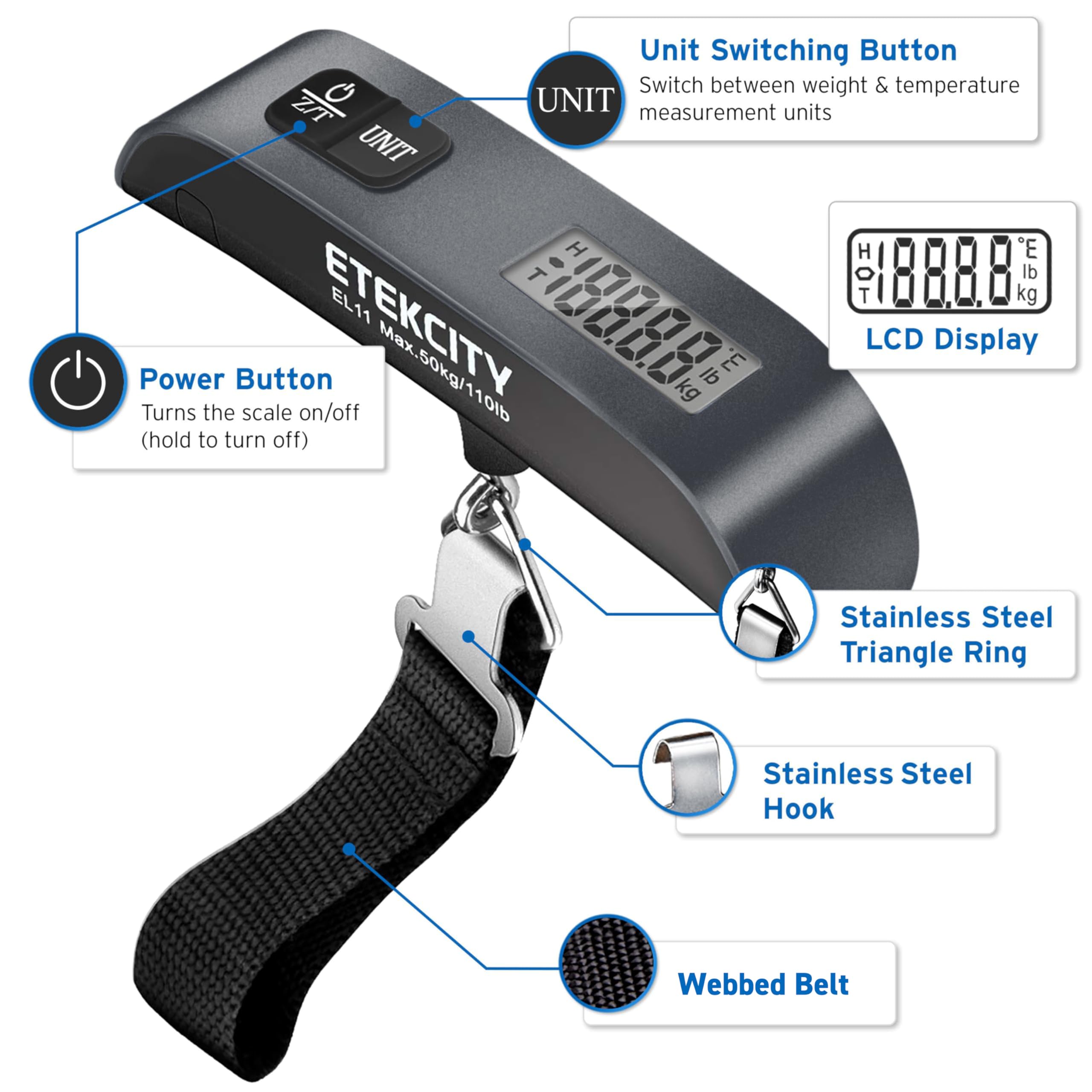 Travel Smart, Avoid Overweight Fees The Etekcity Luggage Scale is your travel essentials, offering precise measurements up to 110lbs (50kg). Its compact design makes it easy to carry, and the simple one-button operation ensures you can check your luggage weight quickly and easily, preventing last-minute packing hassles. Travel with confidence and avoid surprise chargesโlightweight, reliable, and perfect for any journey. Features: High Capacity, Precise Measurement: Weighs up to 110lbs (50kg) with 0.1lb (50g) accuracy. Compact & Lightweight: Small, portable design that fits easily into your bag, making it ideal for travel or on-the-go use. Clear LCD Display: Get your weight reading in just 2 seconds, with clear alerts for overweight and low battery. Energy-Efficient: Auto shut-off feature after 2 minutes of inactivity to save battery life. Durable & Comfortable Grip: Ergonomic, sturdy handle ensures a secure and comfortable hold, even with heavy luggage. Versatile for All Types of Travel: Perfect for both checked bags and carry-onsโsuitable for all your travel needs. Specifications๏ผ Room temperature display Esay-to-read LCD display Capacity: 110 lb / 50 kg Icrement: 0.1 lb / 50 g Battery: 1 x 3 v CR2032(lithium) Low battery and overload indication Package Contents๏ผ โ1 x luggage scale 1 x 3 v CR2032(lithium) 1 x manual