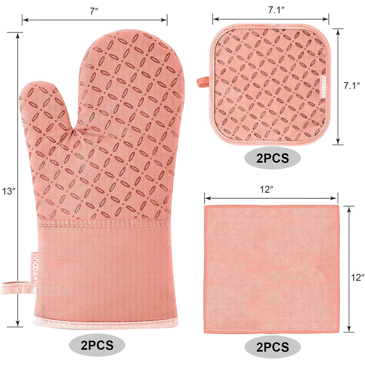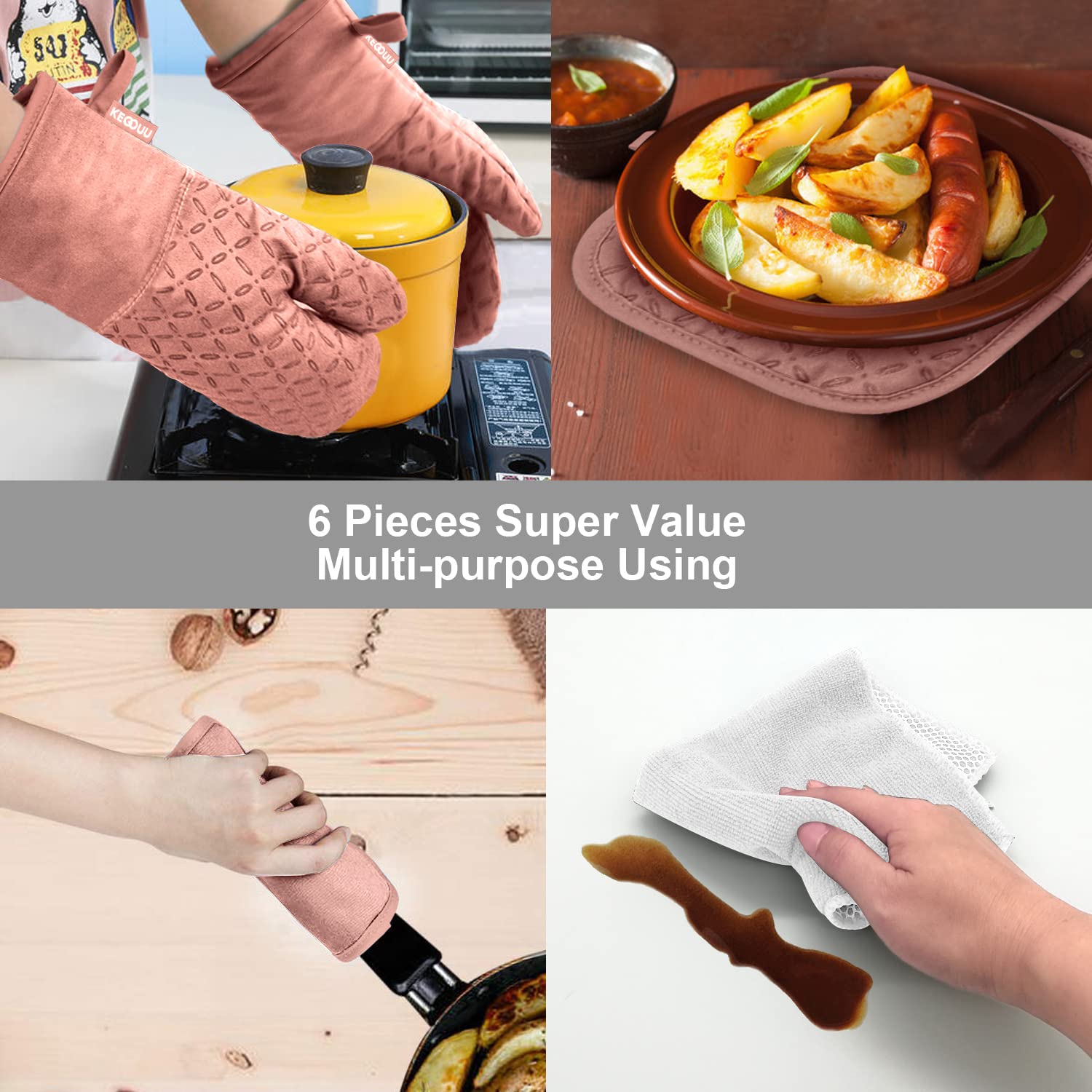 6 PIECE KITCHEN ACCESSORY SETS: -Our oven mitts and pot holders set including 2pcs non-slip surface silicone kitchen oven gloves (7X13in), 2pcs pot holders (7X7in) and 2 kitchen towels (12x12in), fit for indoor cooking, baking,BBQ or outdoor grilling. Also the oven mitt set is a perfect ideal kitchen gift for women, men, baker, cooker