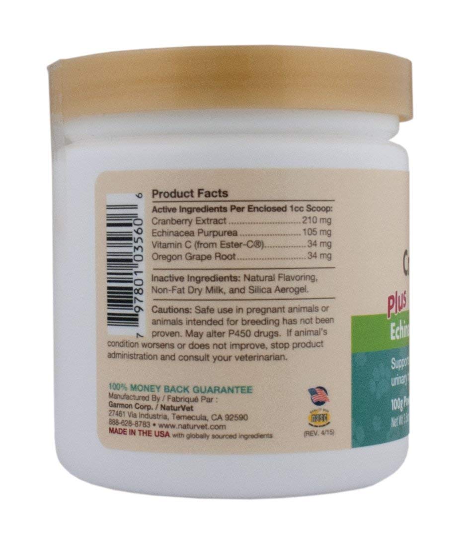 NaturVet Cranberry Relief Plus Echinacea Helps Support a Healthy Urinary Tract. Plus Echinacea to Provide Essential Immune Support to Help Maintain Overall Health. Tasty, Powder 50gm for Dogs and Cats Over the Age of Six Weeks. Give Recommended Amount Twice a Day for One to Three Weeks for Maintenance Give No More Than Twice Weekly. Active Ingredients per Enclosed 1cc Scoop: Cranberry Extract, Echinacea Purpurea, Vitamin C and Oregon Grape Root. All NaturVet Products are Veterinarian Formulated and Manufactured in the USA in an FDA Audited, cGMP Compliant Facility with a 100% Satisfaction Guarantee.