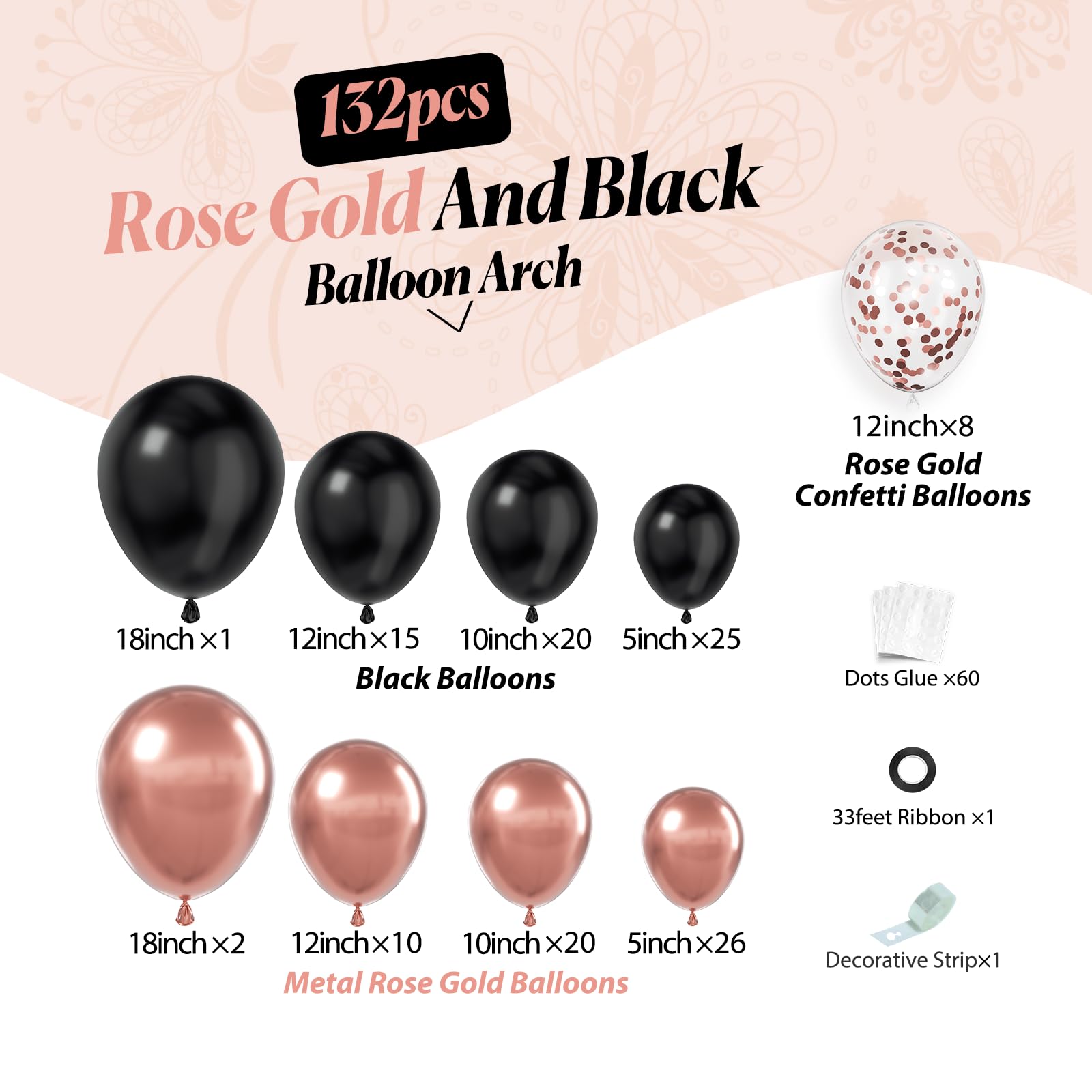 Package Include: The132pcs rose gold and black balloon arch kit include 61pcs black balloons(18 inchx1, 12 inchx15, 10 inchx20, 5 inchx25), 58pcs metallic rose gold balloons(18 inchx2, 12 inchx10, 10 inchx20, 5 inchx26), 12 inch rose gold confetti balloonsx8, glue dotsx3, ribbonsx1, decorative stripx1