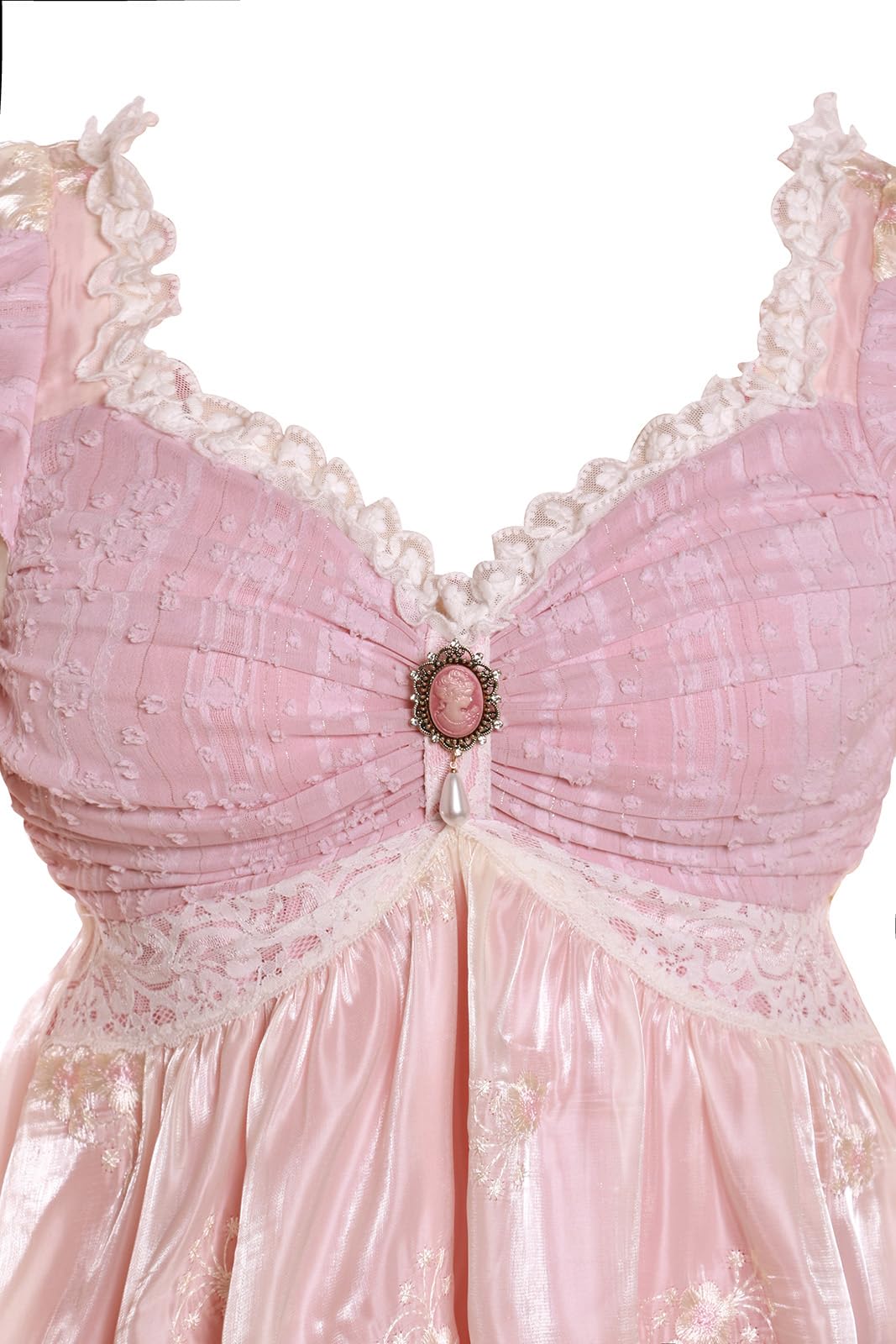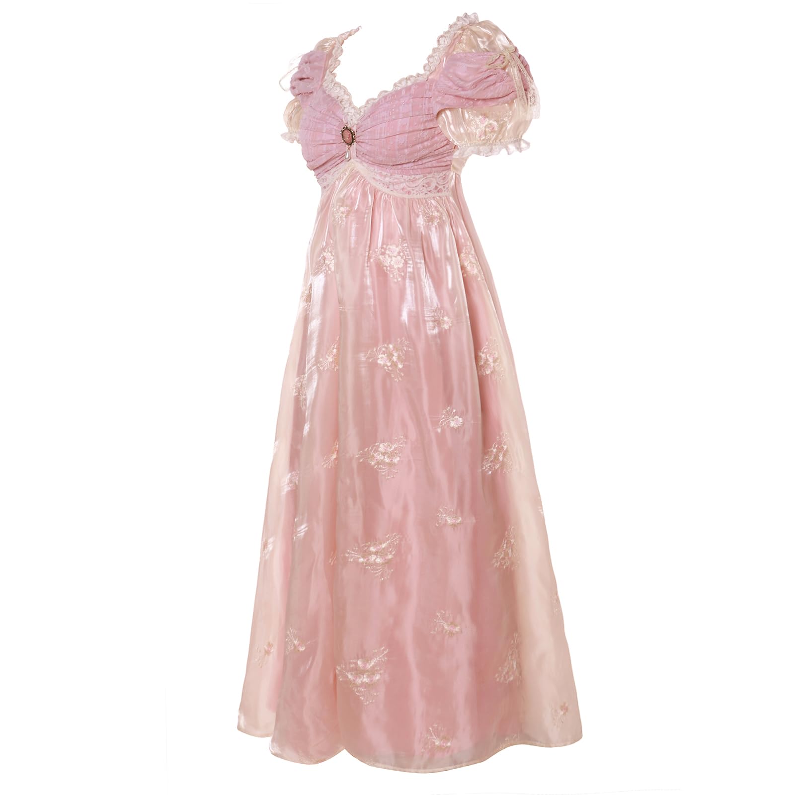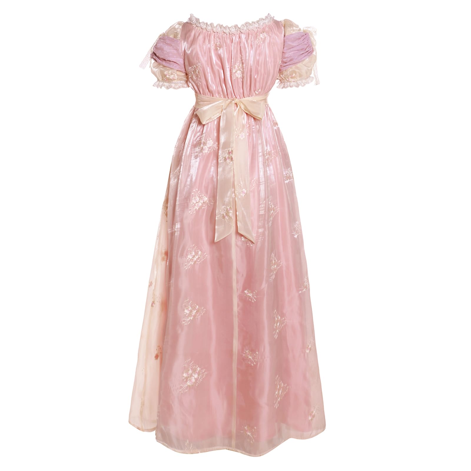 Intricate Details:The regency era dress adorned with beautiful floral embroidery, Patchwork with lace and textured fabrics, double layered design, adding sophistication and a touch of regal romance, perfect for a Jane Austen dress or Victorian ball gown.