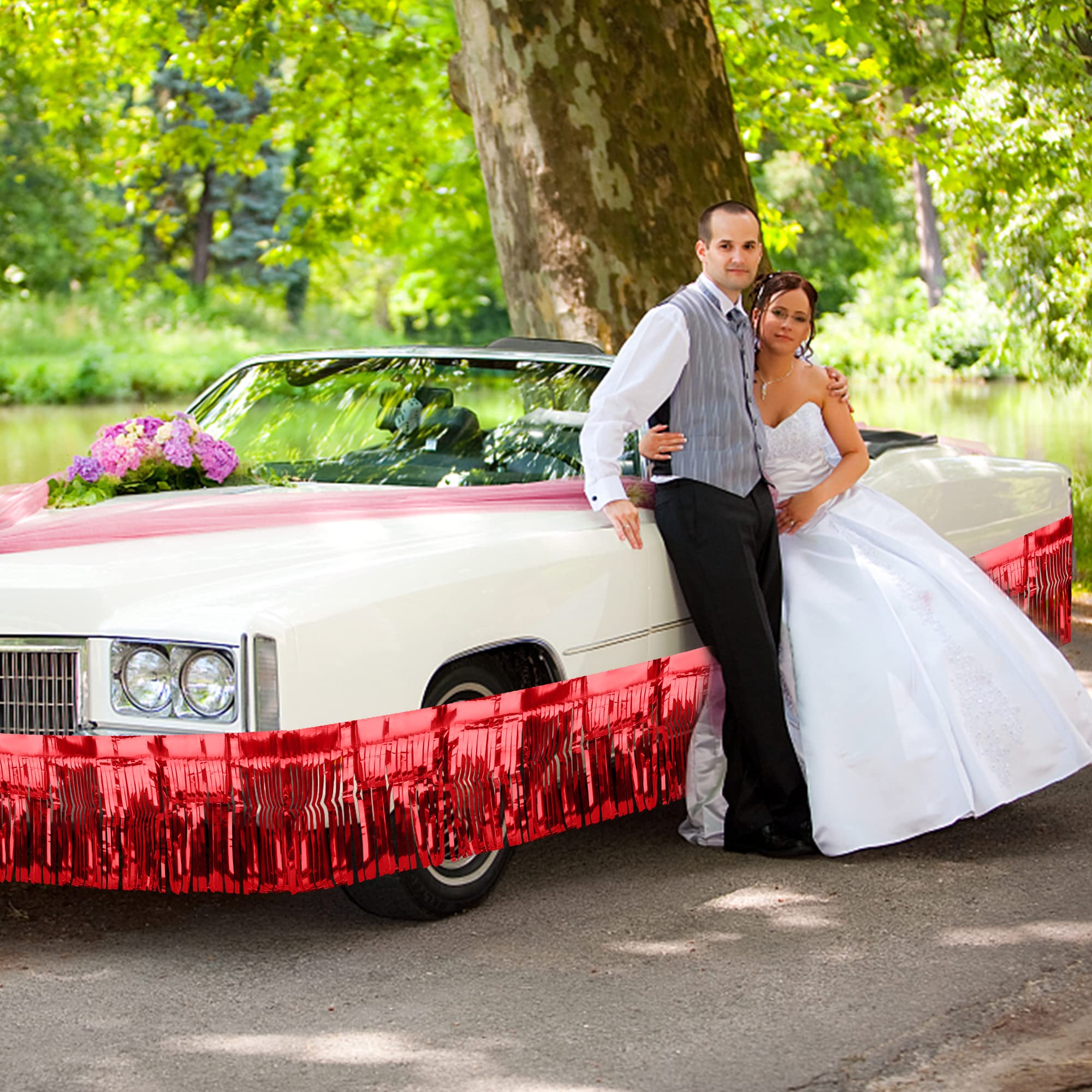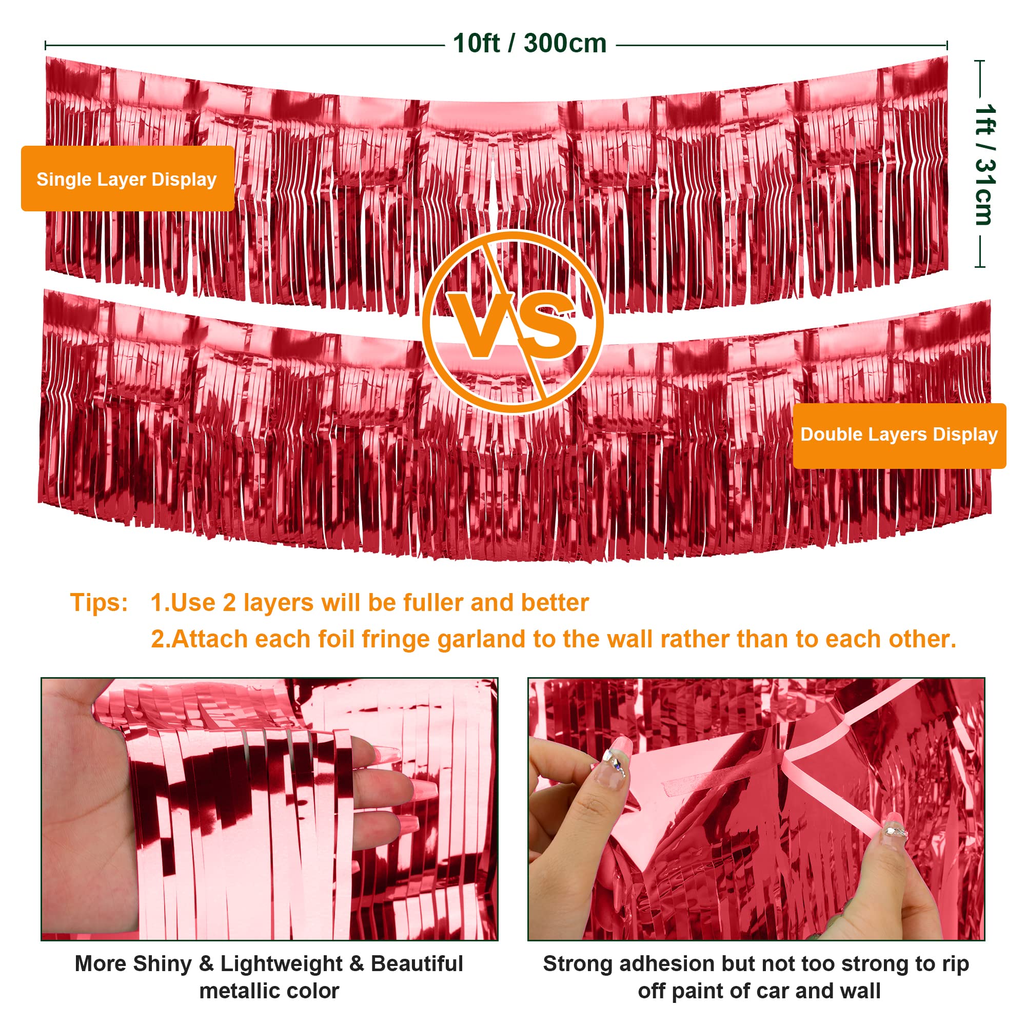 【PACKAGE INCLUDES】Comes with 4 packs of RED foil, 10*1 ft/3*0.3m (L*W ), You can cut it into any size to meet your decoration needs. If you want parade float decoration to be colorful, fuller, thicker and looks better, it is better to use more than 2 packs of fringe float overlapping together. And tape each foil fringe garland on the car/wall, not on top of each other. With these festive metallic streamers, you can take your parade float decorations to the next level.