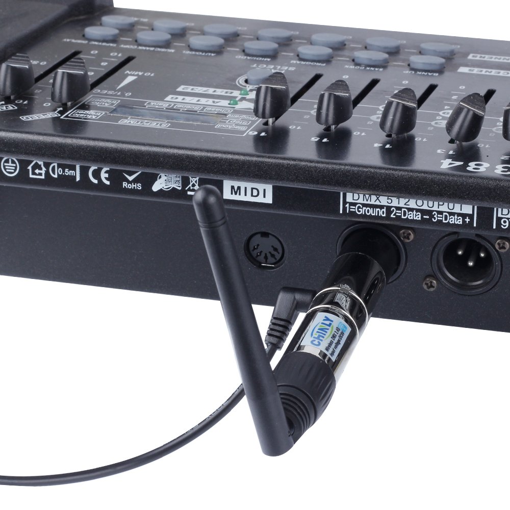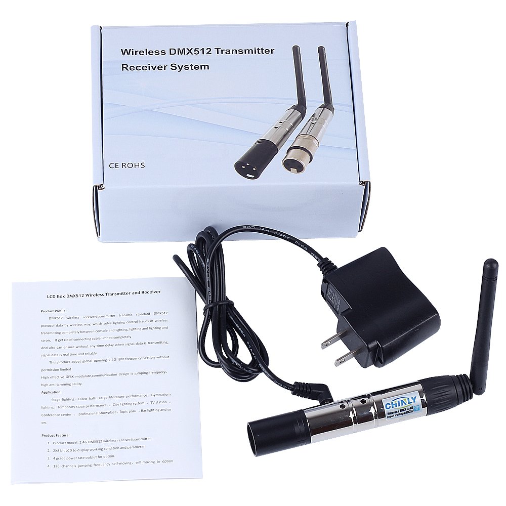 Specification: 1. 2.4G wireless DMX512 R / T 2.Work voltage: AC100-240V 3.Receive Sensitivity: -94dBm 4.Max transmitting power rate: 20dBm 5.DMX connector: 3pin male 6.Communication distance: 400M (visible distance) 7.Work frequency section: 2.4G ISM, 126 channels.frequency section 8.7 groups ID code settable,User can use 7 groups individual wireless net without any interfere. 9.Material: zinc alloy + plastic 10.Item size: L8.2 * W0.7 * H0.7in 11.Package weight: 6.3oz Establishing Communication: 1. Power on DMX512 wireless received board first and then following to power up the transmitted board. 2. Press “Key” button to set same ID value of transmitted board and received board. Please use different ID value if you need use more than 1 group wireless universals at same time in same place. 3. The red LED flashes when transmitter transmits DMX data by no interfered frequency section, then receiver changes communicated frequency section. Green LED flashes until received same ID value, the more DMX data, the faster the LED flashes. 4. Communication was established correctly. Package list: 1 x DMX wireless transmitter 1 x Adapter 1 x Specification