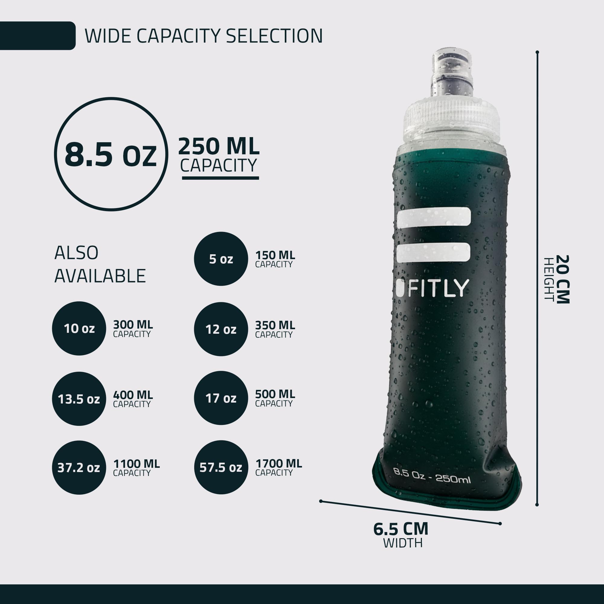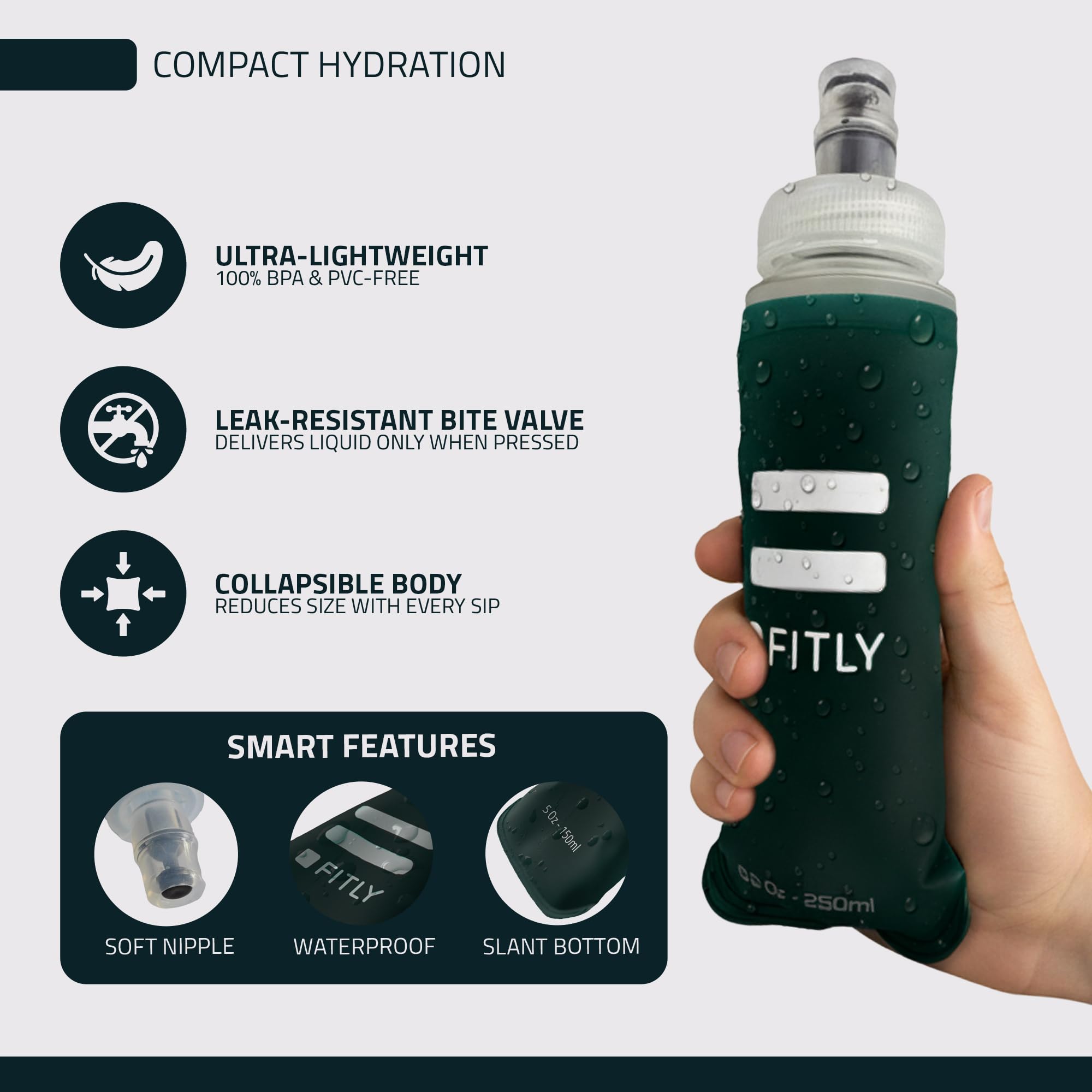 STAY LIGHT ON YOUR FEET: FITLYβs collapsible flask is purposely lightweight, ensuring you stay light on your feet and not weighted down by unnecessary bulk. At FITLY, reusability is deeply important to us, and our water bladder is no exception. Enjoy limitless use from our portable soft water bottle for running vest that is 100% BPA & PVC-free.