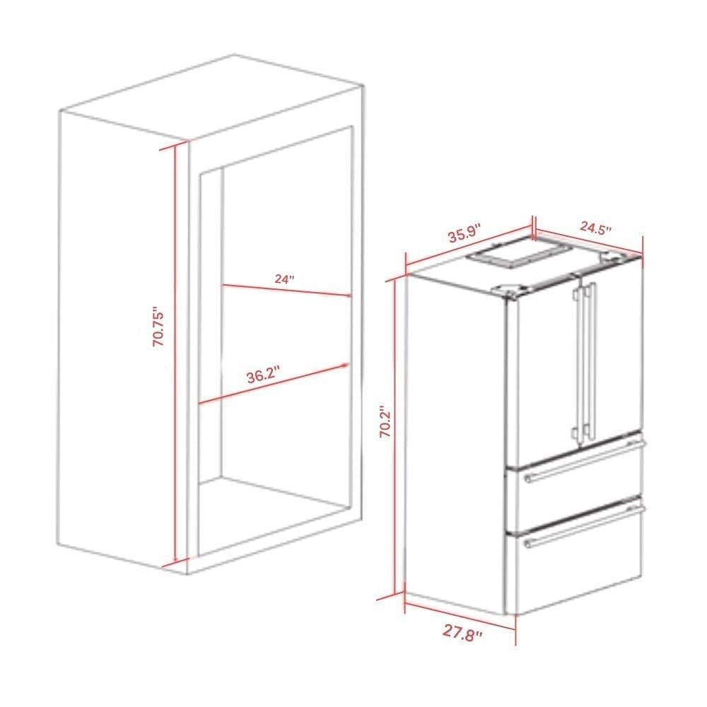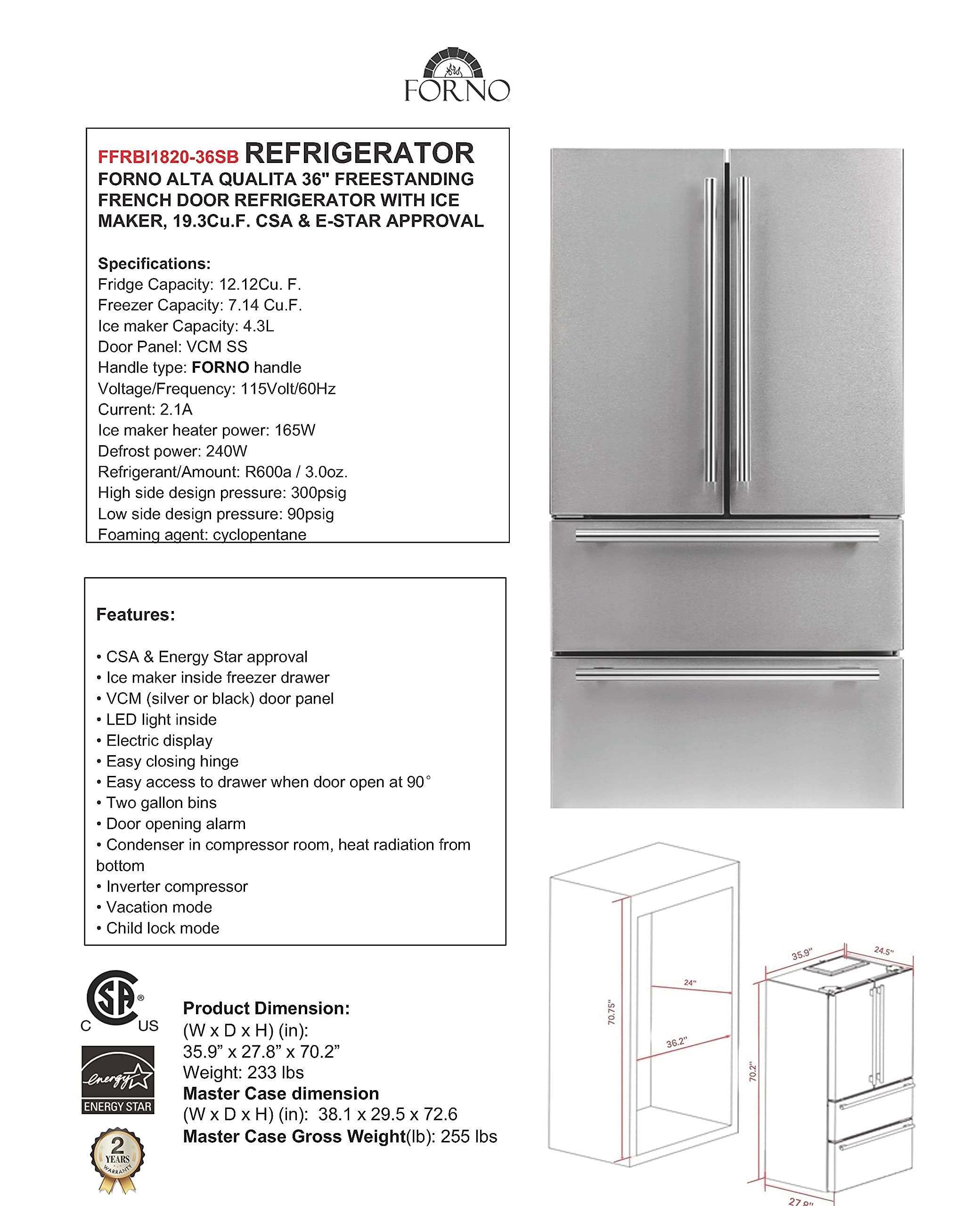𝐈𝐍𝐂𝐋𝐔𝐃𝐄𝐒: Forno offers this Refrigerator 2 Year Factory Parts and Labor Warranty. The Alta Qualita 36” Pro-Style Counter-Depth refrigerator Total Net Capacity: 19.2cu. Ft, Fridge Net Capacity: 12.1cu.ft, Freezer Net Capacity: 7.1cu.ft, 2.1 Amperage, 240 Wattage, 115 Volt 60 Hz, and CSA listings. standard dimensions (W x D x H) (in): 35.9” x 27.8” x 69.88” Product Net Weight: 233 lbs and Carton Dimension (W x D x H) (in): 38.1” x 29.5” x 72.6” Weight: 255 Lbs