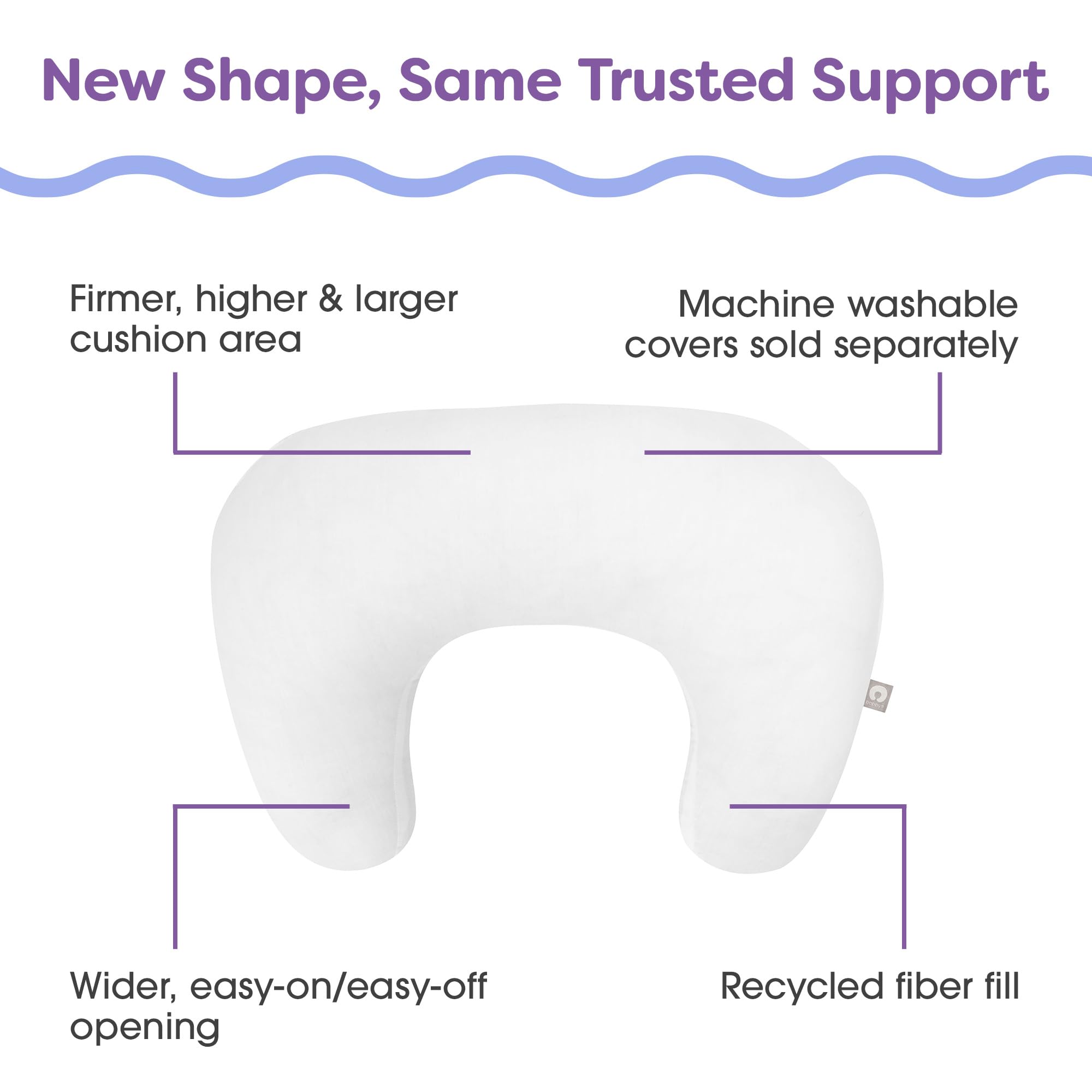 Introducing the New Boppy Nursing Pillow, your comfy, snuggly sidekick for feeding moments. This redesigned cutie, dreamed up by clever moms, gives your arms and back a break while keeping baby at the perfect level for breastfeeding and bottle feeding. Did you know the average nursing mom clocks over 35 hours a week feeding? Talk about a full-time job. But fear not, our Redesigned Boppy Nursing Pillow is here to save the day (and night), just as our Original Boppy Nursing Pillow has done for 35 years. With its updated, versatile design, you can cradle, cross cradle, or football hold with ease. This pillow’s got your back (literally) with its larger, firmer, flexible shape that hugs more body types comfortably, keeping baby close and positioned just right. It’s small enough to fit in your rocking chair or glider but big enough to deliver all the support you need. No wonder it’s been a registry must-have and a favorite among moms, dads, caregivers and lactation consultants alike for over three decades. The easy-on, easy-off, beltless design has a wider opening so you can pop it on with one hand—because what new mom or dad has two free hands? And no need to fret about inevitable spit ups and blow outs. The easy-zip, fashion-forward covers (sold separately) are machine washable and dryer-safe, and the pillow itself is wrapped in a water-repellant, protective liner. Filled with hypoallergenic, recycled fiber, it’s as carefree as it is cozy. Just remember, this pillow is for supervised awake-time only—no snoozing allowed! Trust Boppy to keep you and your baby comfy, happy, and oh-so-confident. Let’s make feeding time the best time.