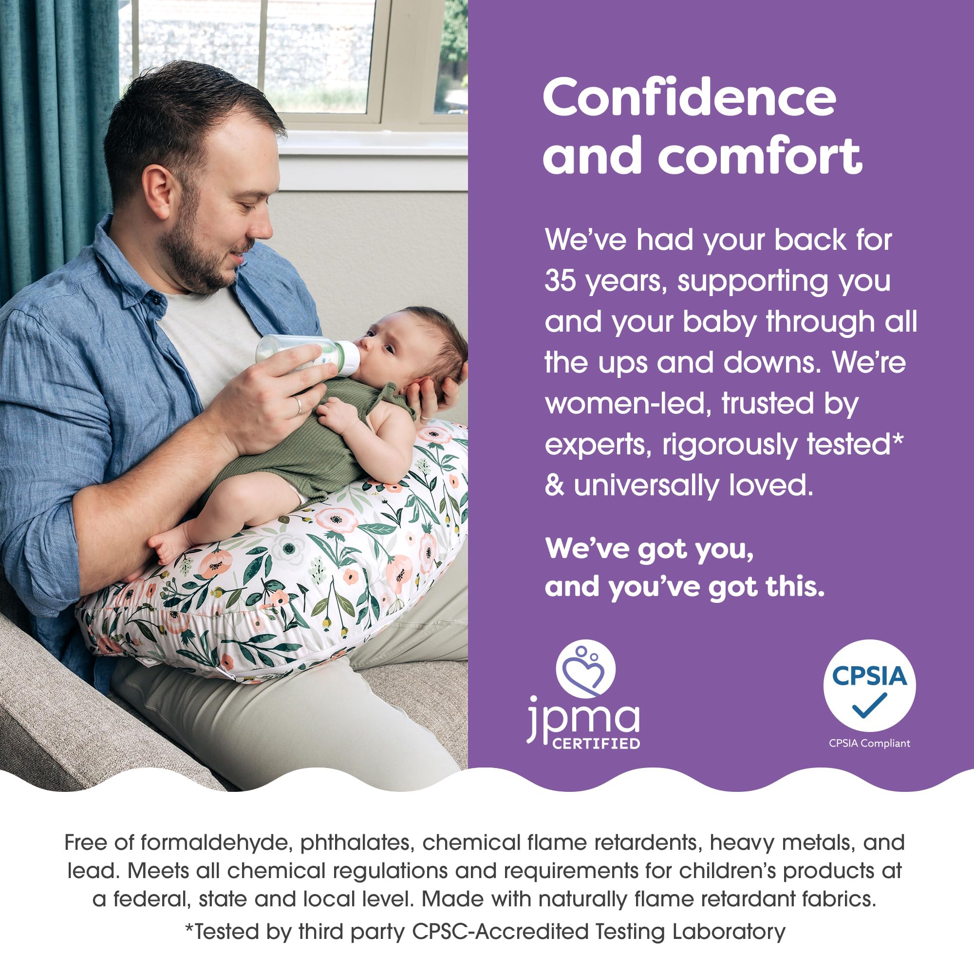 35 Years of Confidence: Better connecting babies and moms since 1989 with breastfeeding pillows, baby carriers and other baby essentials so you can worry less and enjoy more; The first brand verified by the Baby Safety Alliance in the Nursing Pillow category for meeting the highest standards in safety, performance and quality; Meets and exceeds standards for ASTM F3669 Consumer Safety Specification for Nursing Pillows and 16 CFR 1242 safety standard for nursing pillows, so you can have peace of mind
