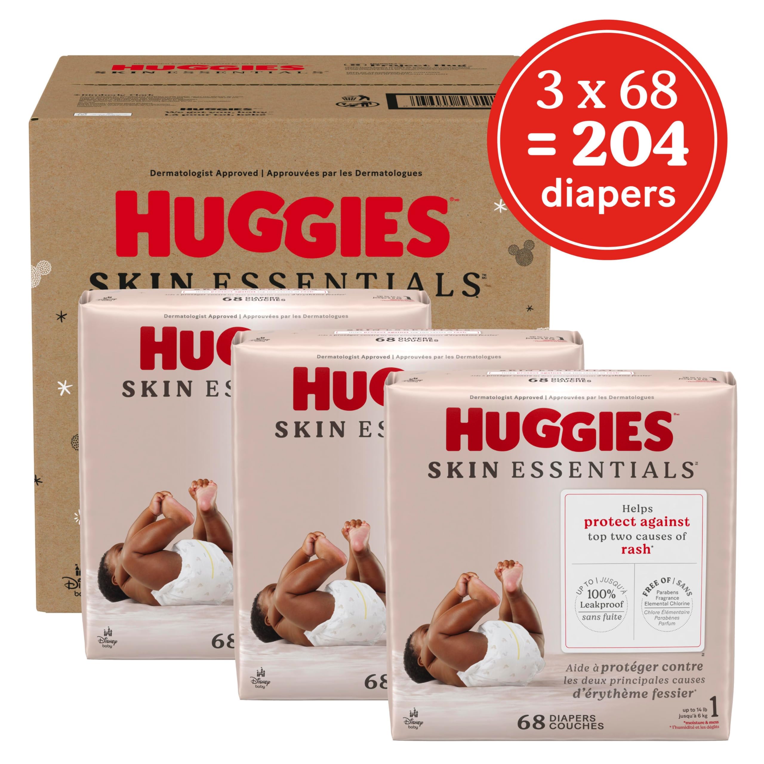Huggies Size 1 Diapers: 204 Huggies Skin Essentials Newborn Diapers (3 Packs of 68), Size 1 (8-14 lbs); packaging may vary