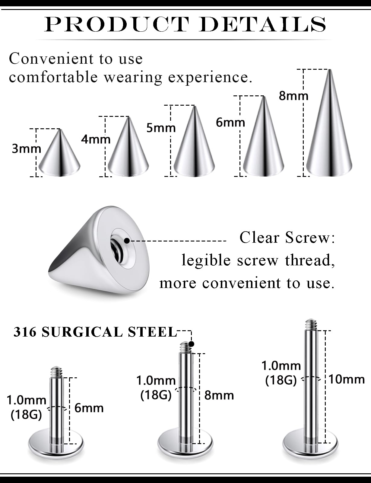 【Perfect size】:Spike lip rings gauge: 18G(1.0mm), bar length:1/4 inch(6mm); 1/4 inch (7mm); 5/16 inch (8mm), top spike: 3mm 4mm 5mm 6mm 8mm, color: silver