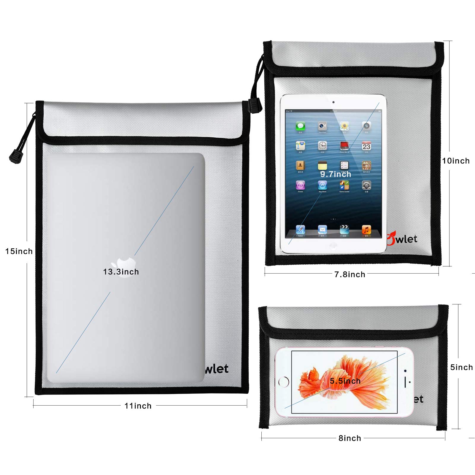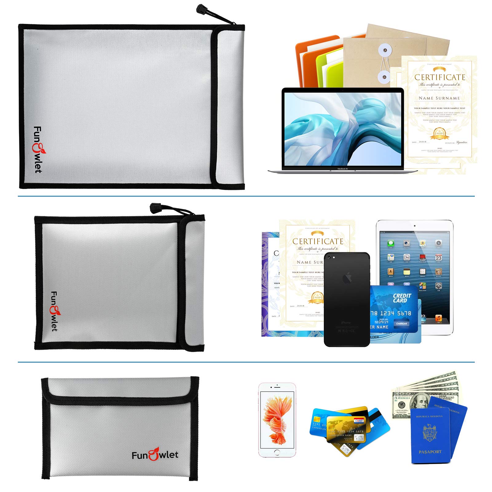 3 Different Sizes for Diverse Demand: The FunOwlet set includes a 15 x 11-inch fireproof document bag, a 10 x 7.8-inch fireproof envelope bag, and an 8 x 5-inch small fireproof wallet bag. With ample capacity and versatile use, these bags can securely store all your valuables, including bank deposits, legal documents, cash, coins, credit cards, letters, precious photos, marriage certificates, passports, and more.